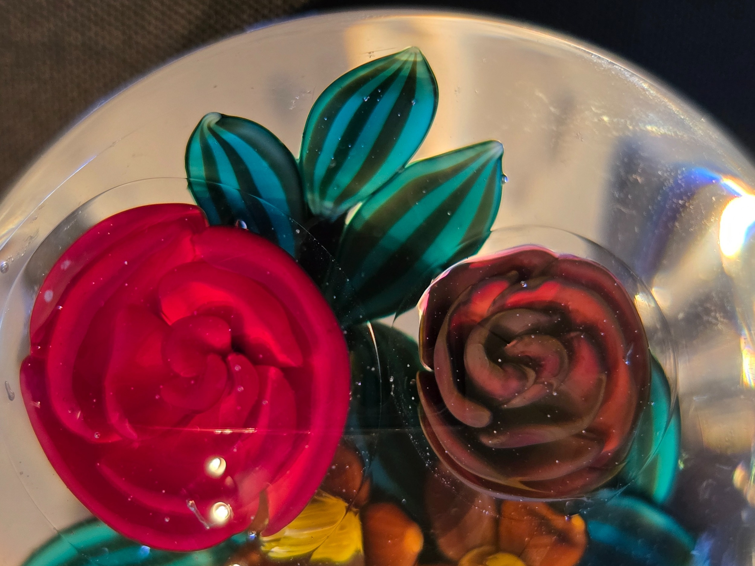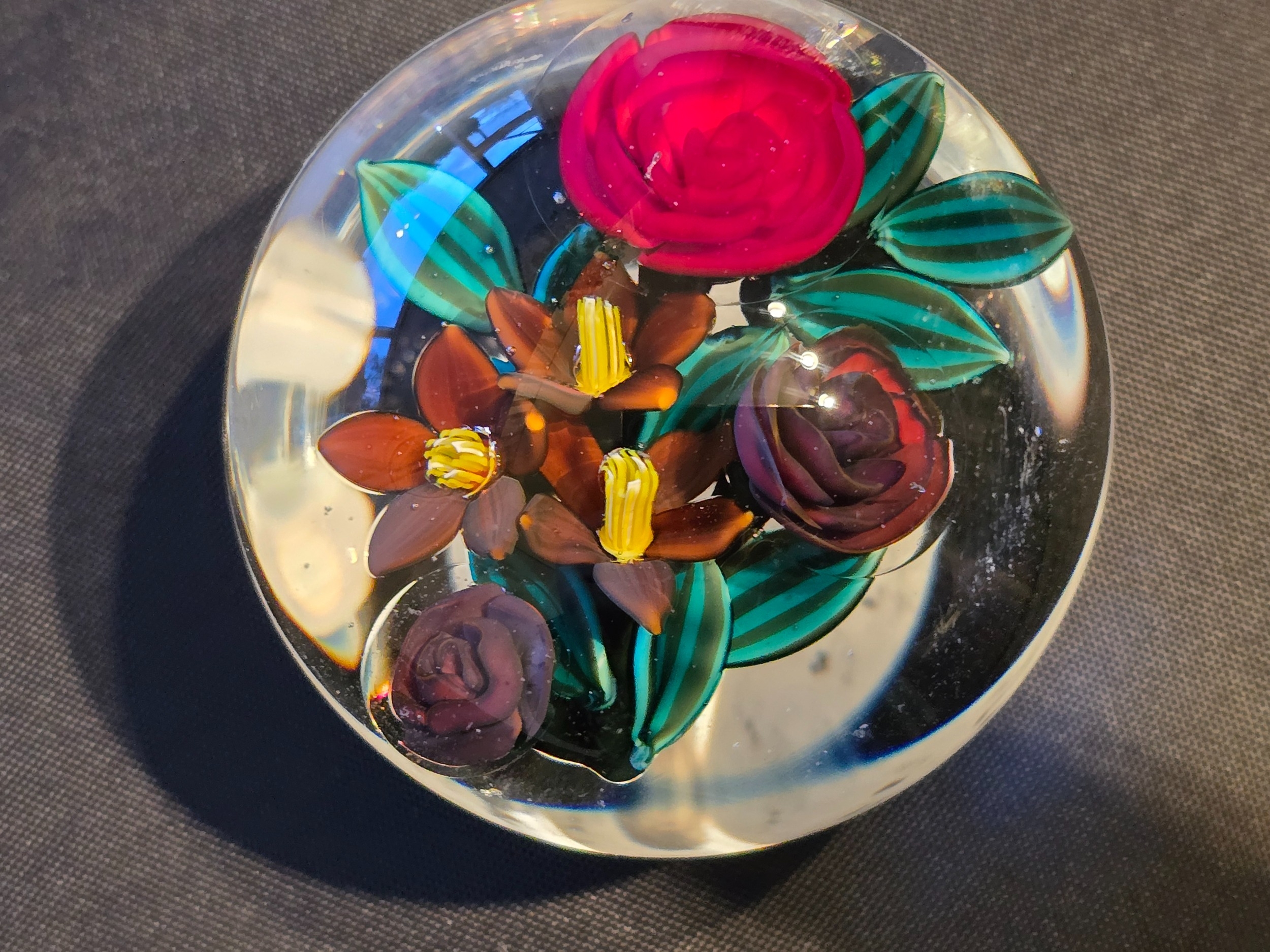Colin Richardson paperweight - Very attractive One-off special bouquet with red rose from Colin, a romantic small paperweight for Birthday, Anniversary or Valentines Day. Made 2015. Excellent condition. Diam: 56mm or 2 3/16th ins