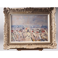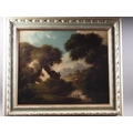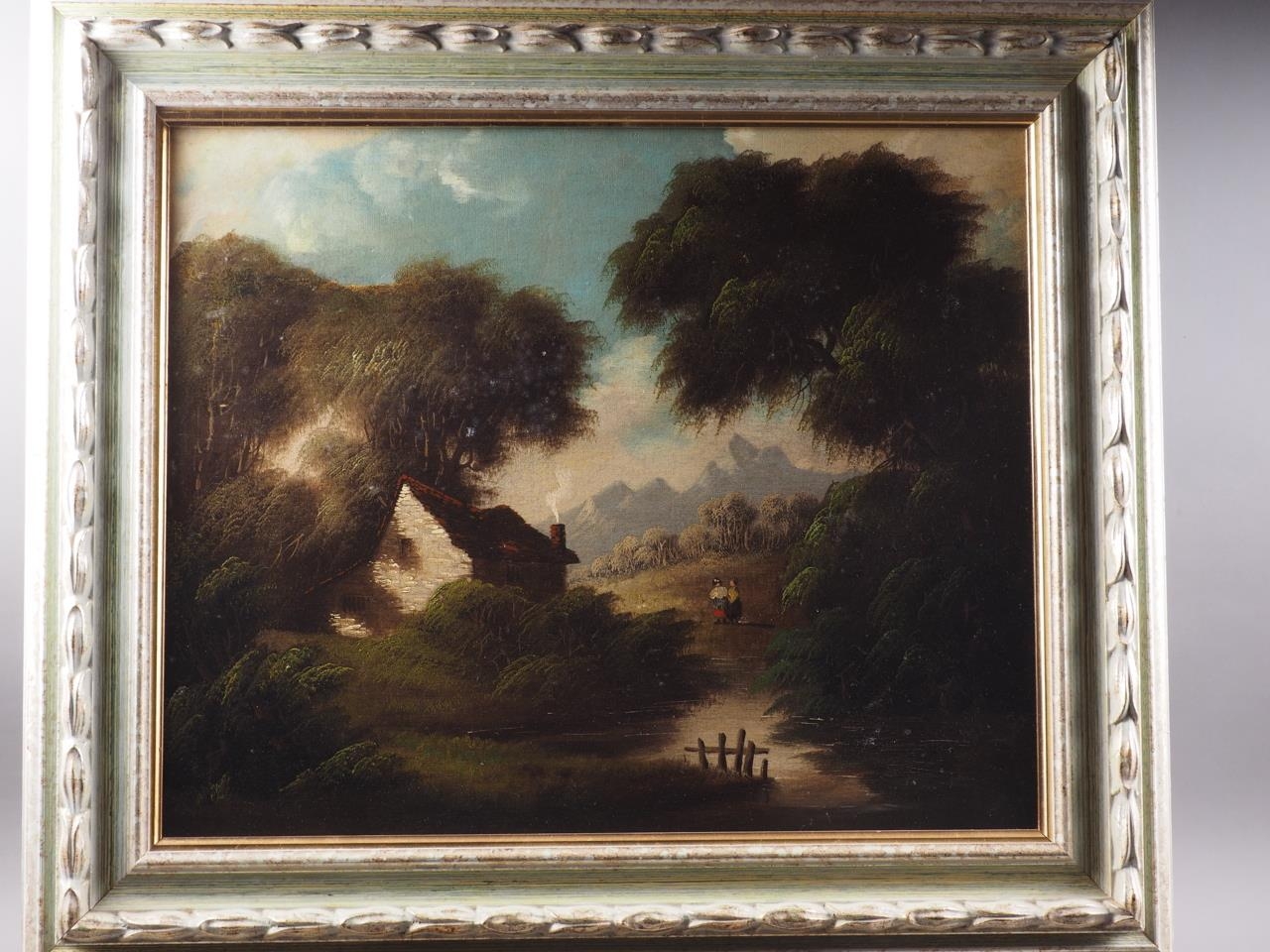 Late 19th century Naive School: oil on canvas, landscape with figures and cottage, 18" x 22", in gilt decorated frame (cleaned and relined)