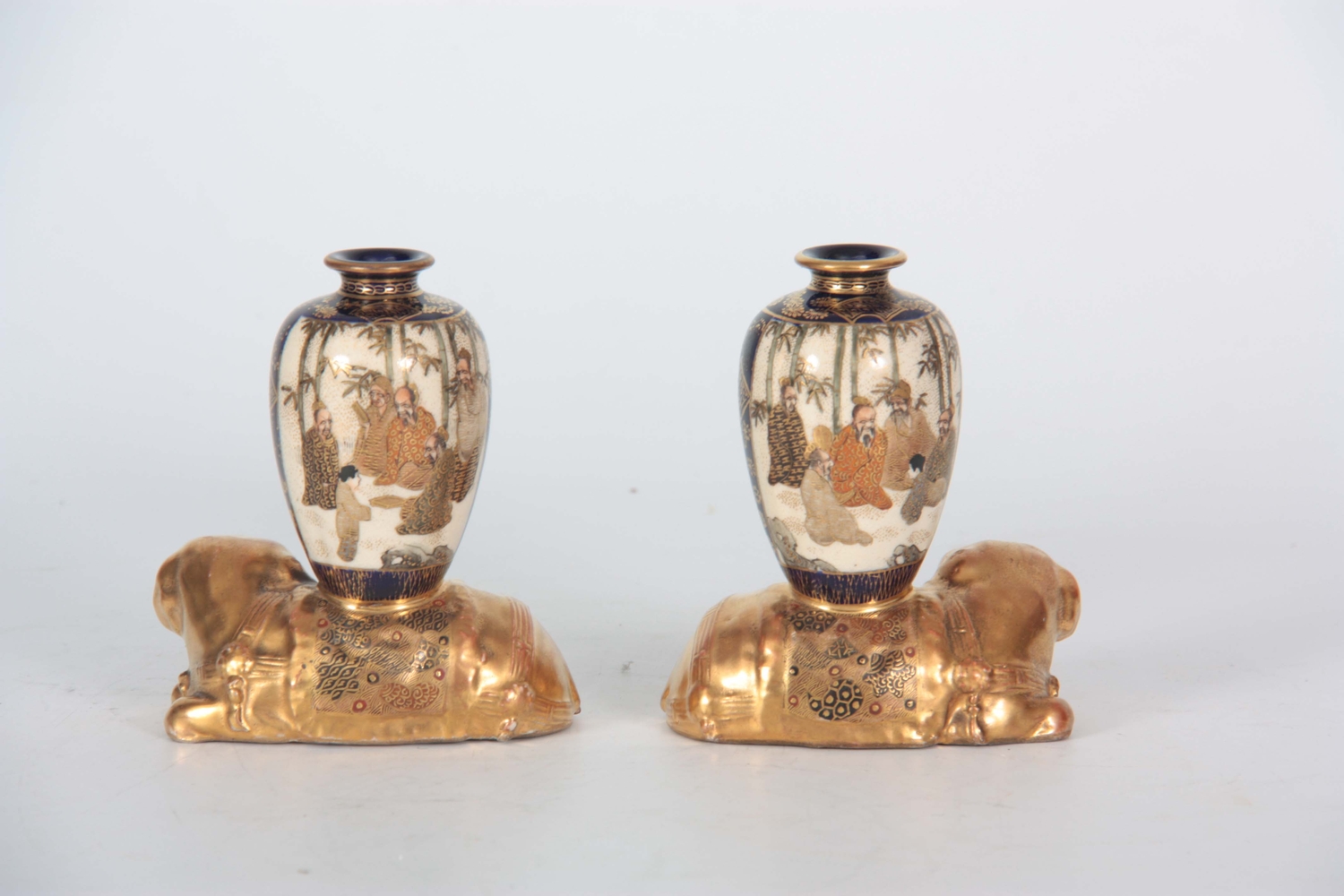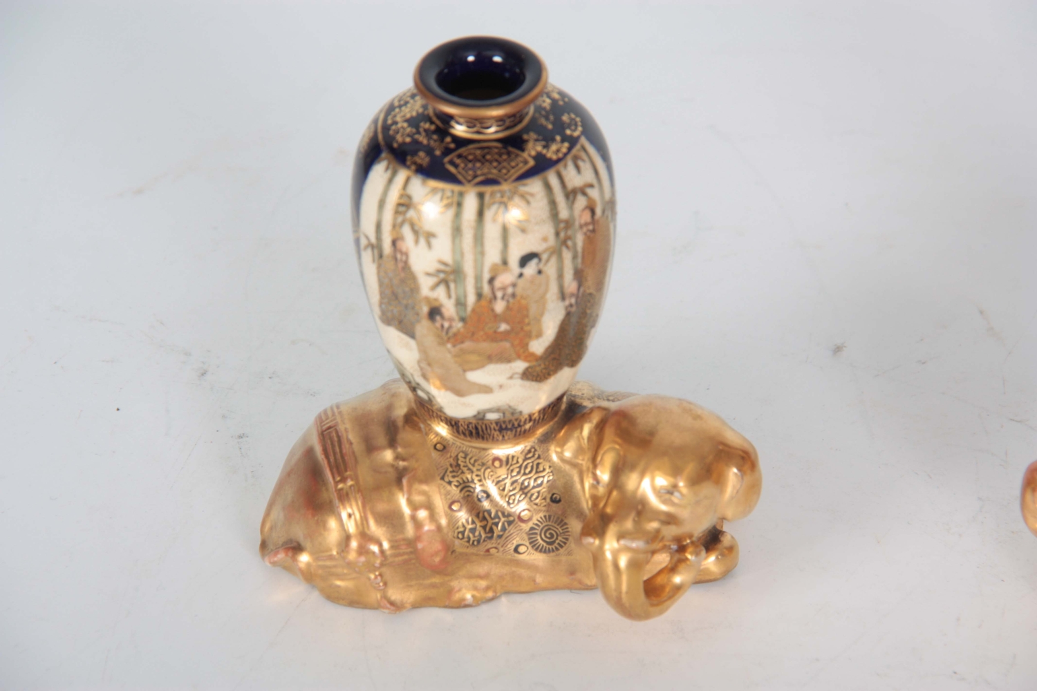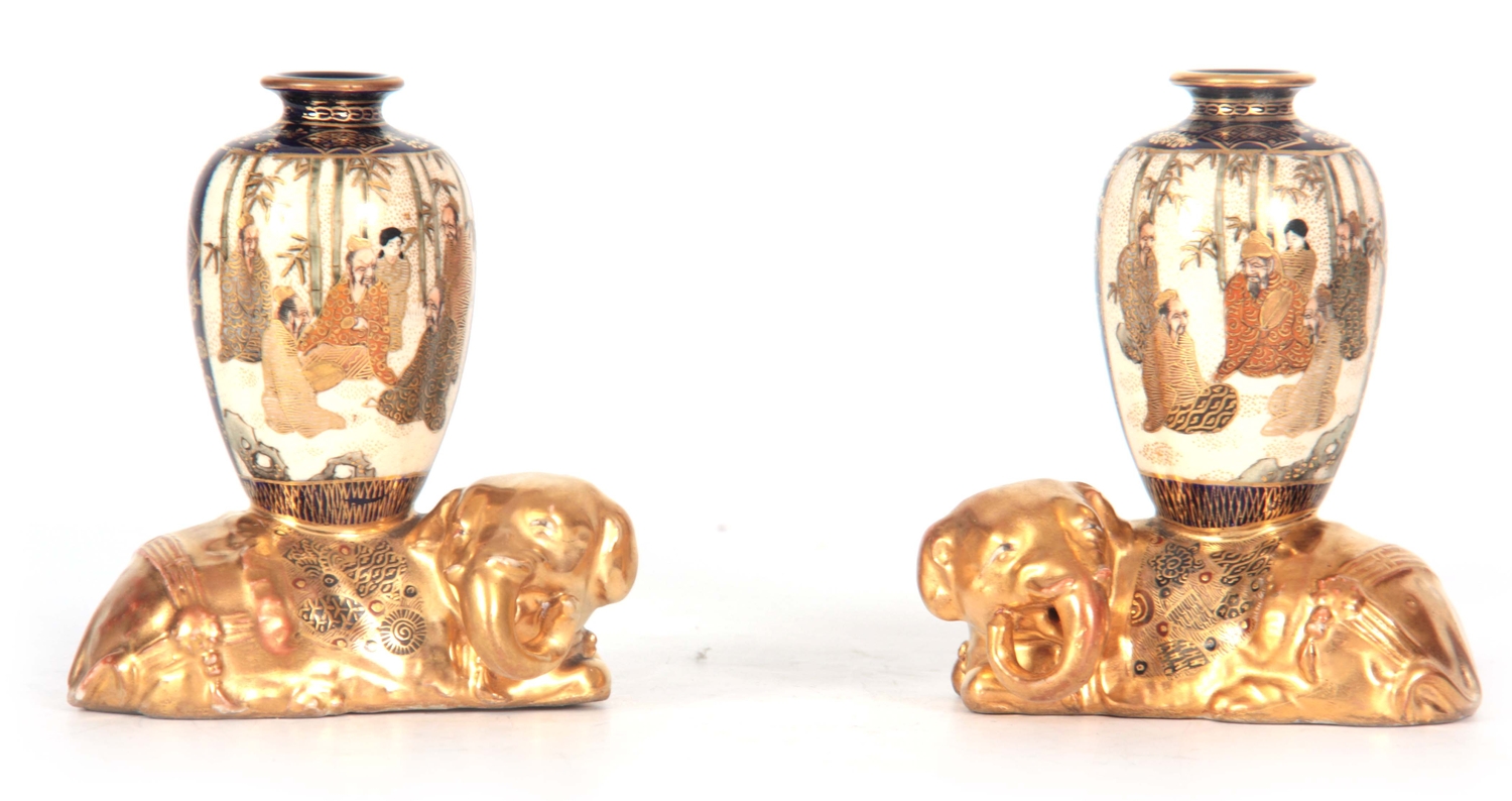 A PAIR OF JAPANESE MEIJI PERIOD FIGURAL VASES each modelled atop a gilt seated elephant with decorated saddlecloth supporting an ovoid vase decorated with characters amongst trees 12cm high