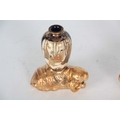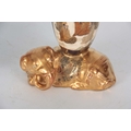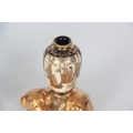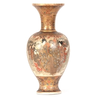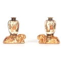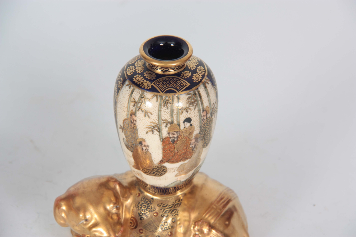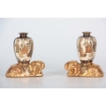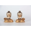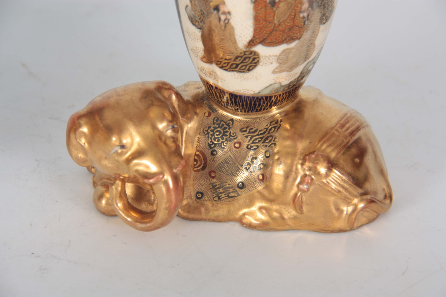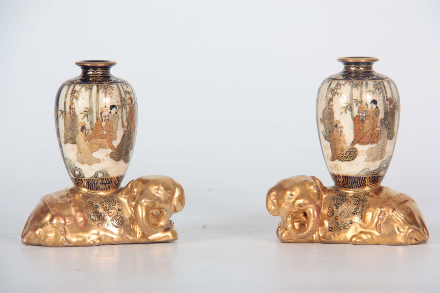 A PAIR OF JAPANESE MEIJI PERIOD FIGURAL VASES each modelled atop a gilt seated elephant with decorated saddlecloth supporting an ovoid vase decorated with characters amongst trees 12cm high