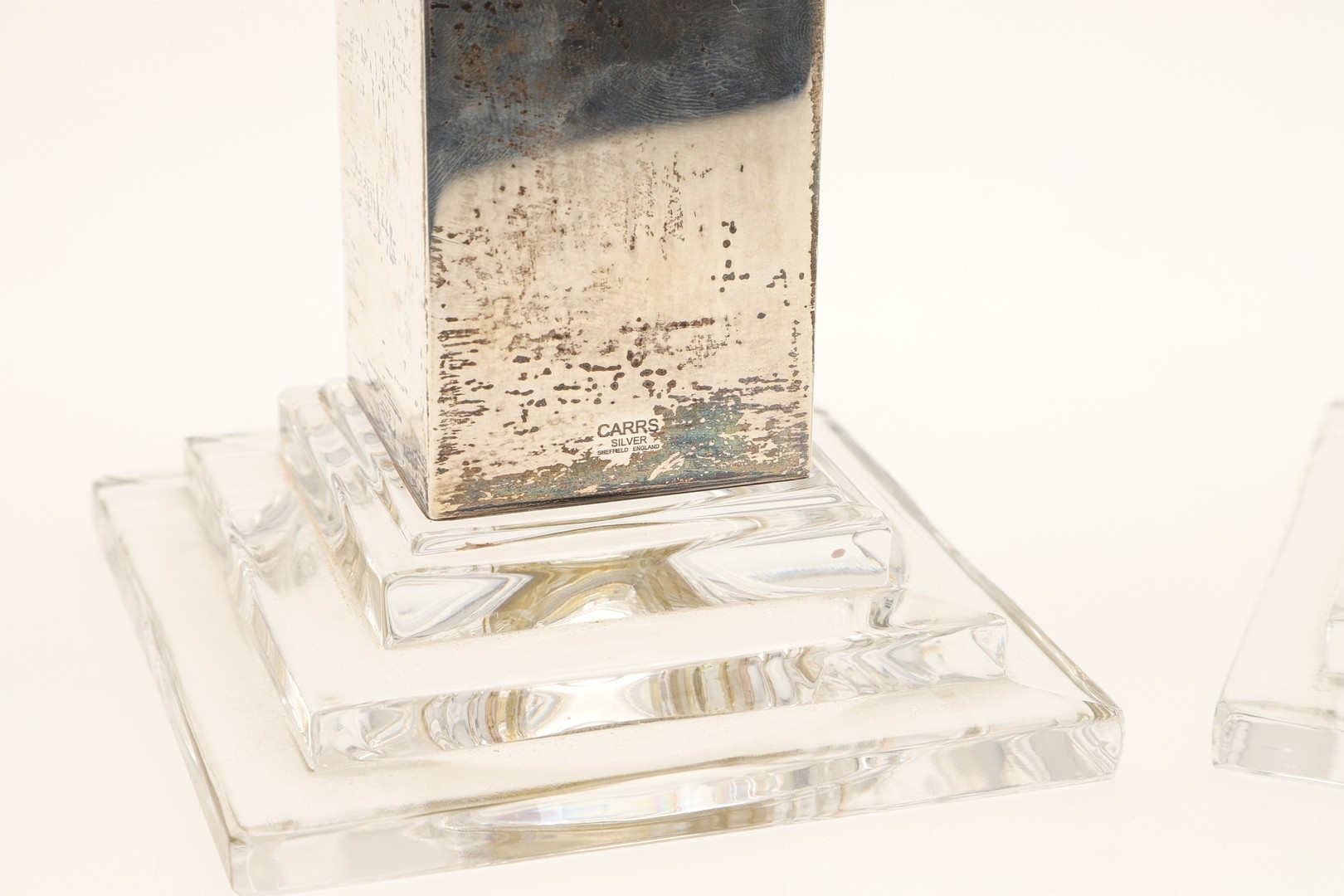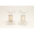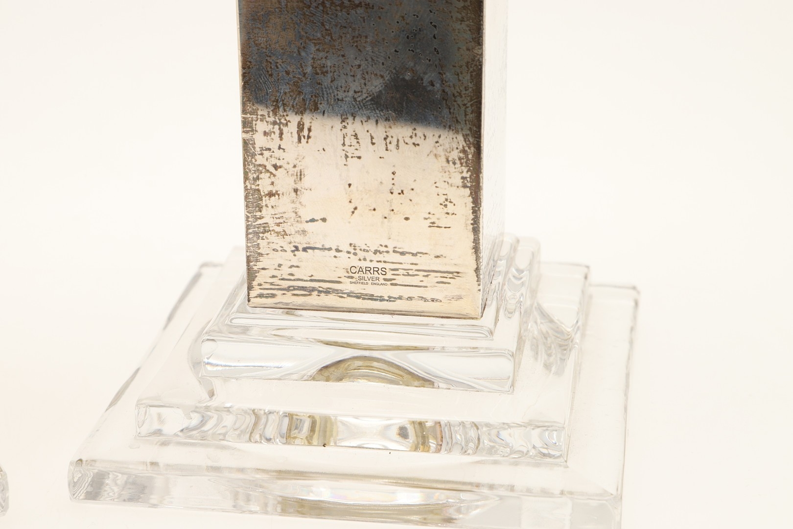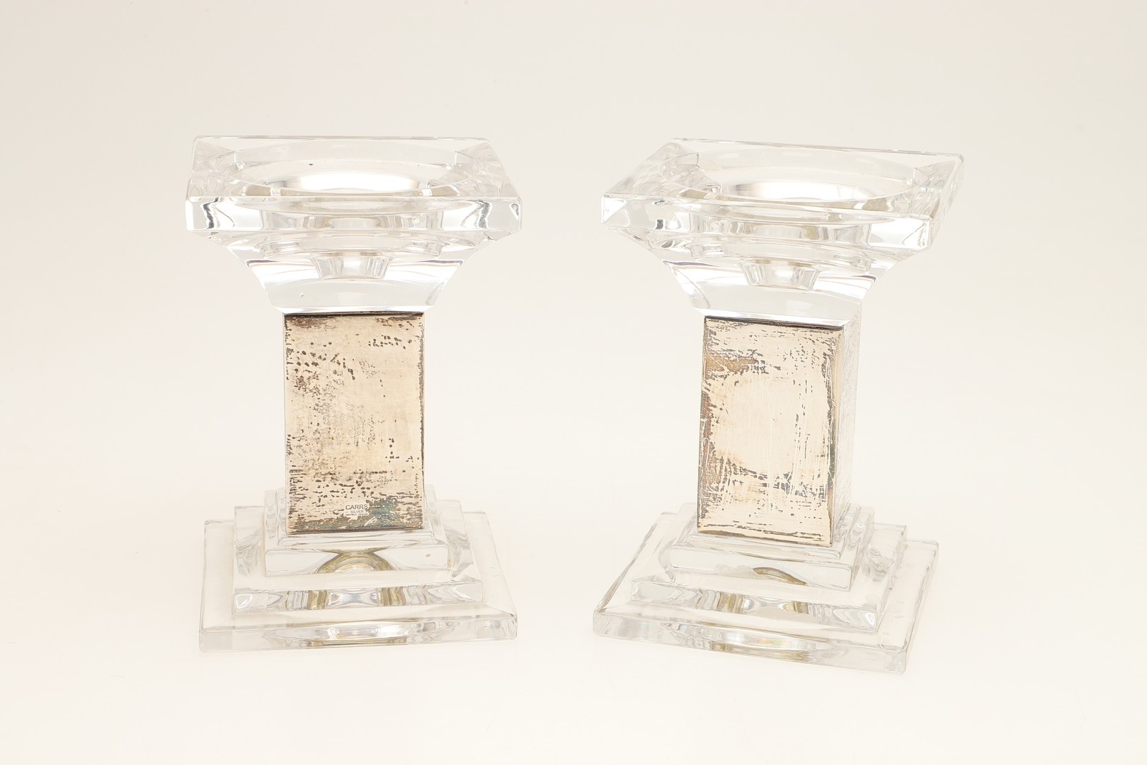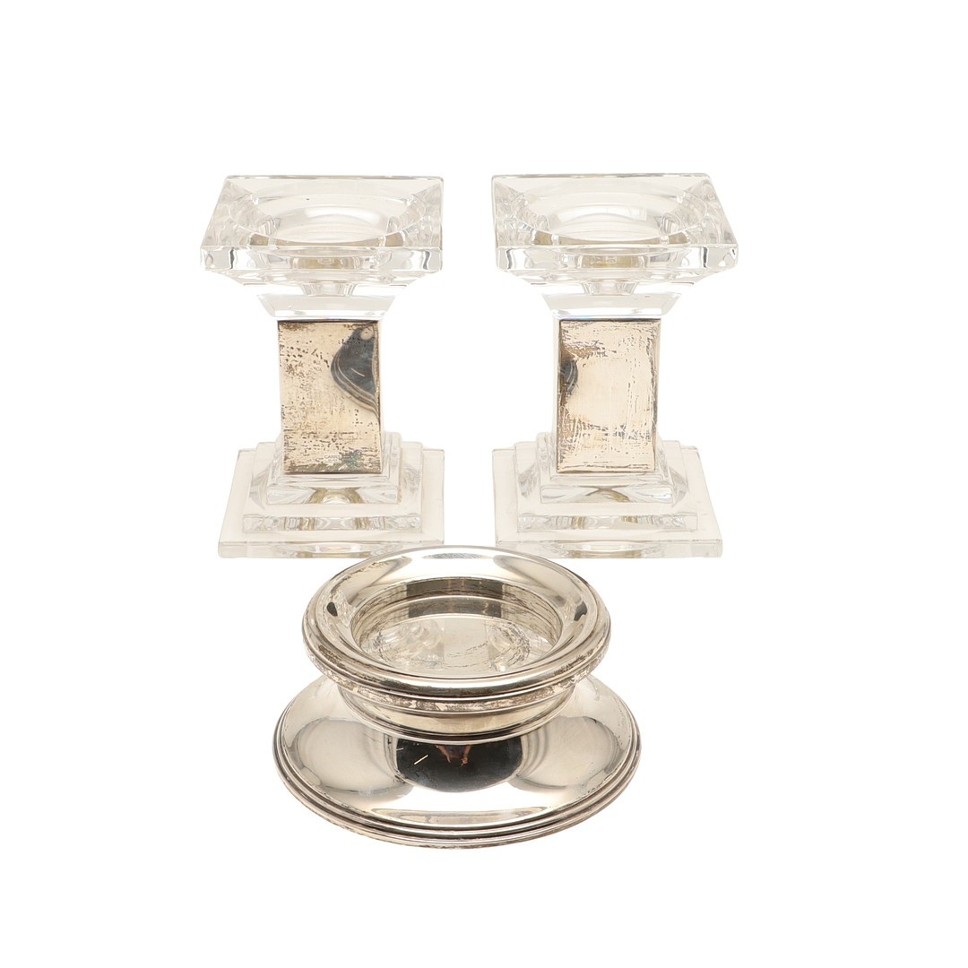 A PAIR OF CARR'S OF SHEFFIELD GLASS AND SILVER FACED CANDLESTICKS AND A SILVER CANDLE STAND. The pair of square stepped pedestal form, Height 14cm x Diameter 9.5cm, the other filled silver candle holder of rounded form (Height 5.5cm x Diameter 13cm). All hallmarked Carr's of Sheffield Ltd, Sheffield, 2005. (3).