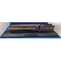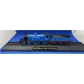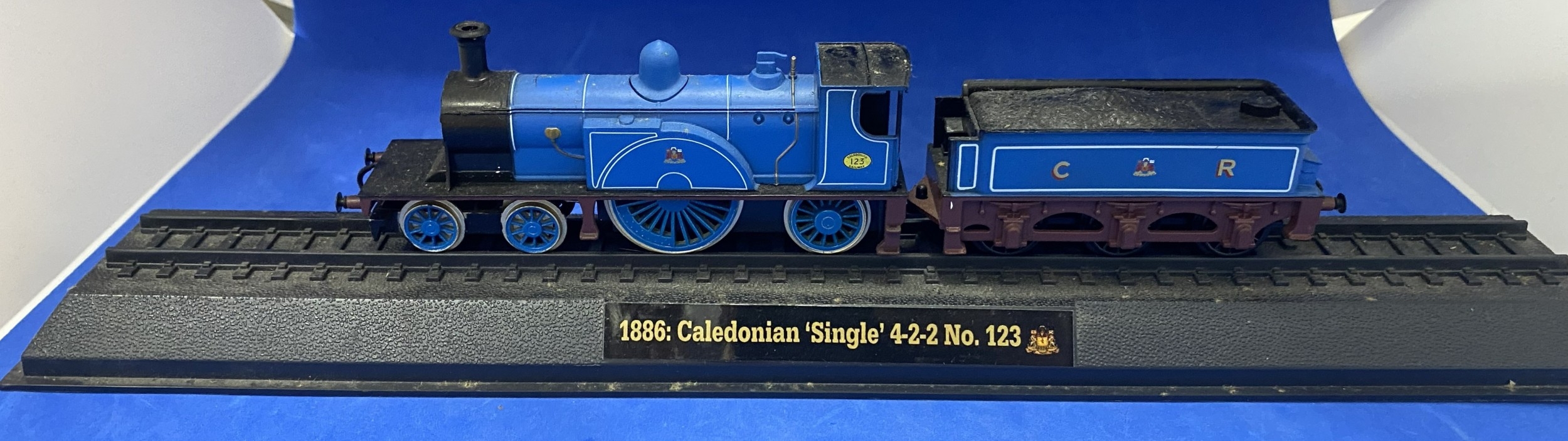 1886: Caledonian 'Single' 4-2-2 No. 123, train model on rail base.