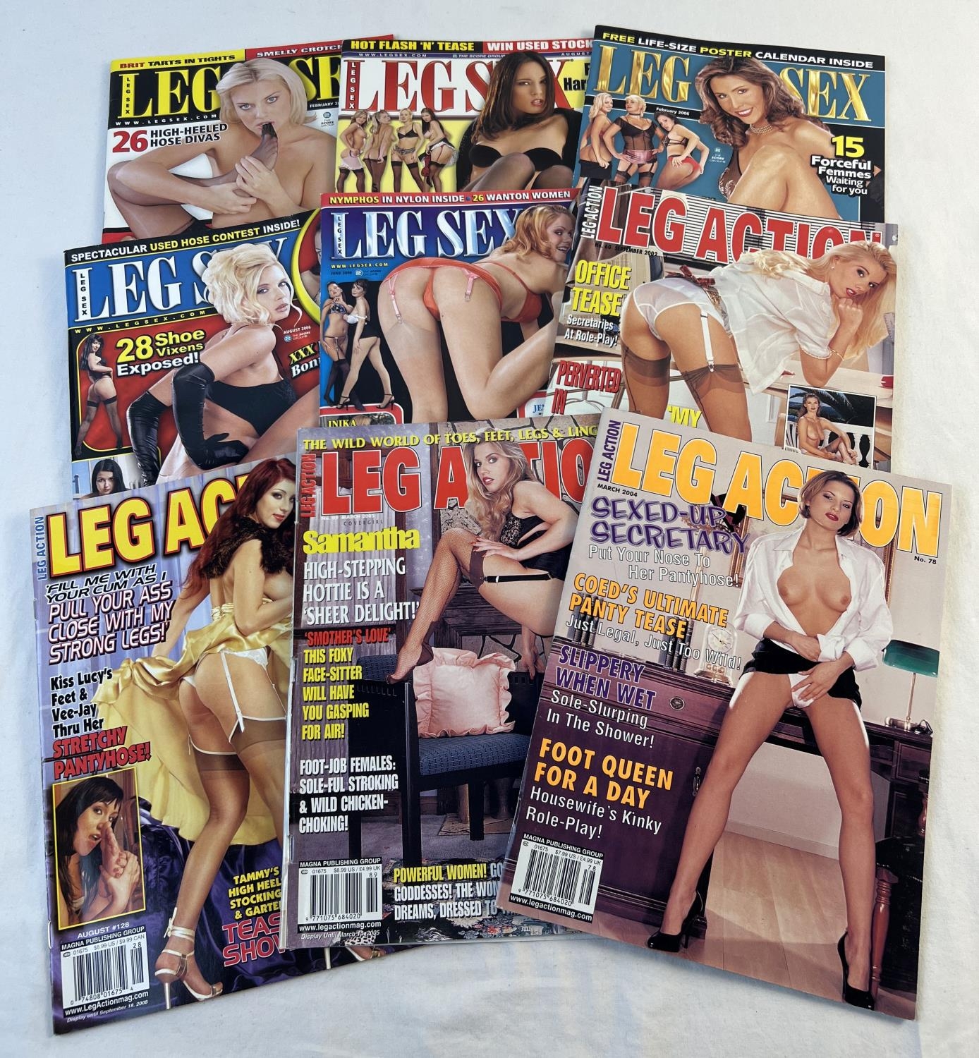 9 assorted Leg Interest adult erotic magazines from the 2000's. 5 issues of Leg Sex from The Score Group together with 4 issues of Leg Action.