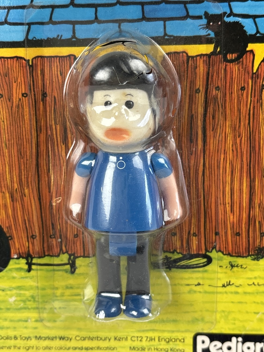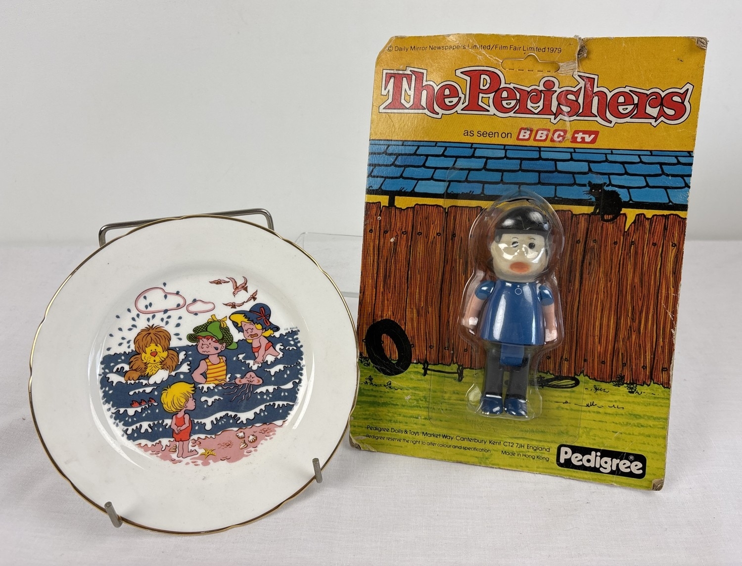 Carded & sealed The Perishers 4" figure of Maisie from Pedigree Toys, 1979, together with a 6.5" ceramic The Perishers plate from Oakley China.