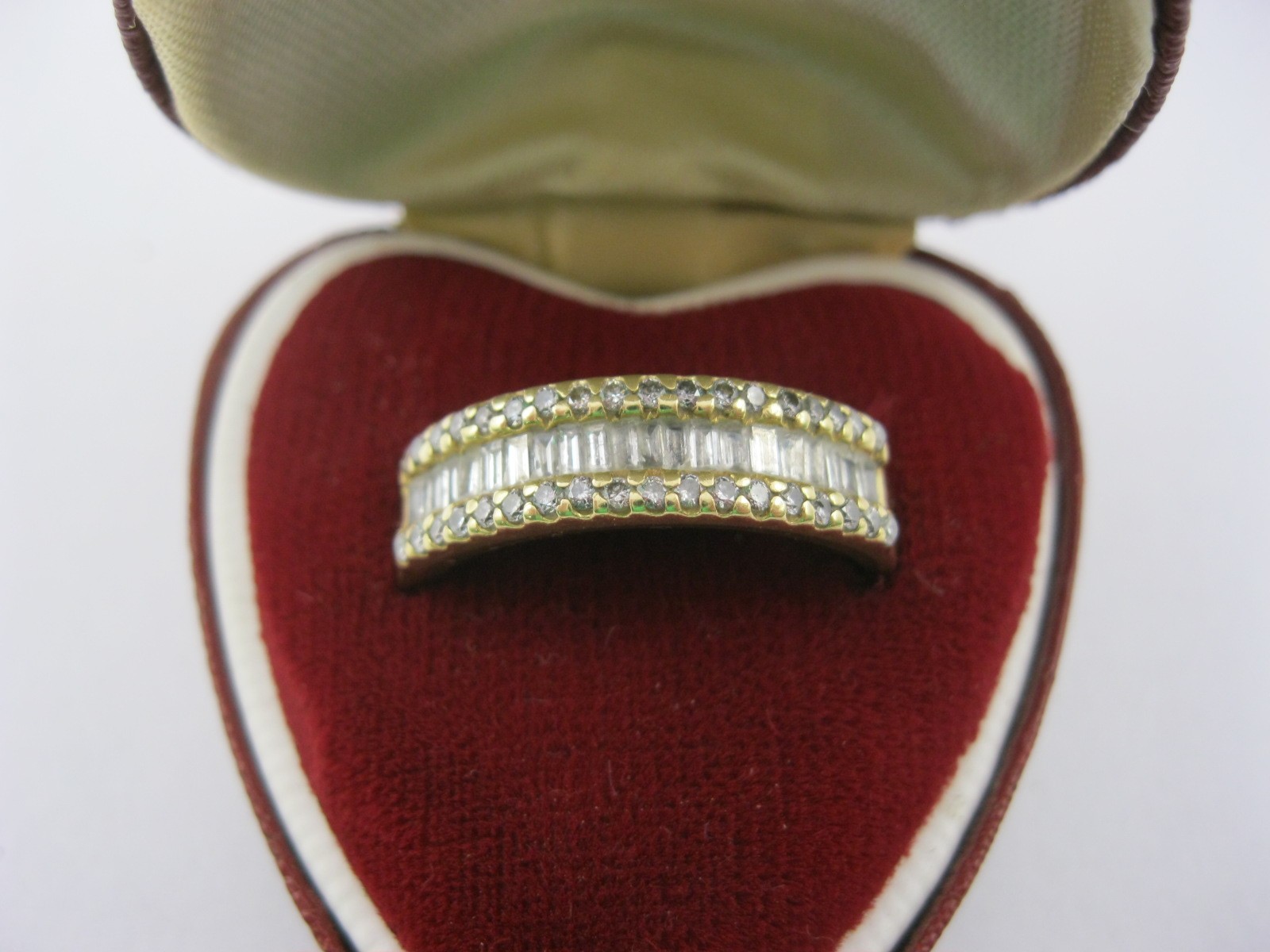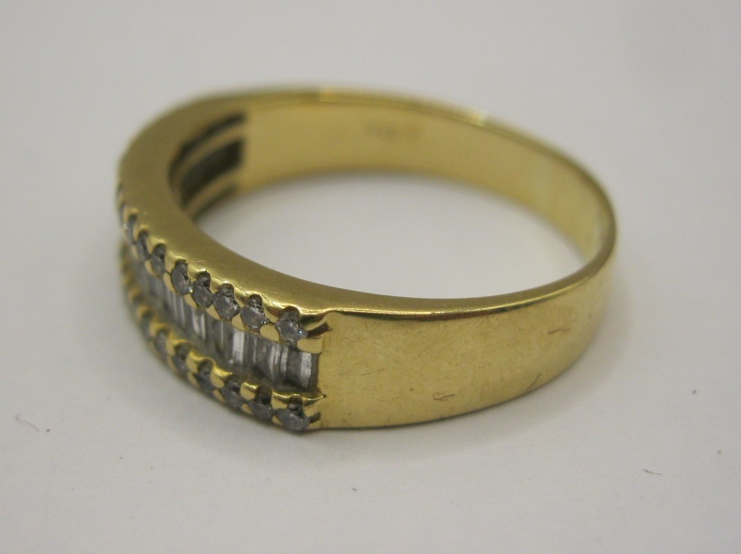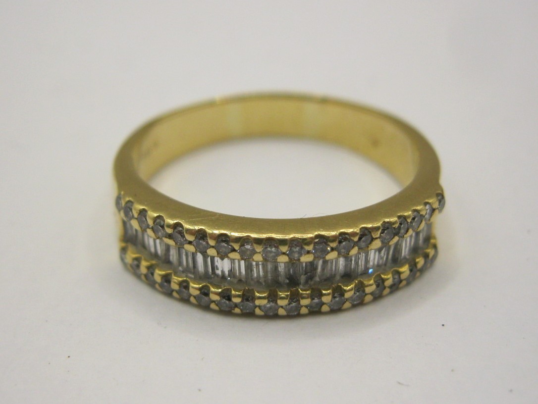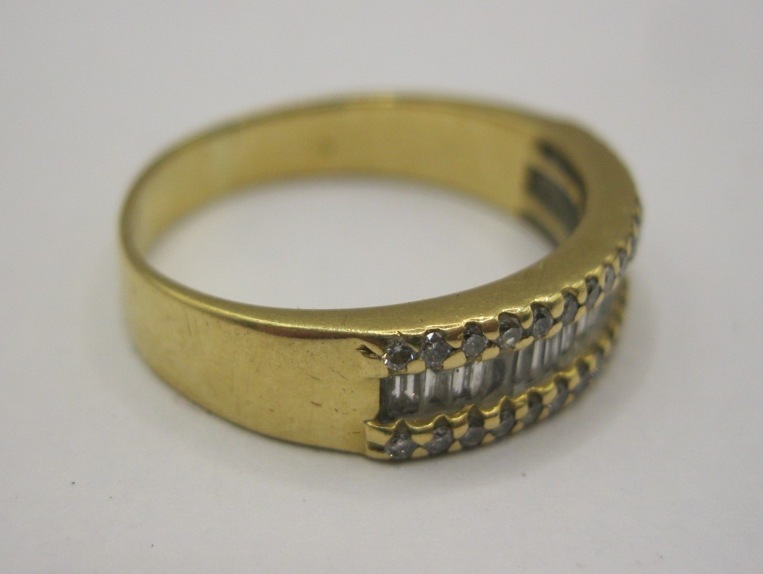 An 18 carat gold ring with a distinctive setting of twenty baguette cut diamonds between two rows of small brilliant cut diamonds. Gross weight of ring approx. 5.4g, ring size T, stamped 750 partially distinctly. With a red heart-shape ring box.