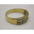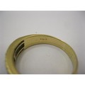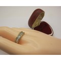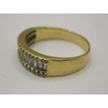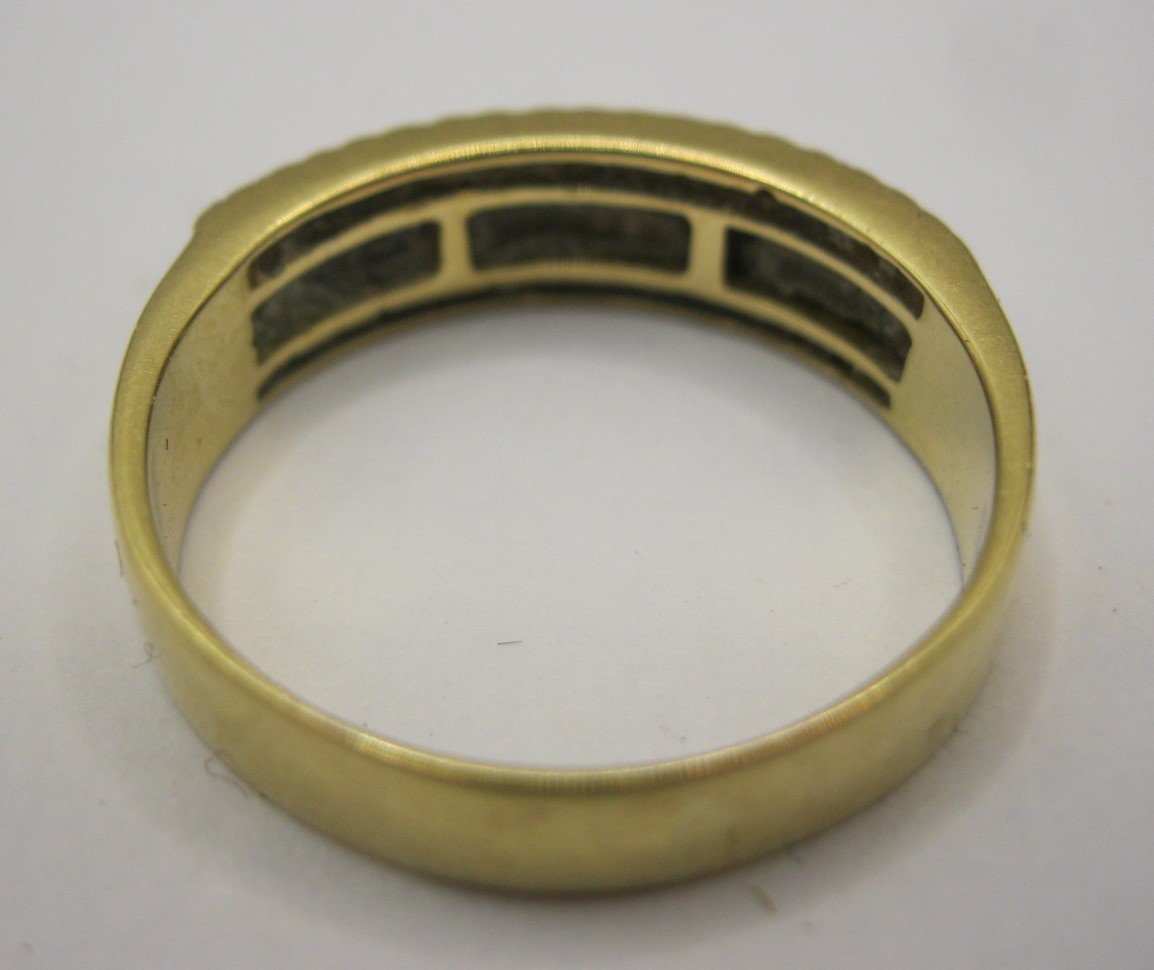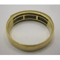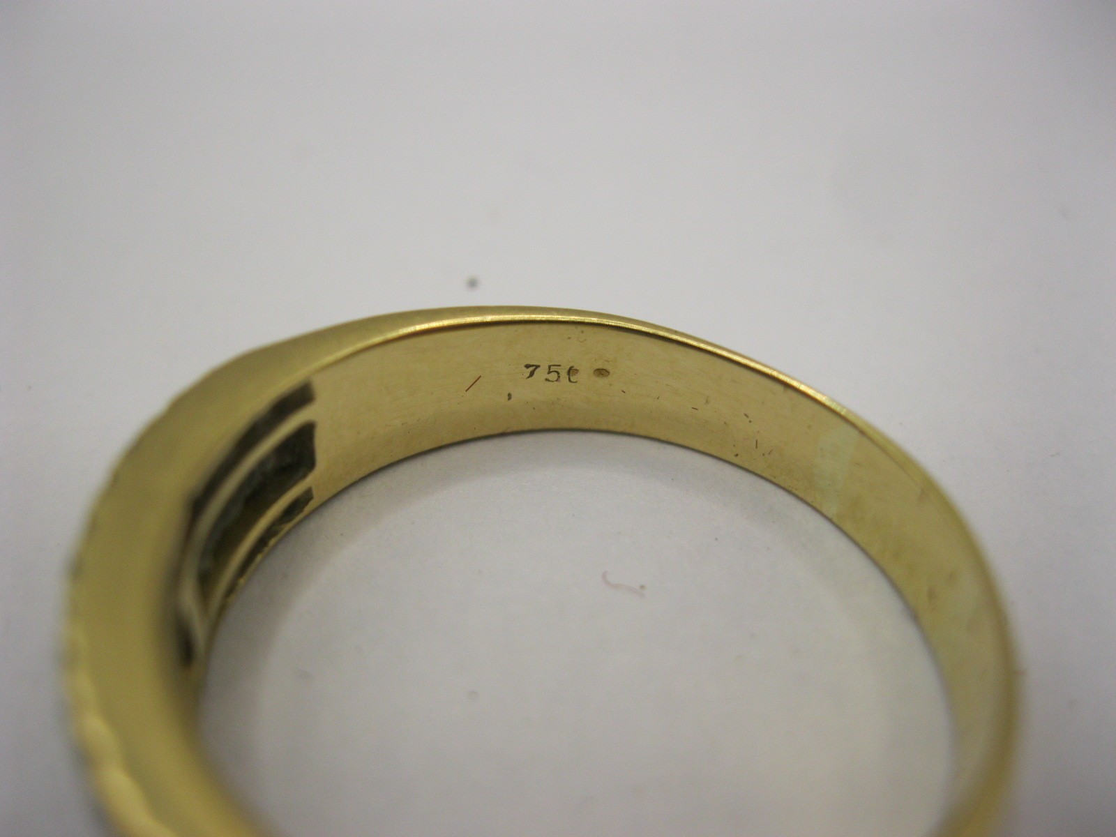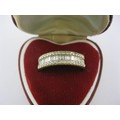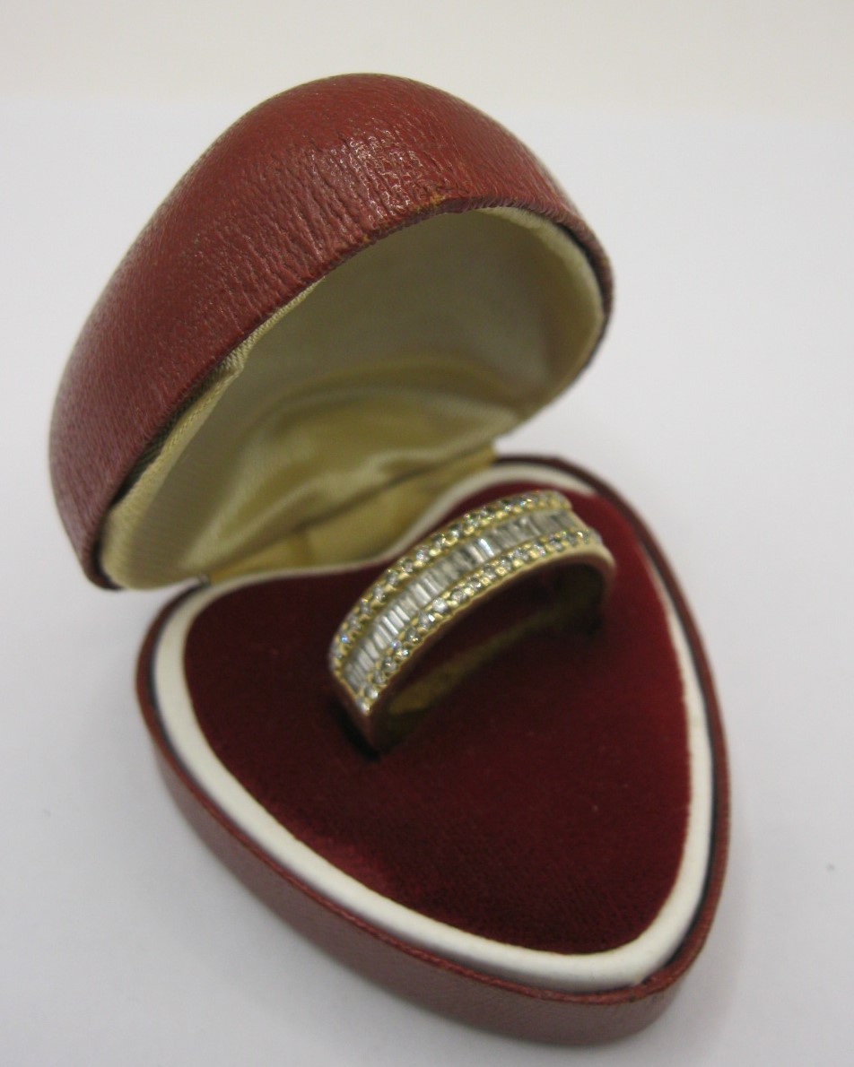 An 18 carat gold ring with a distinctive setting of twenty baguette cut diamonds between two rows of small brilliant cut diamonds. Gross weight of ring approx. 5.4g, ring size T, stamped 750 partially distinctly. With a red heart-shape ring box.