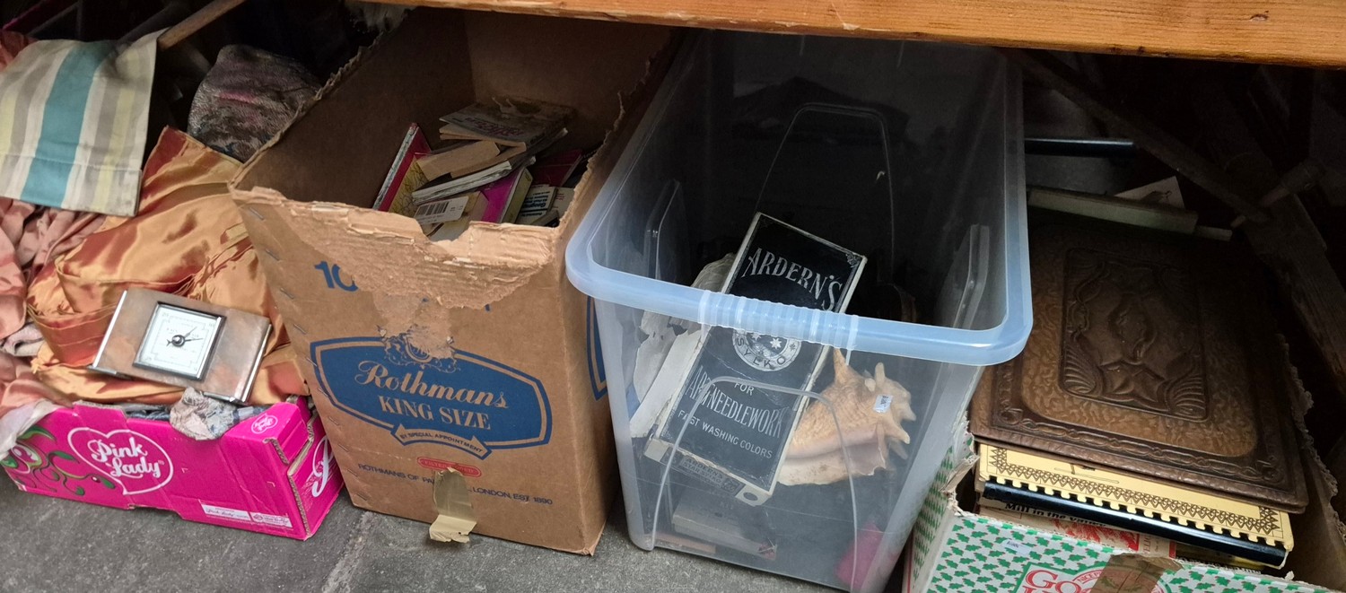 4 boxes of mixed items including fabric, books, bric a brac etc
