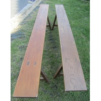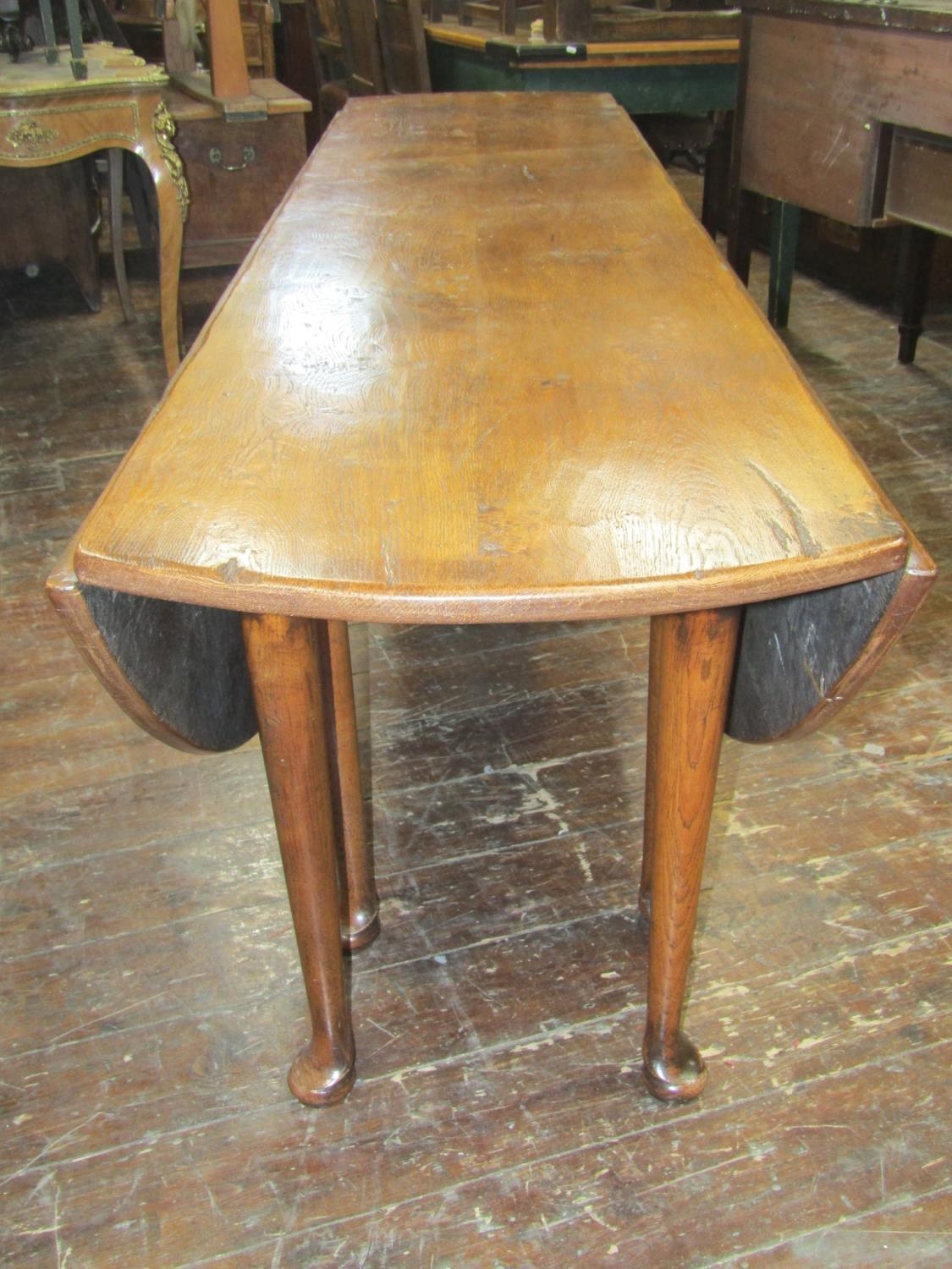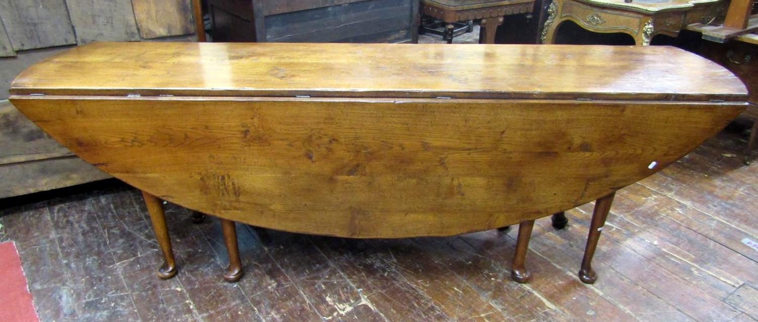 A high quality oak wake table, mid 20th-century in an 18th century manner, the well figured top raised on eight pad feet, each side with double gate action, to seat 8/10, 225cm long x 58cm wide when closed, 150cm wide fully open