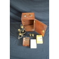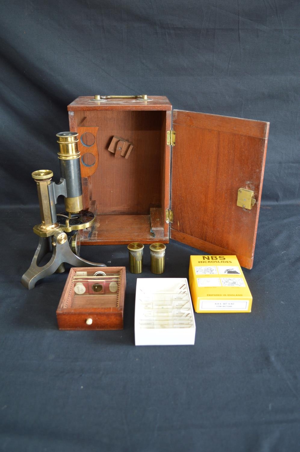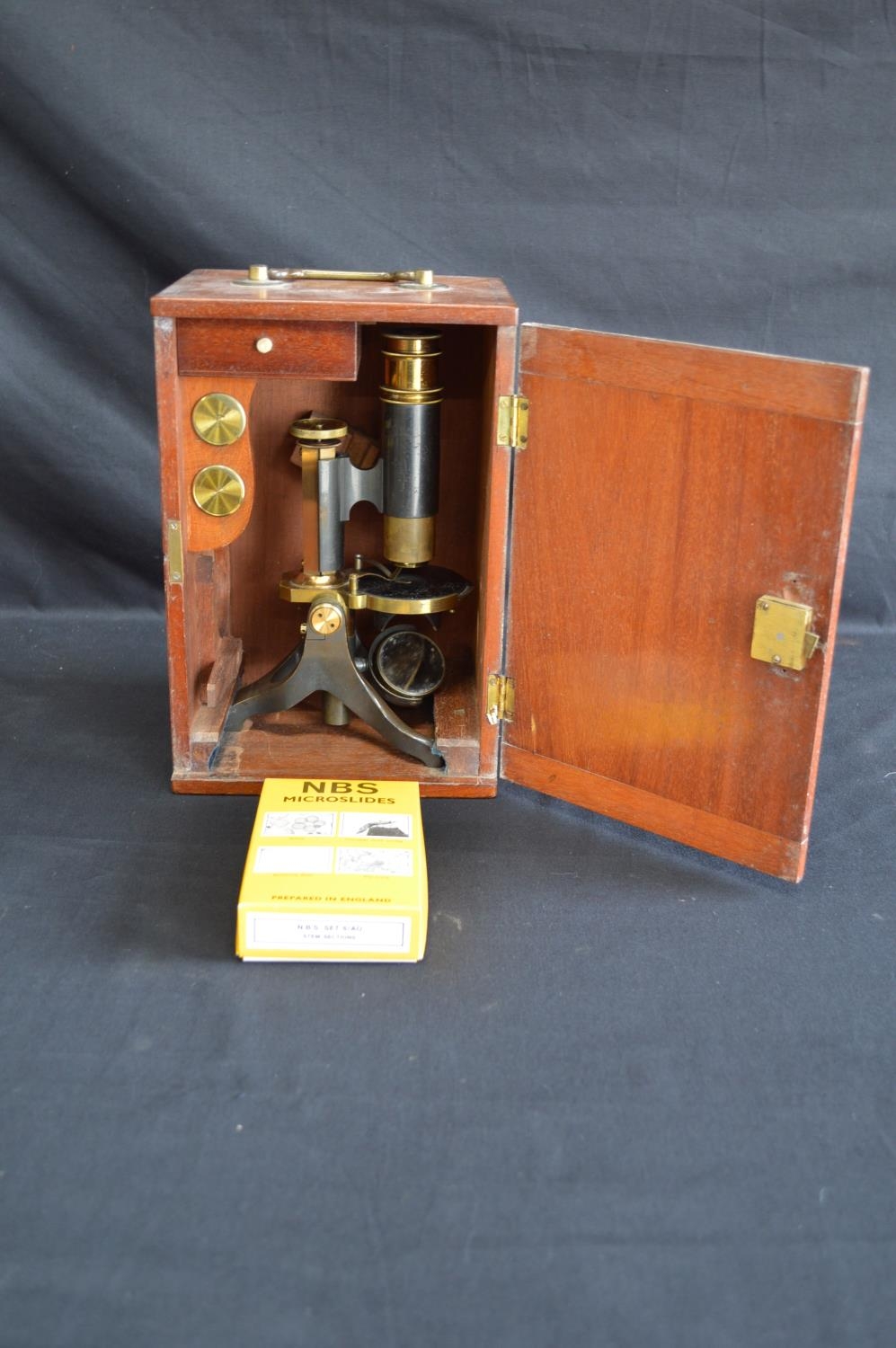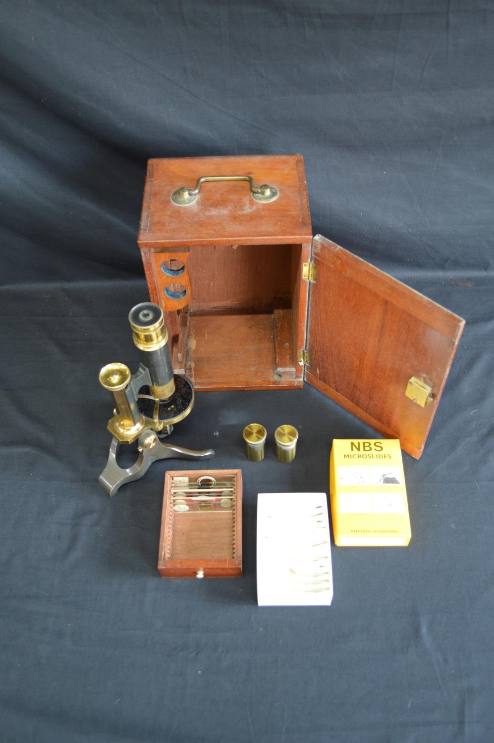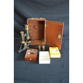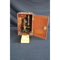 20th century brass microscope marked EP Quinn, Manchester, housed in a mahogany case with top carrying handle - 24cm tall