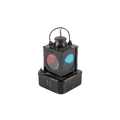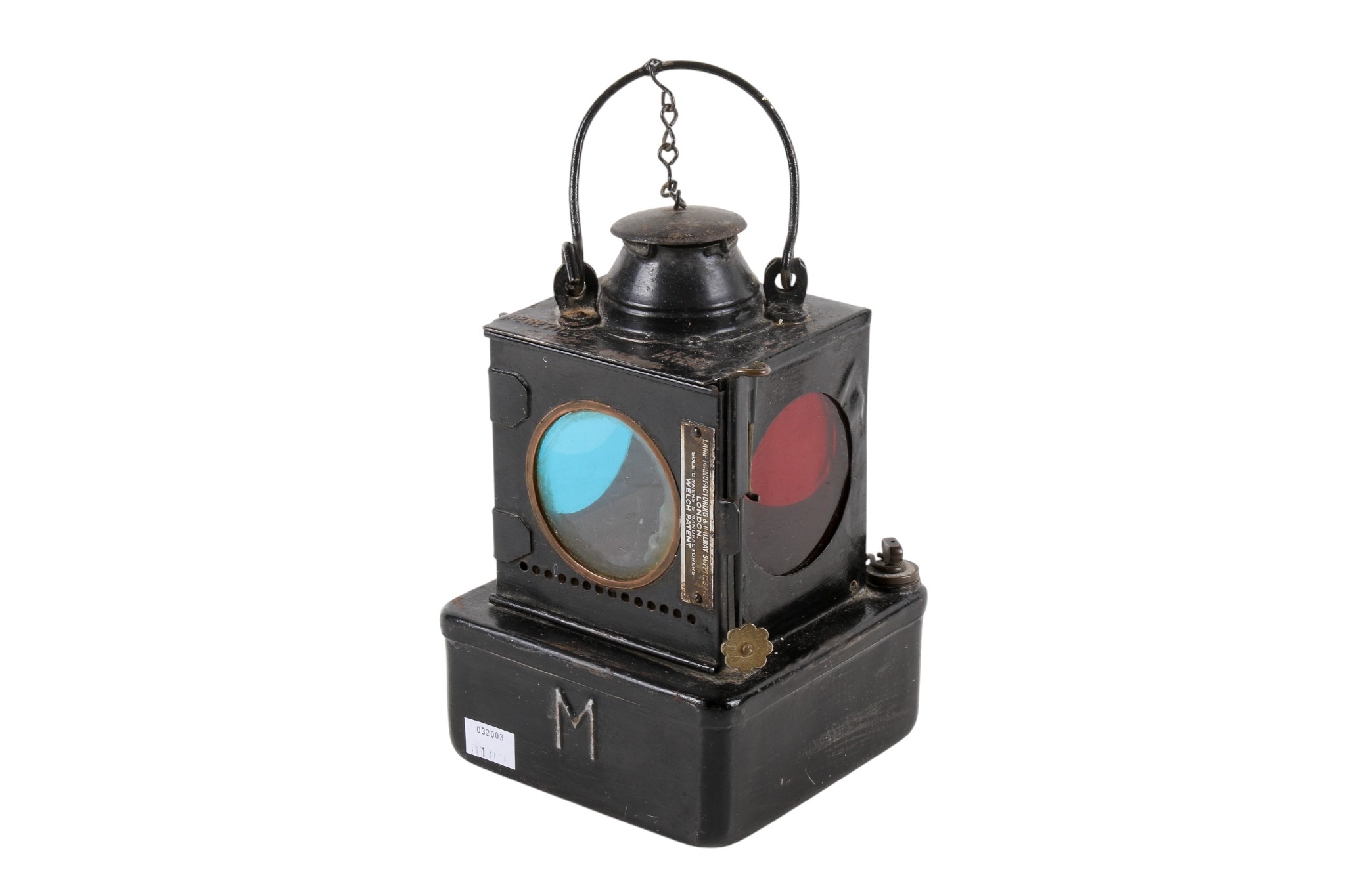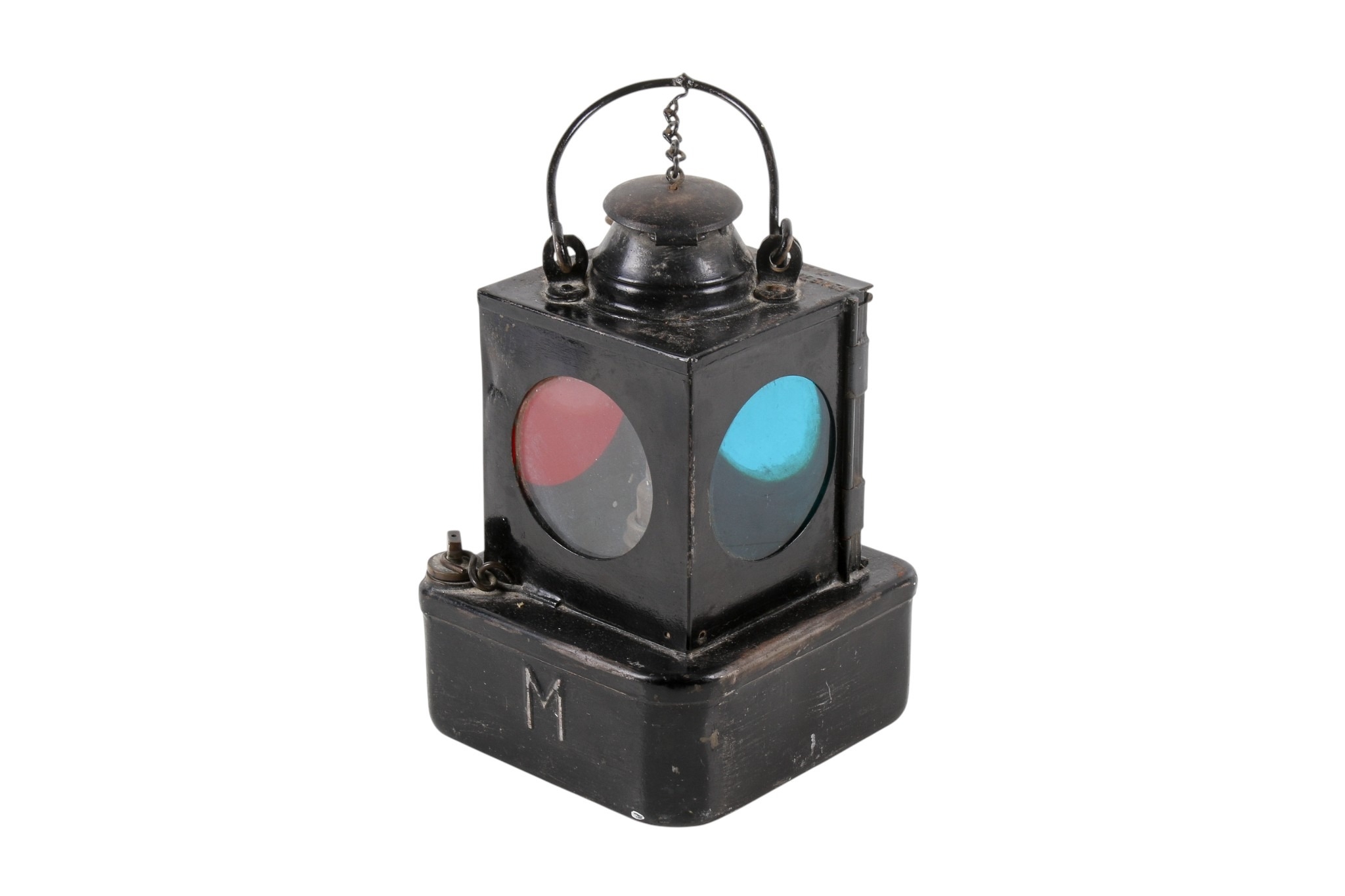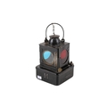 A vintage railway oil lamp. With three coloured glass round windows, black finish, marked 'BR(E)', registration number 711205, Welch patent, H23.5cm (without handle).