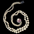 2-ROW SOUTH SEA PEARL NECKLACE, with ruby and diamond clasp. The 2-row cultured south sea pearl necklace, with pearls graduated in size from 9.46 - 3 mm. The clasp set with rubies and a cultured pearl. L. 42 cm. 34.3 grams.