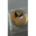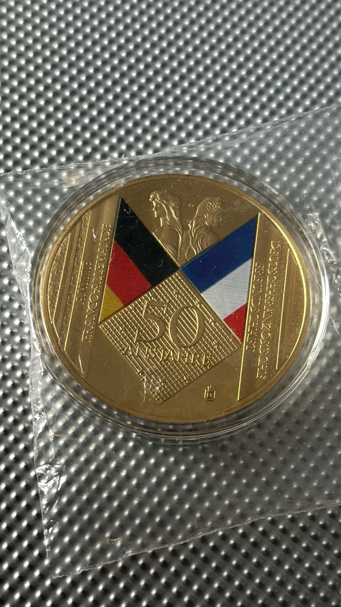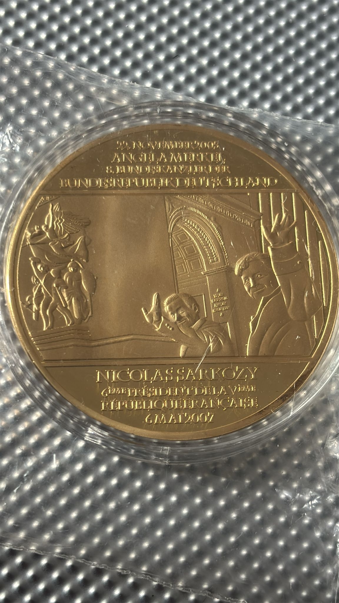 Franco–German Commemorative Medal – Merkel & Sarkozy 50 Years Cooperation Large modern commemorative medal celebrating Franco–German relations, featuring portraits of Angela Merkel and Nicolas Sarkozy with national flags and “50 Jahre” design. Gilt finish with strong visual appeal. A display-focused historical piece.