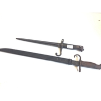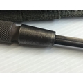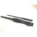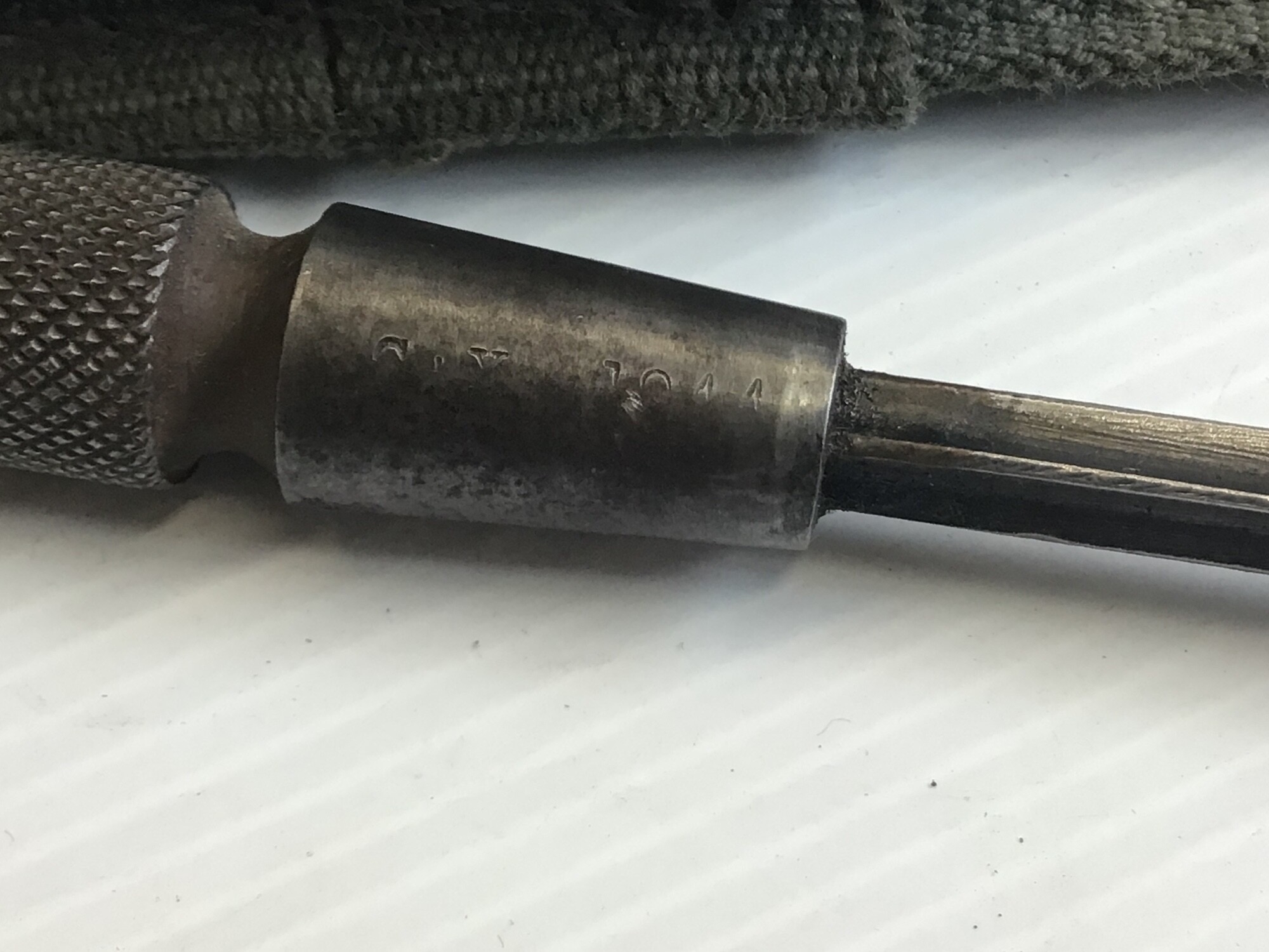 A rare D Day Allied Forces. label emergency issue modified stick fighting knife . With stamp marks and 1944. Engine turned grip steel scabbard. and green cloth belt hanger.