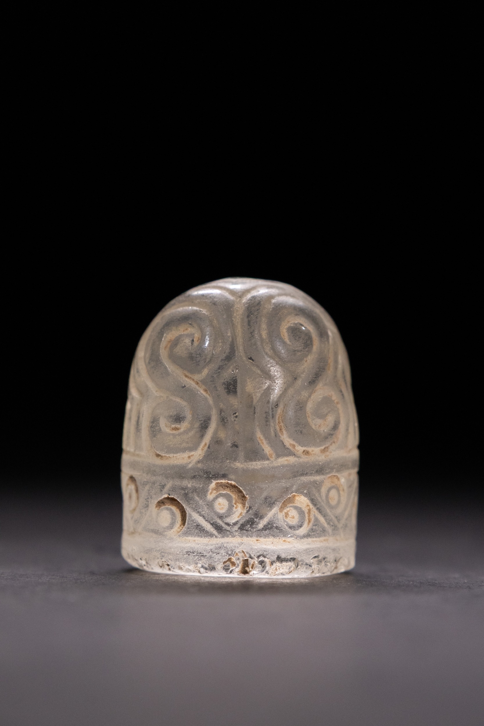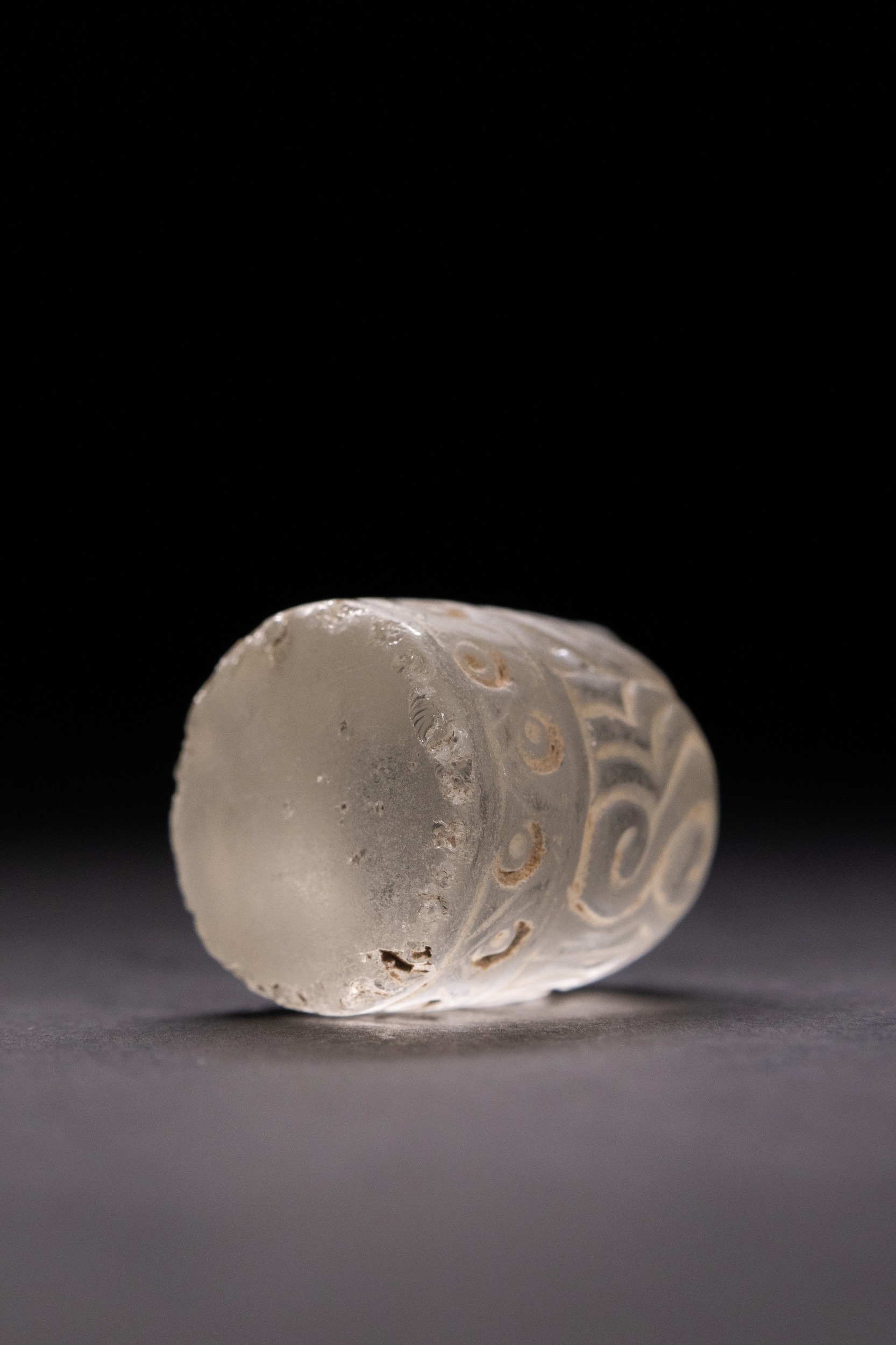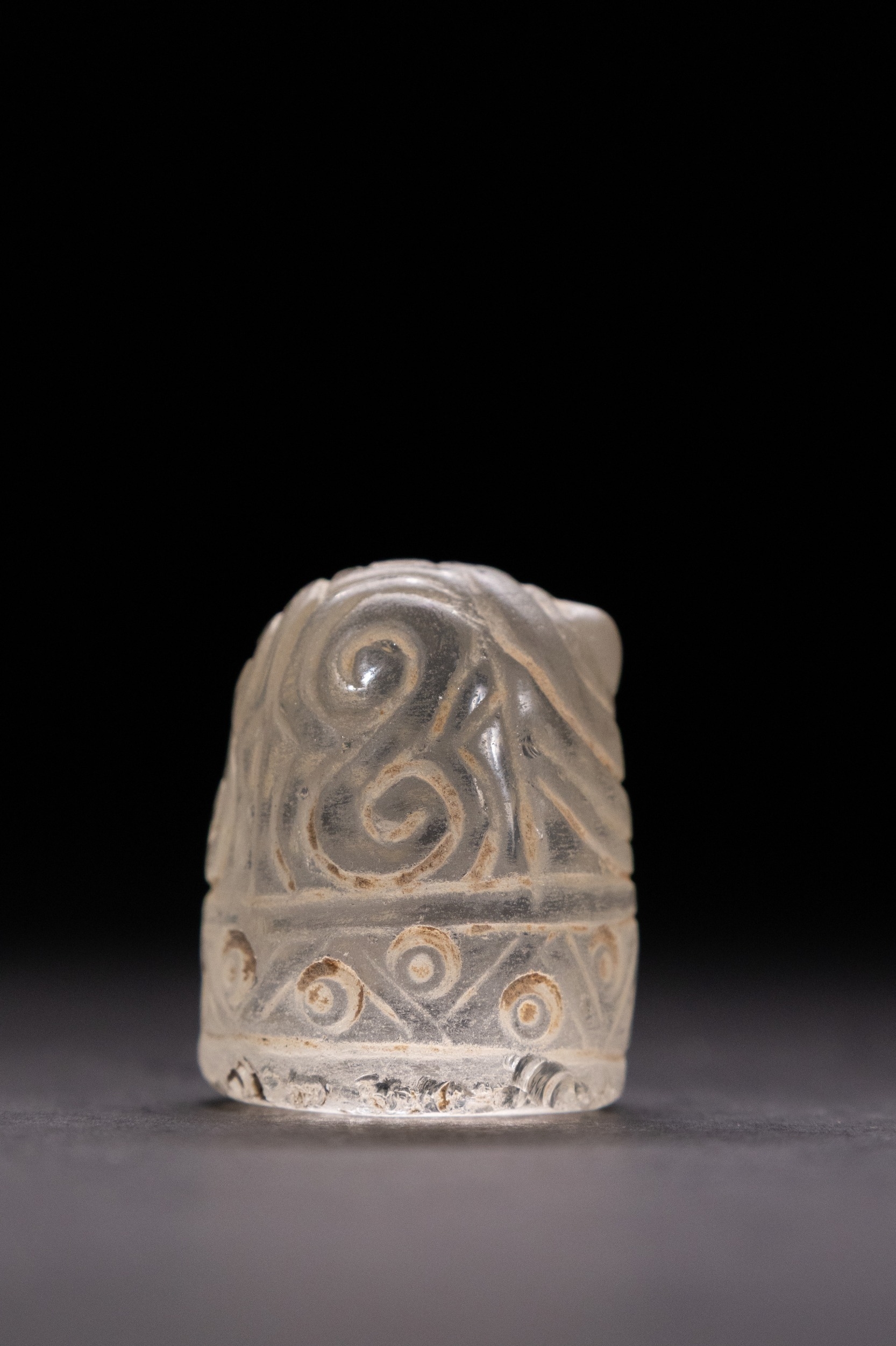 A rock crystal chess piece of rounded cylindrical form, carved with a spiral crest resembling a stylised mane or headdress, and a collar band decorated with concentric circular motifs and diagonal patterns.