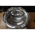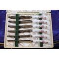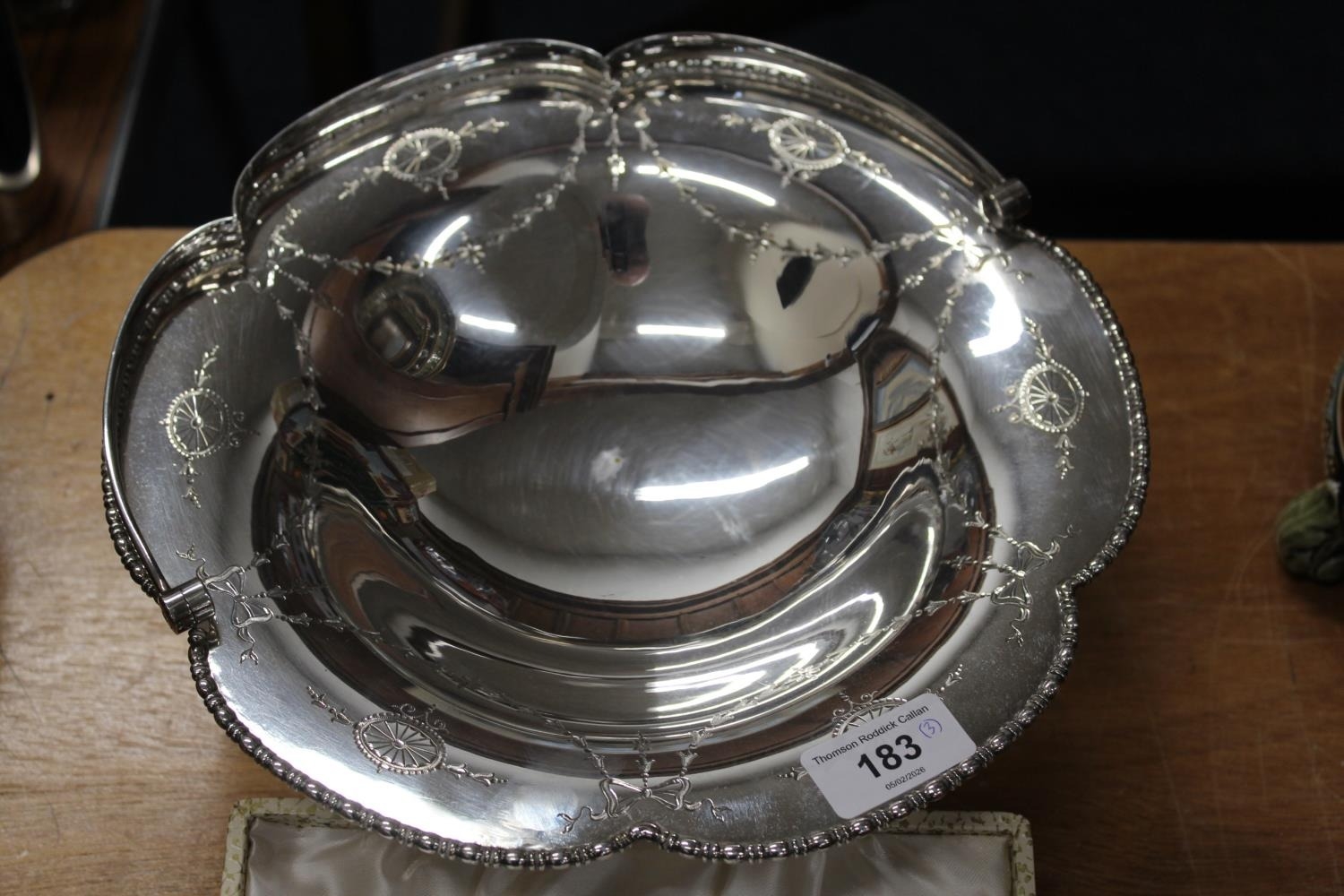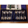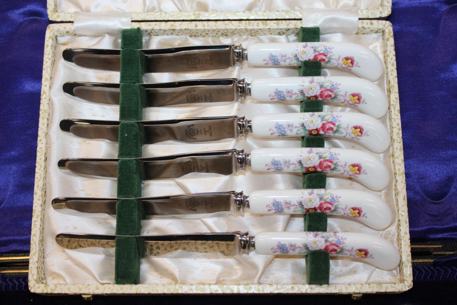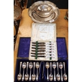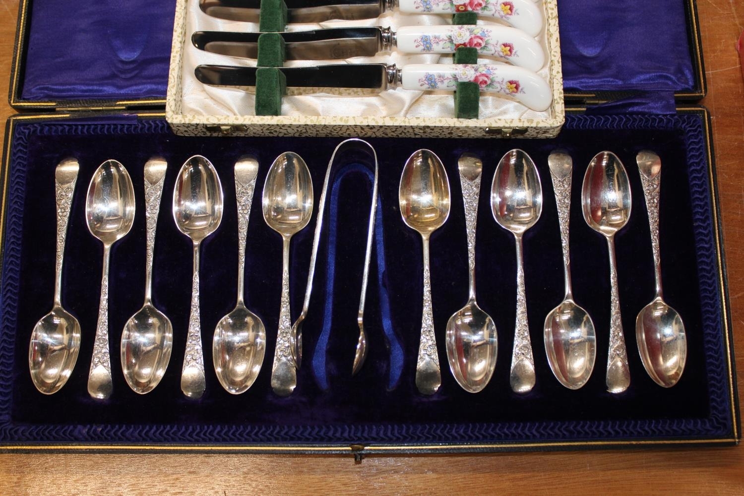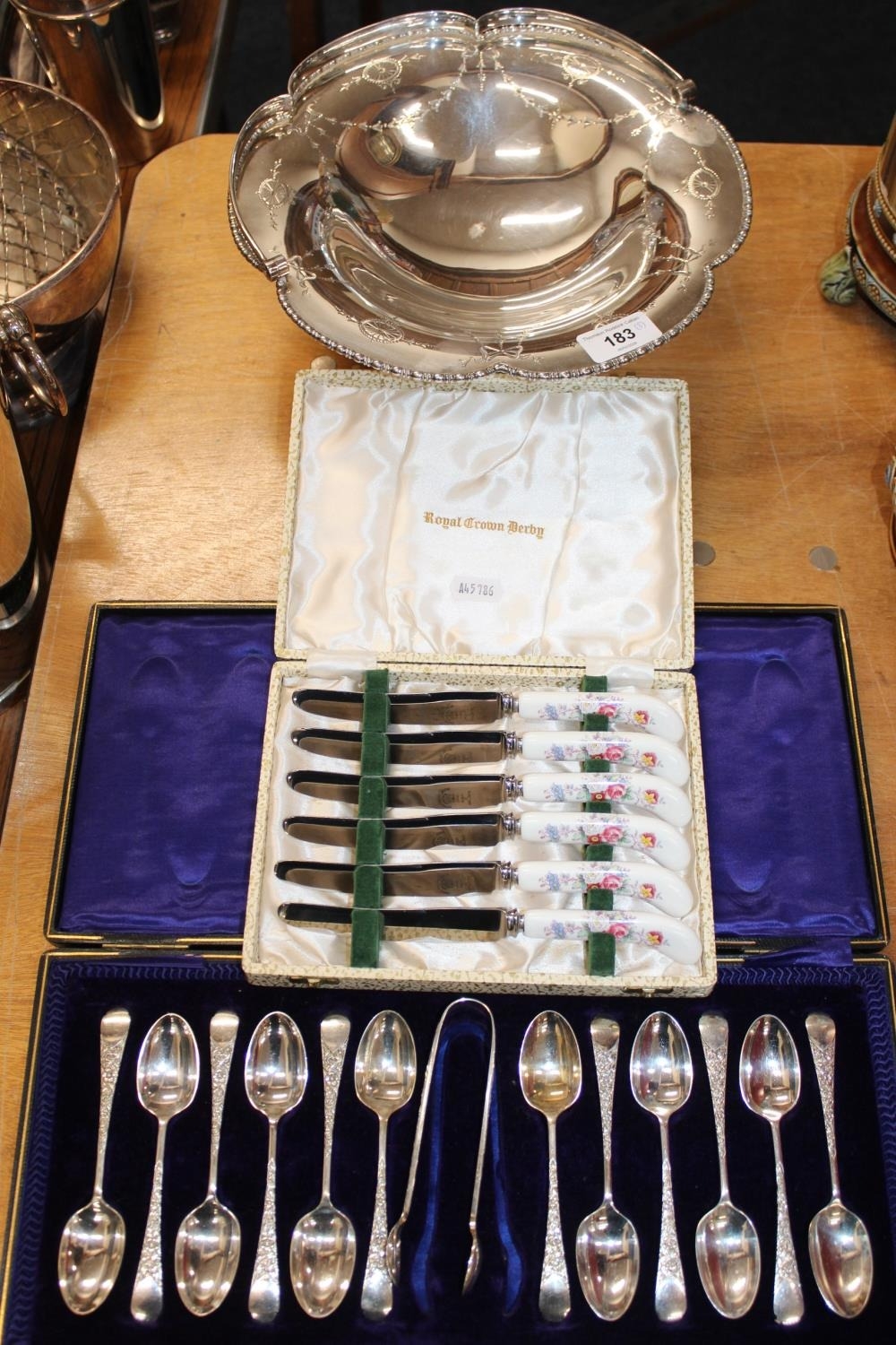 Cased set of twelve silver-plated teaspoons and sugar tongs, a cased set of six Royal Crown Derby pistol handled tea knives, and a silver-plated swing-handled cake basket.