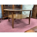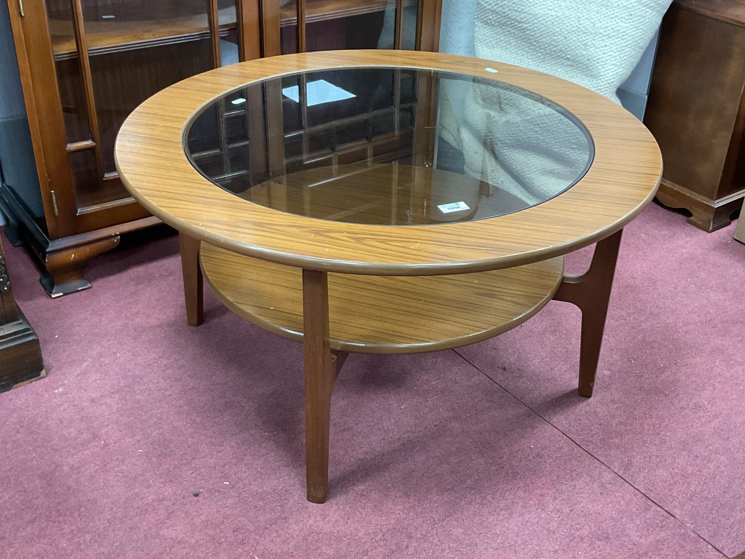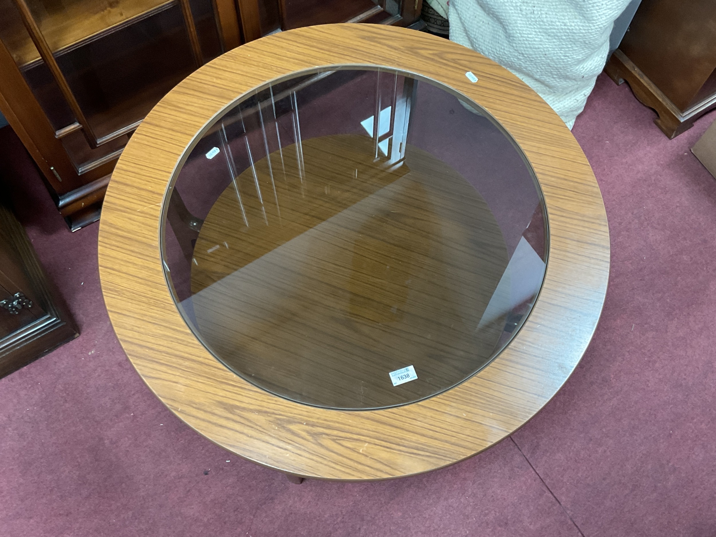 Mid Century Retro Vintage Round Coffee Table Probably by Schreiber, with a black glass inset top within a formica surround, approx 84cm diameter.