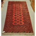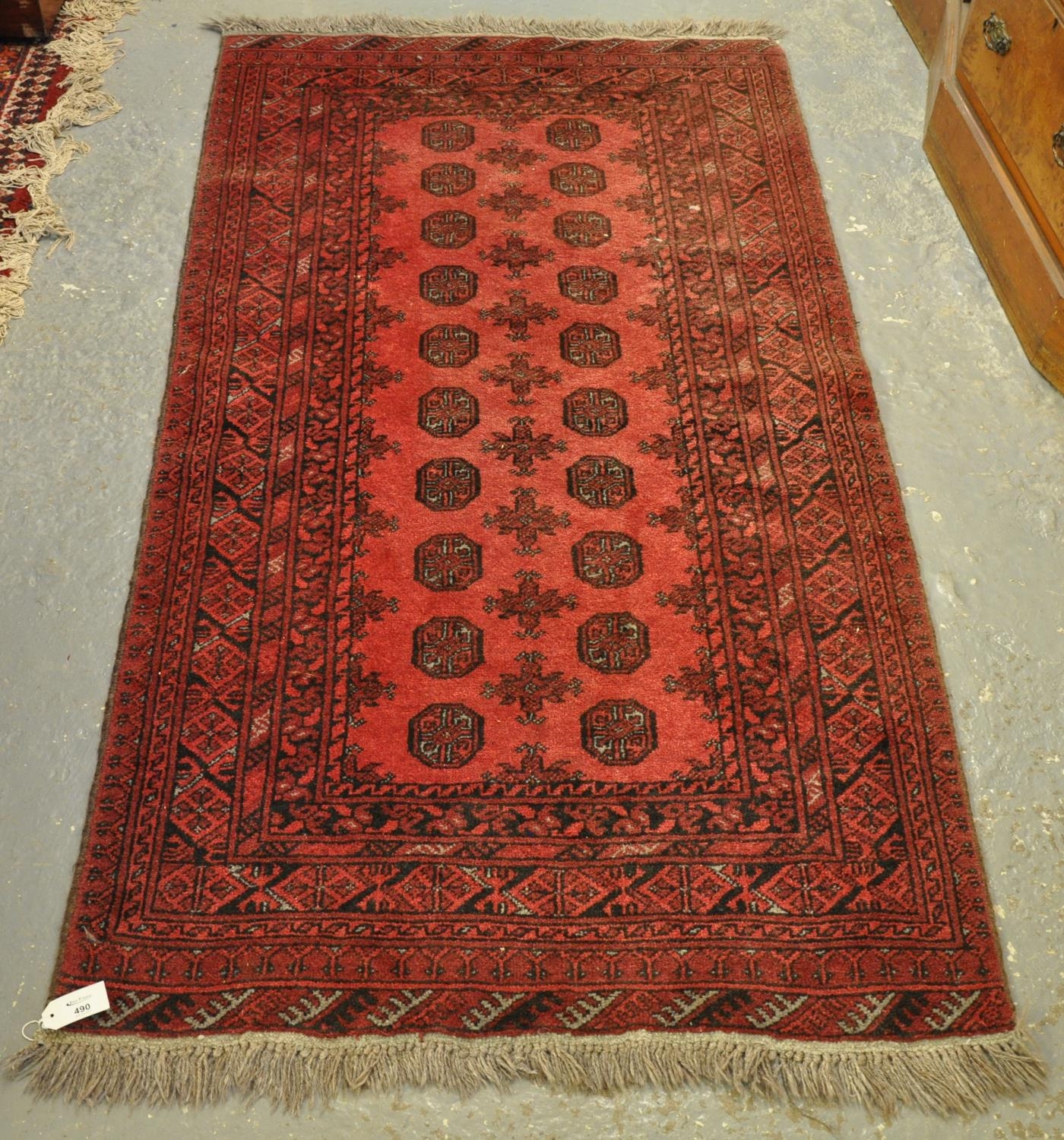 Middle Eastern design red ground runner or rug having central geometric guls and foliate banding. 190 x 105cm approx.
