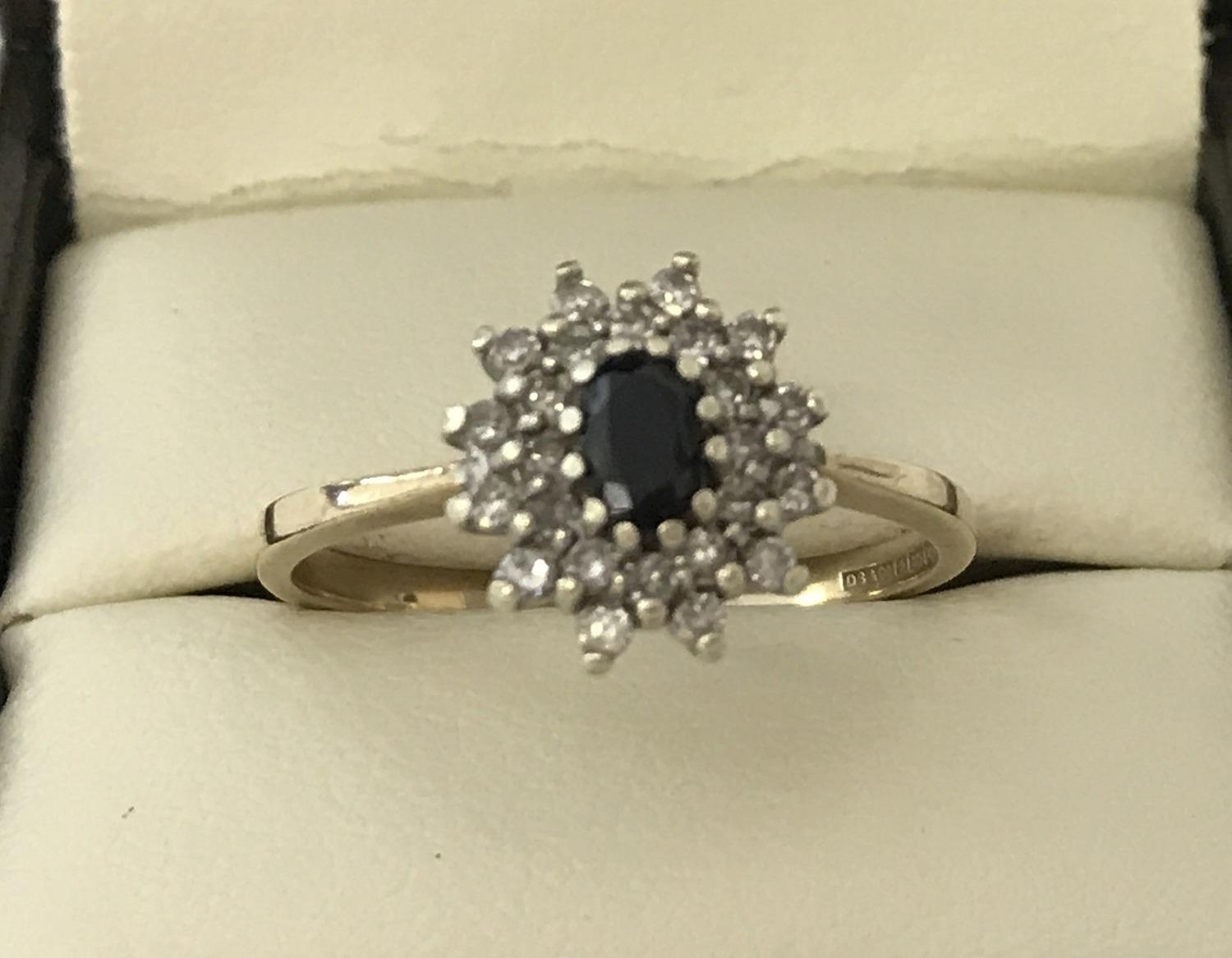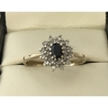 A 9ct gold sapphire and diamond dress ring. Central oval cut sapphire surrounded by two rows of small round cut diamonds - 24 in total. Ring size N. Total weight approx. 2.7g.