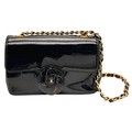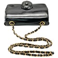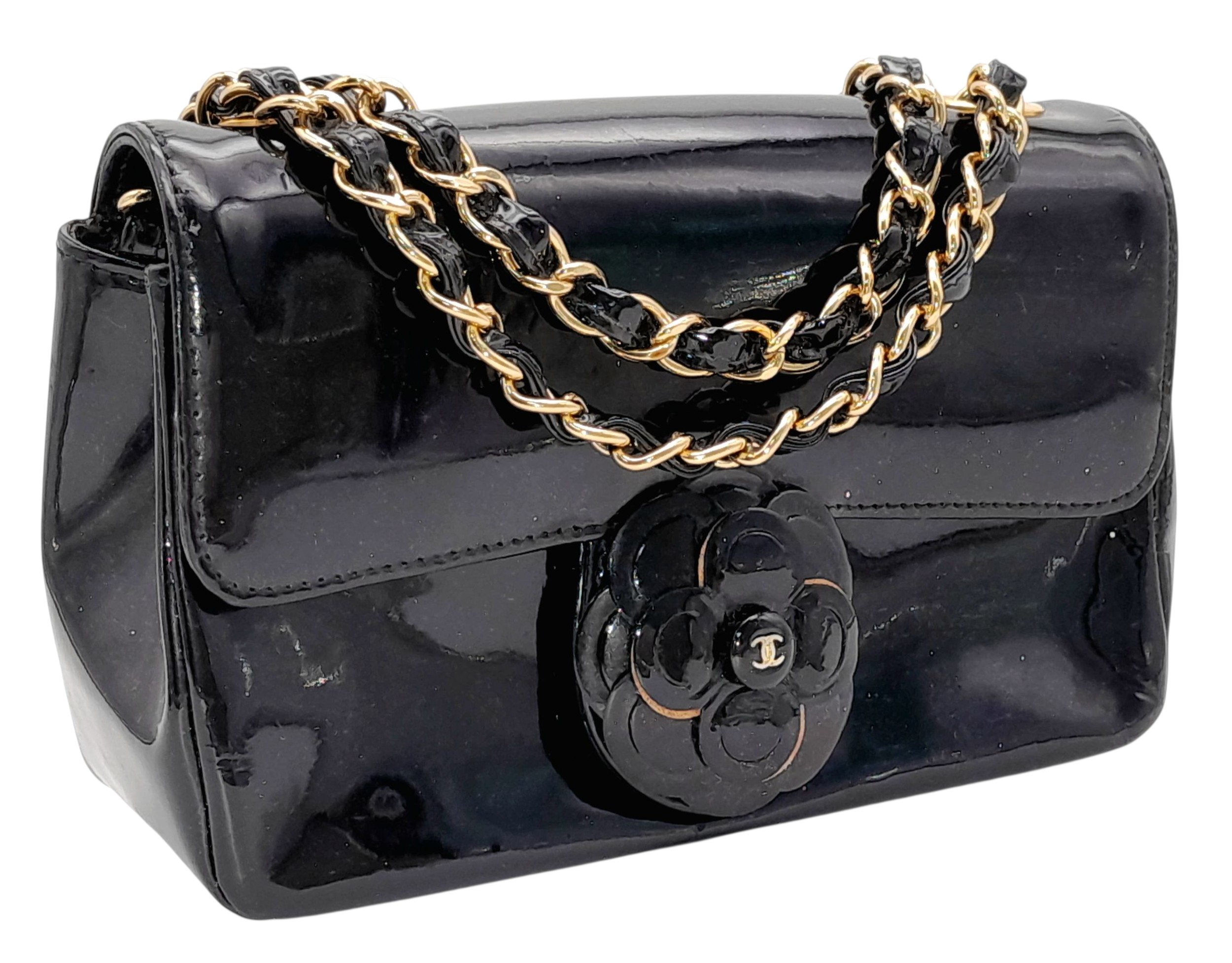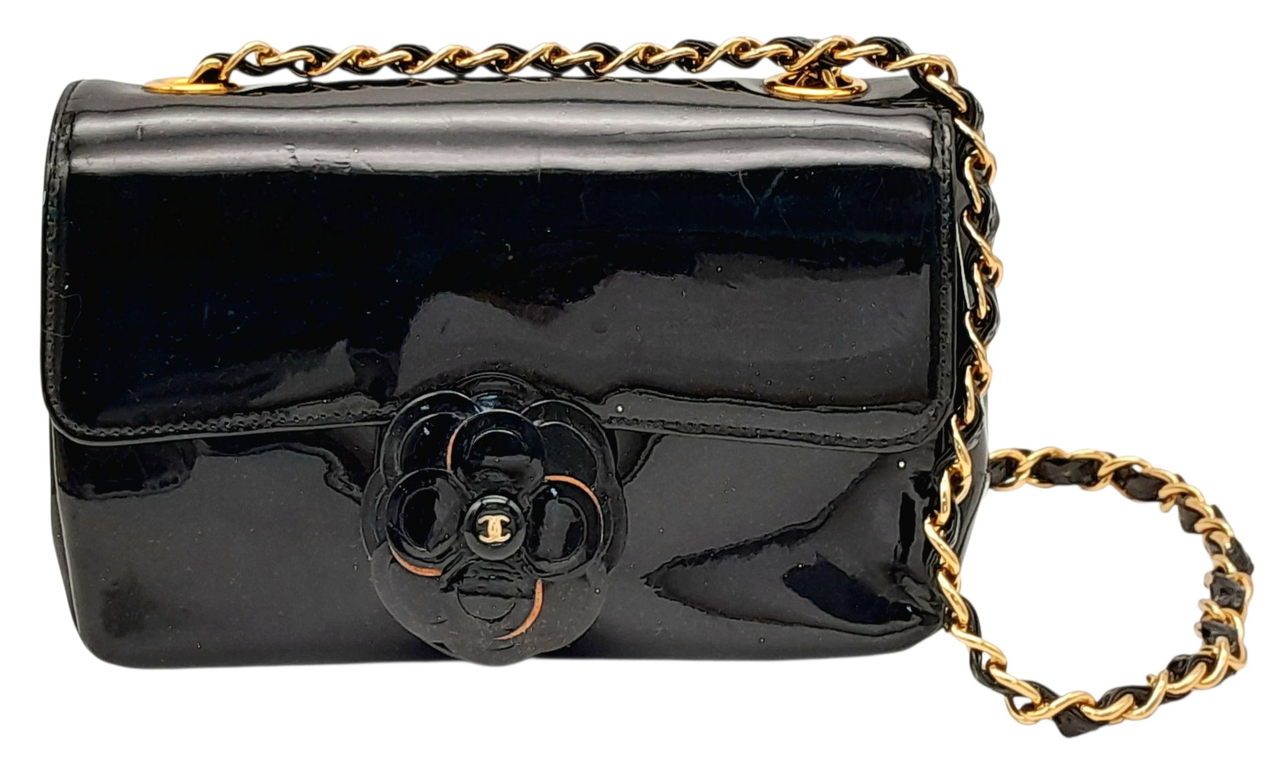 A Chanel Camellia Flap Bag in Black Patent Leather. Exterior open pocket. Gold tone hardware. Classic Chanel shoulder strap. Interior open pocket. 18cm width x 11cm height. Please see photos for conditions. STK025405
