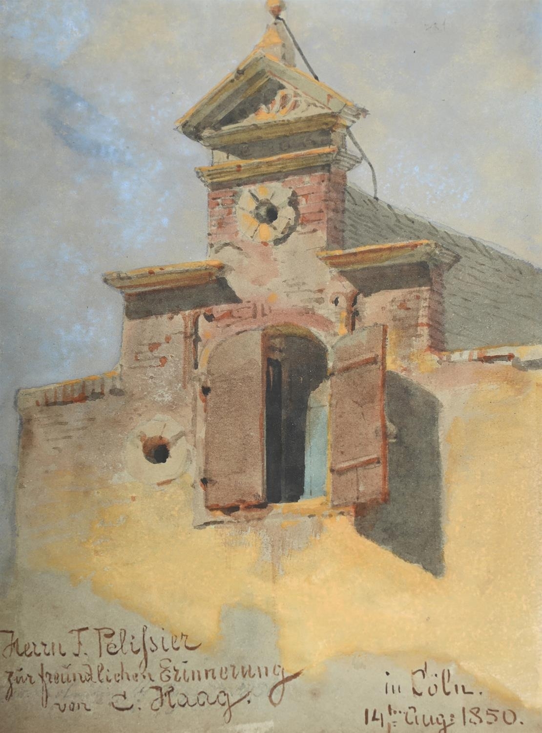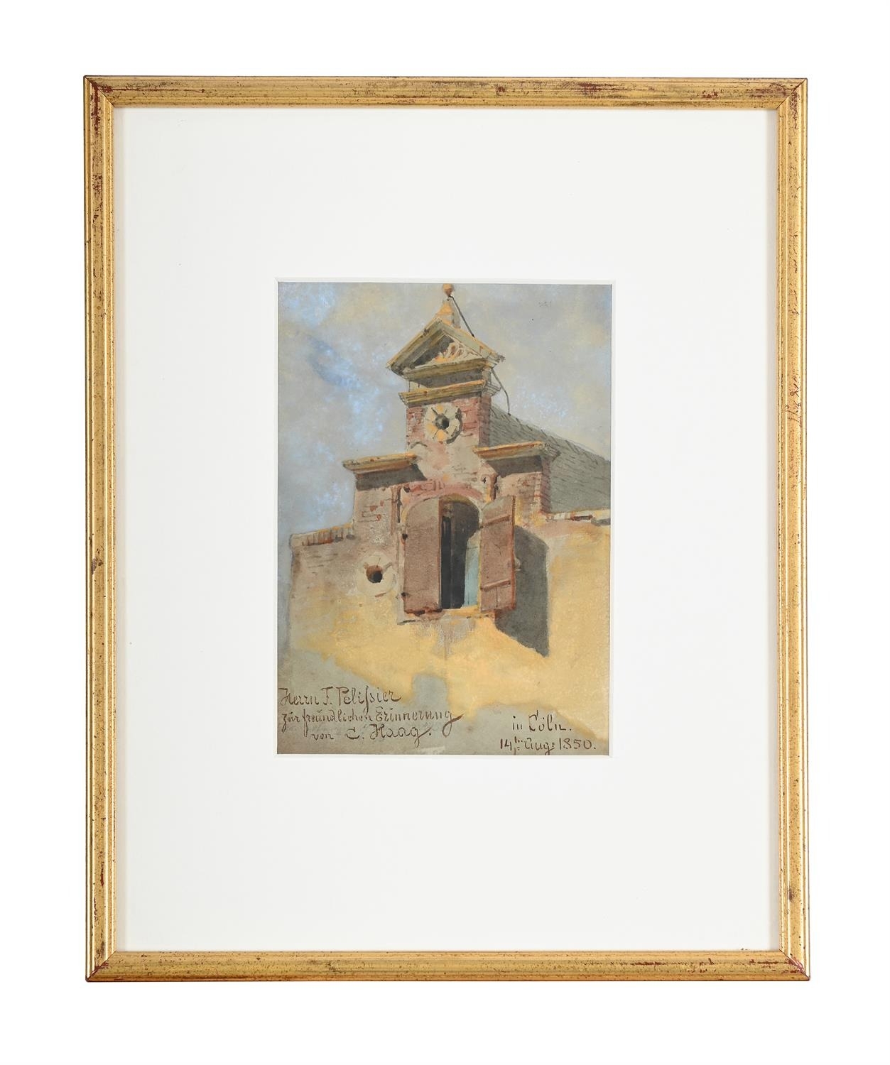 CARL HAAG (GERMAN 1820-1915)VIEW OF A CHURCH; AFTER THE HARVEST (VERSO)WatercolourSigned, variously inscribed and dated '14 Aug 1850' (lower edge)17 x 12cm (6½ x 4½ in.)Measurements do not include the frame unless specified. Please note Dreweatts are not liable for damage to frames or mounts.