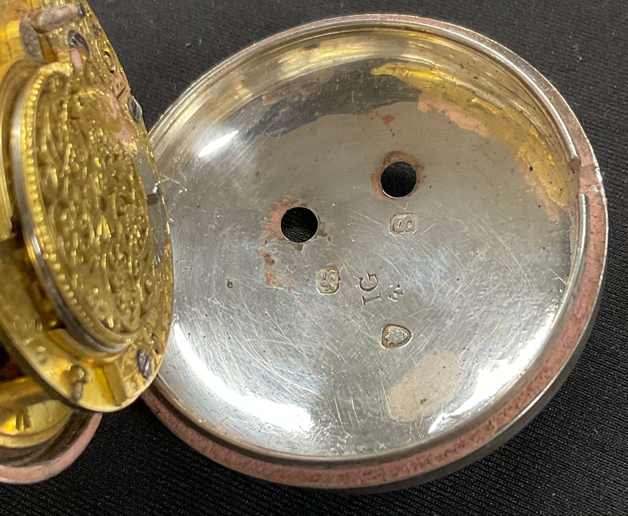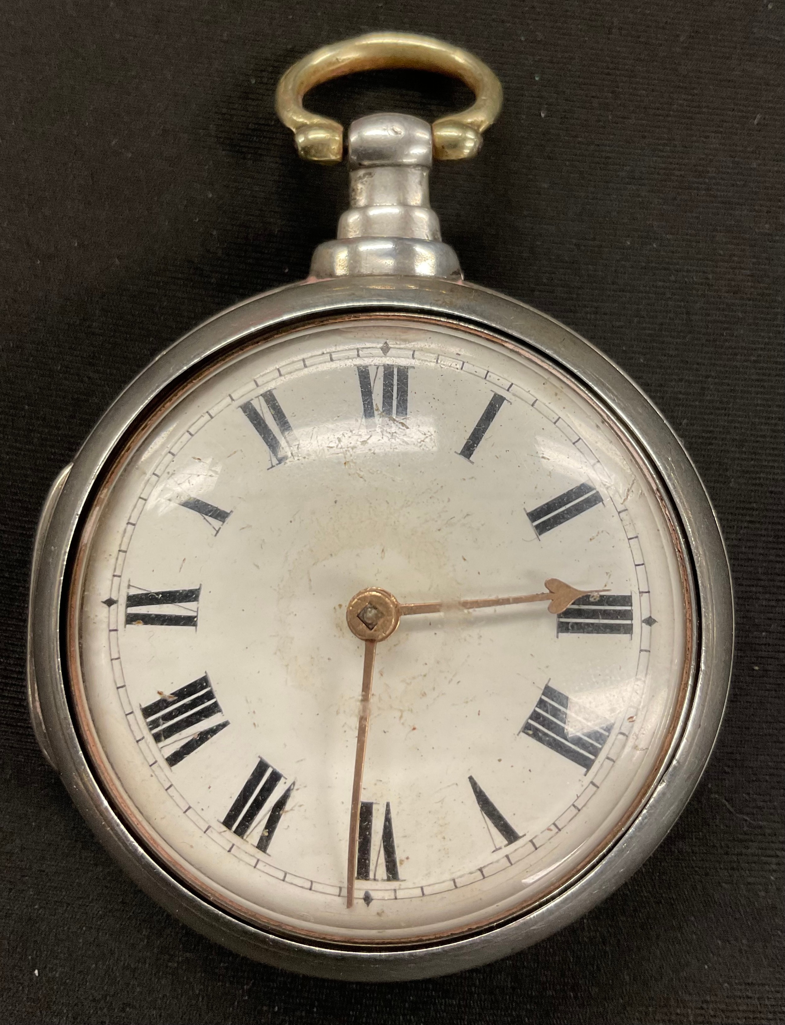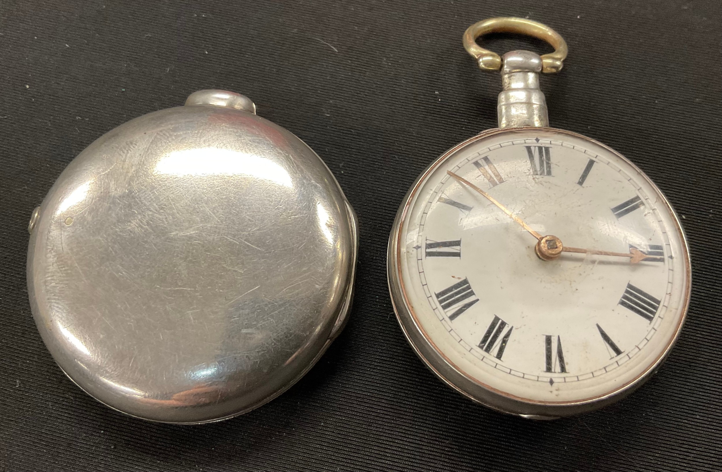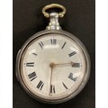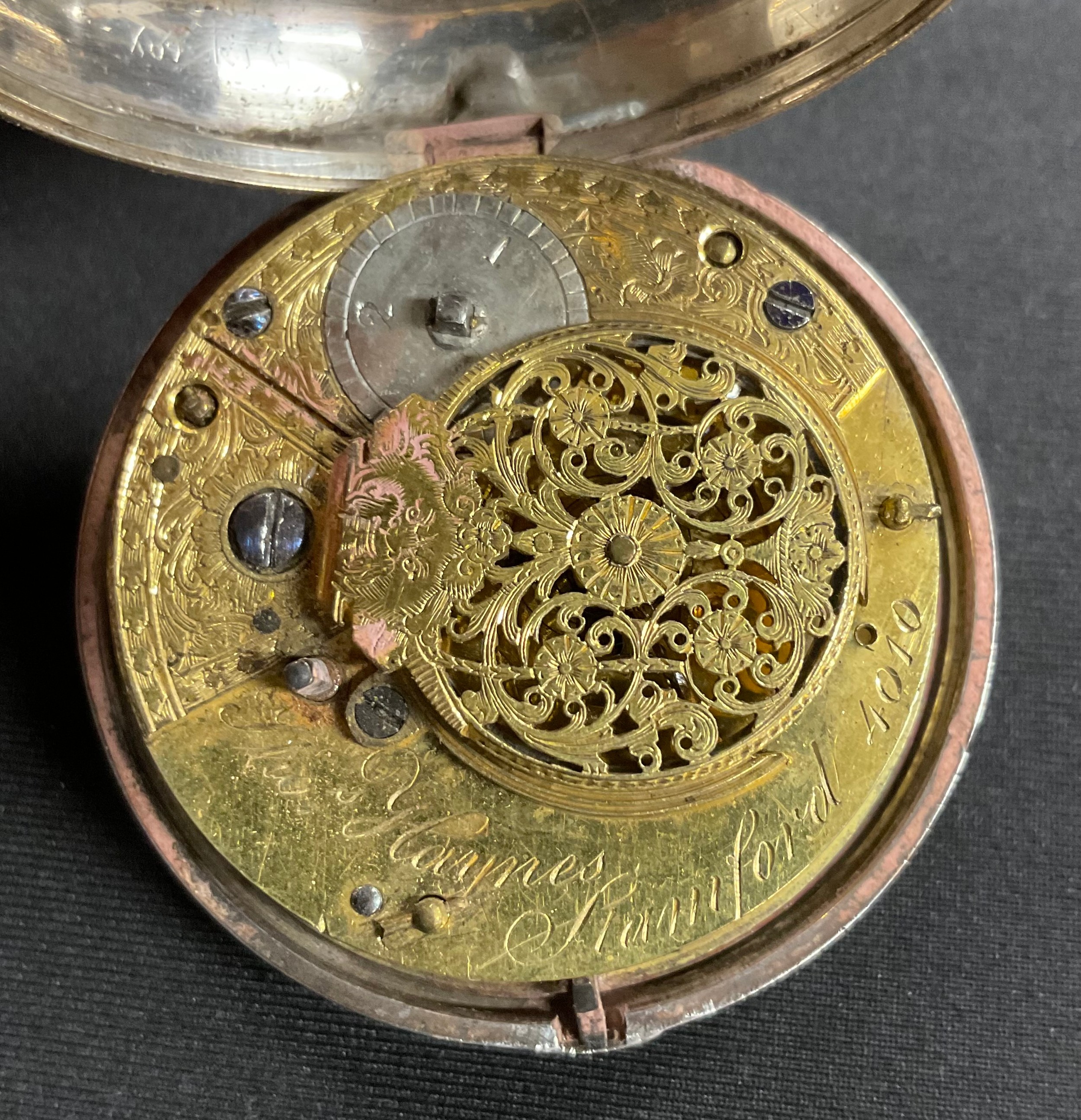 A George III hallmarked silver pair cased verge pocket watch, white enamel dial, Roman numerals, the movement inscribed Thomas Haynes, Stamford, London 1813