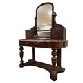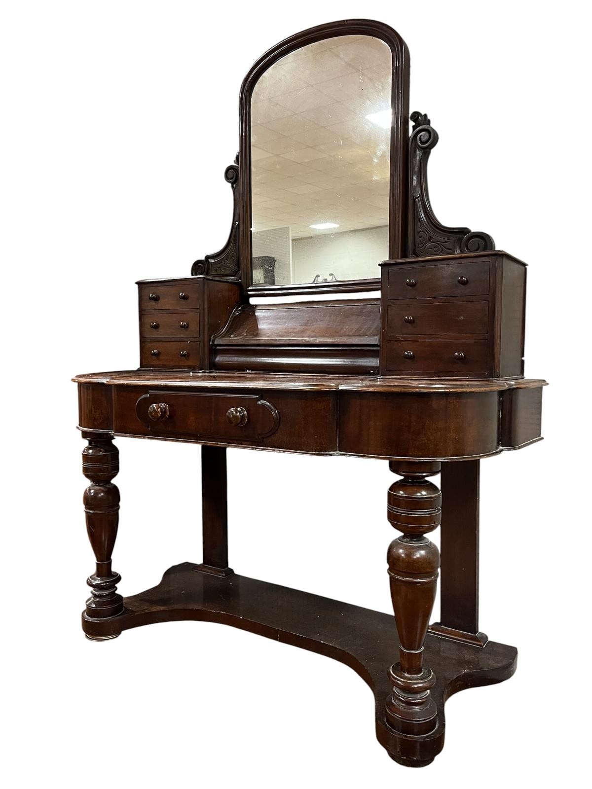 A VICTORIAN MAHOGANY DRESSING TABLE the superstructure with rectangular swivel mirror above a hinged compartment flanked on each side by three short drawers the base with frieze drawer raised on baluster supports joined by a shaped platform on bun feet 157cm (h) x 121cm (w) x 53cm (d)