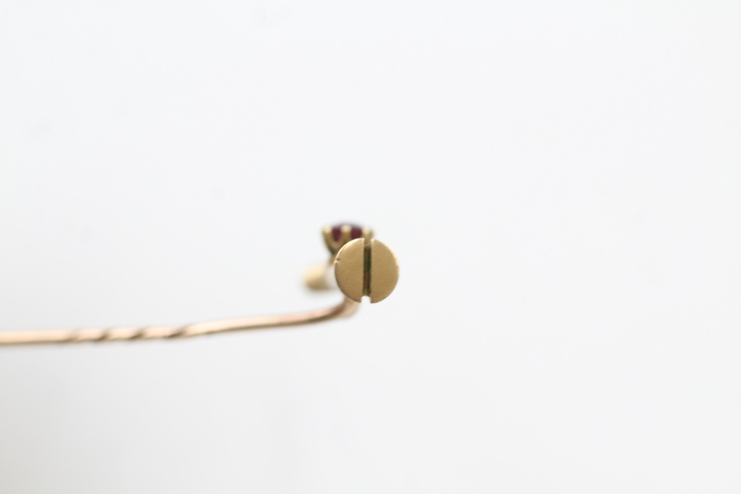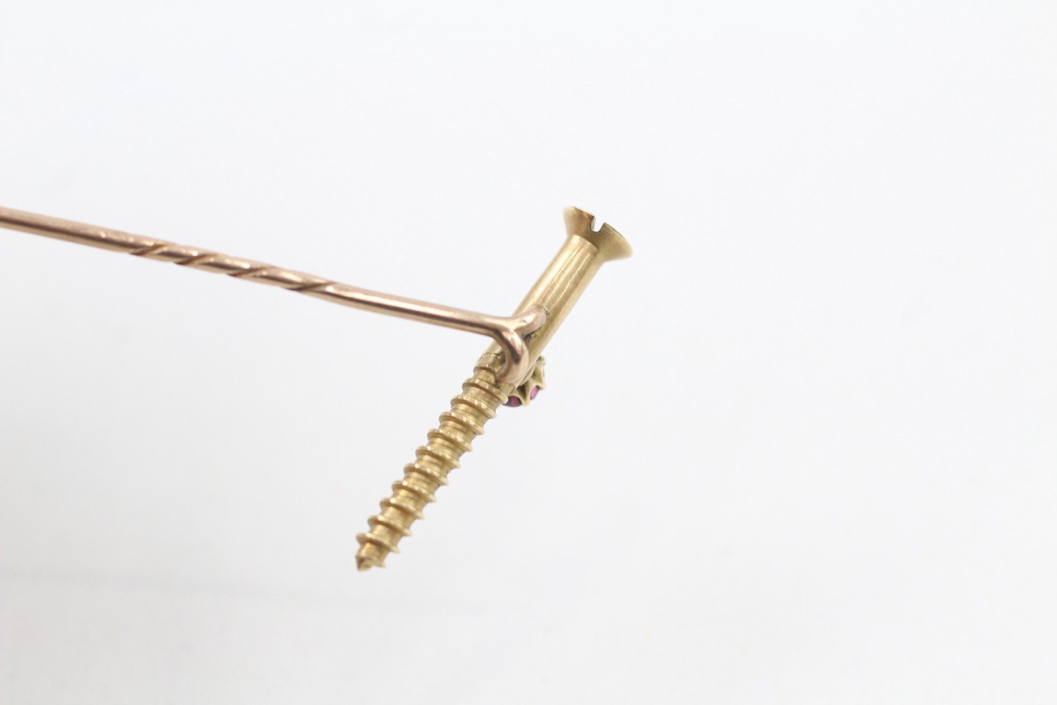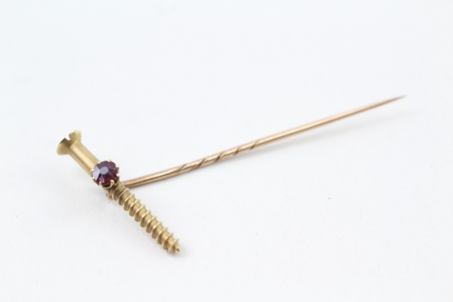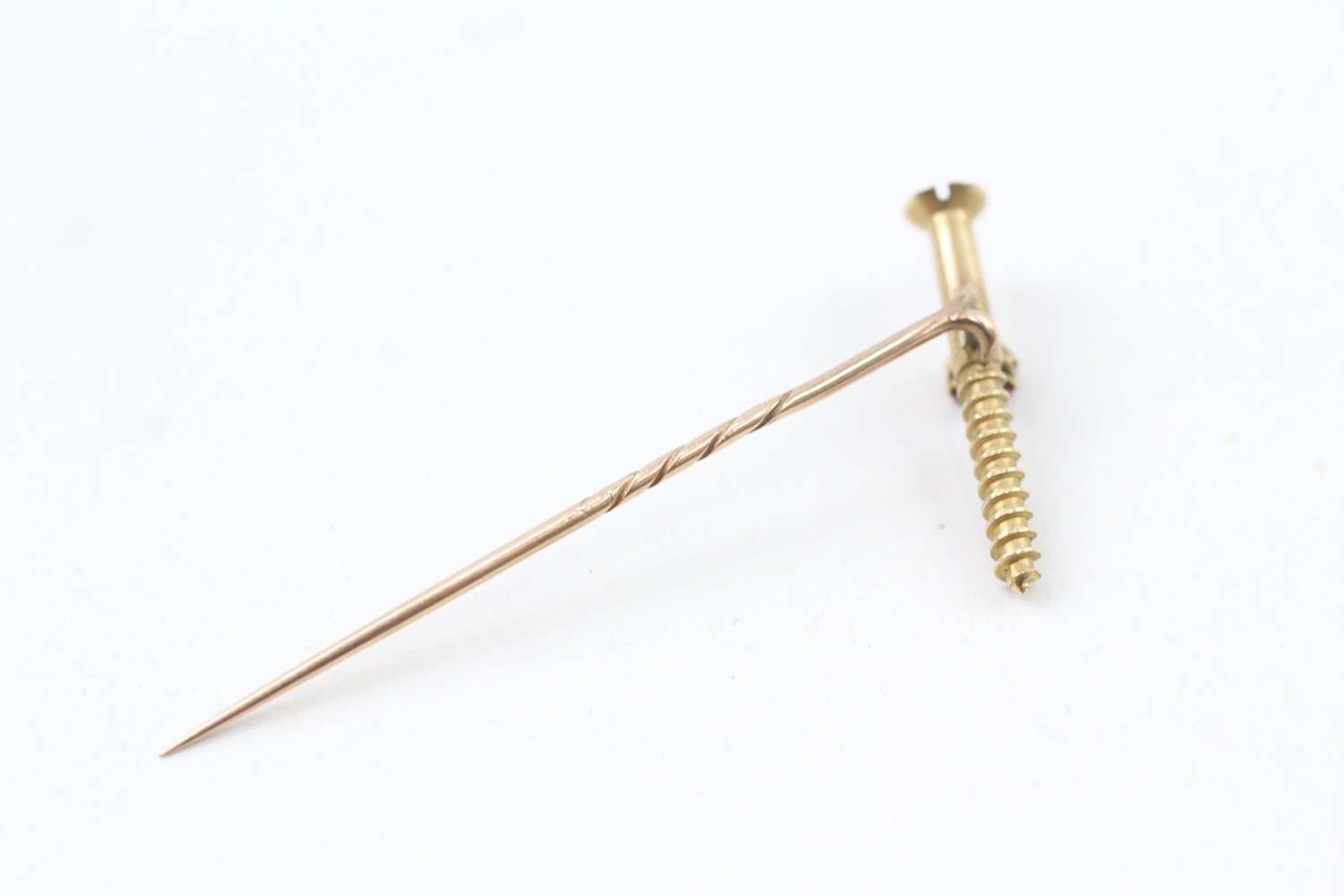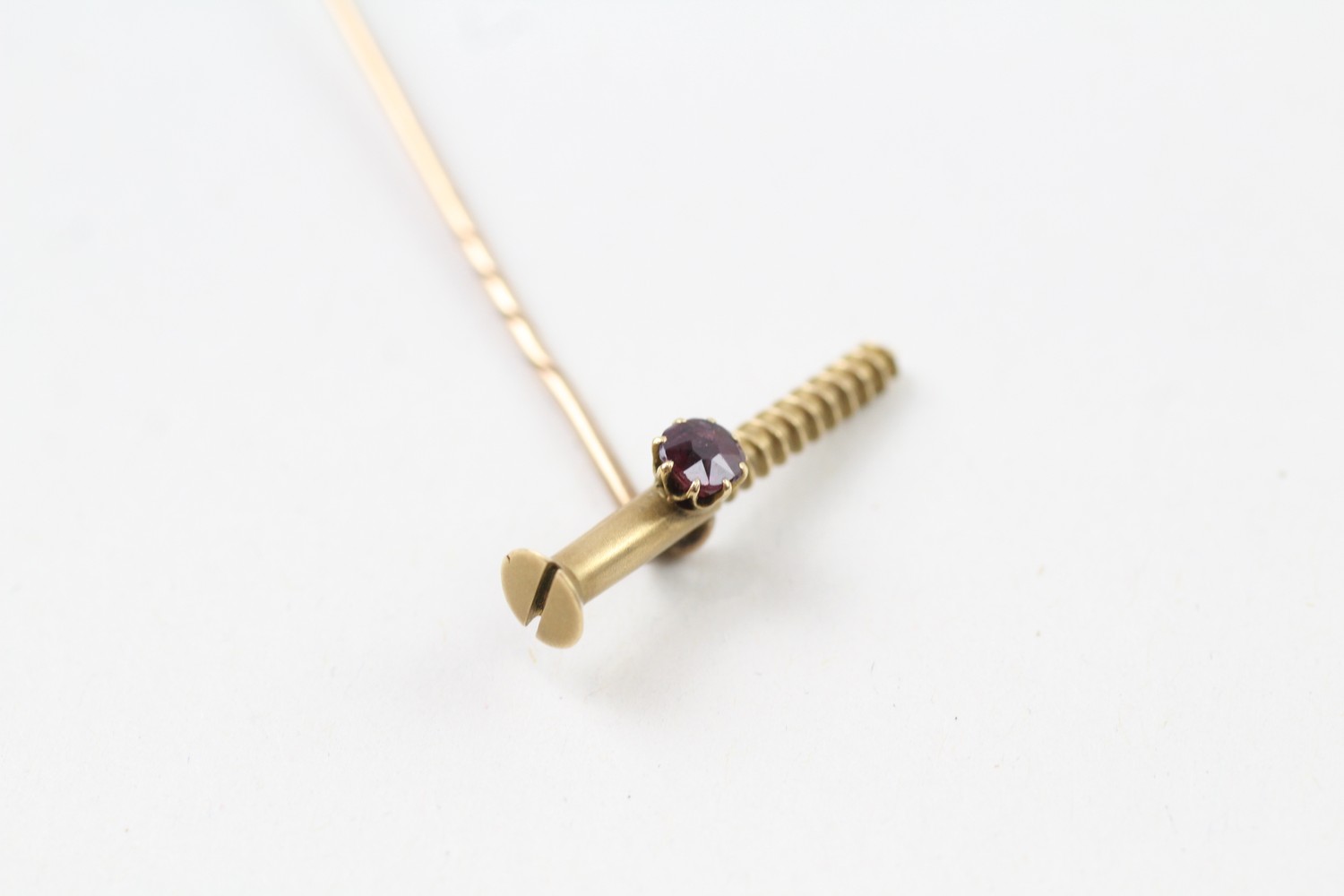 AN 18CT GOLD RUBY SCREW HEAD STICK PIN WITH 15CT GOLD PIN, Weight: 3.0gms