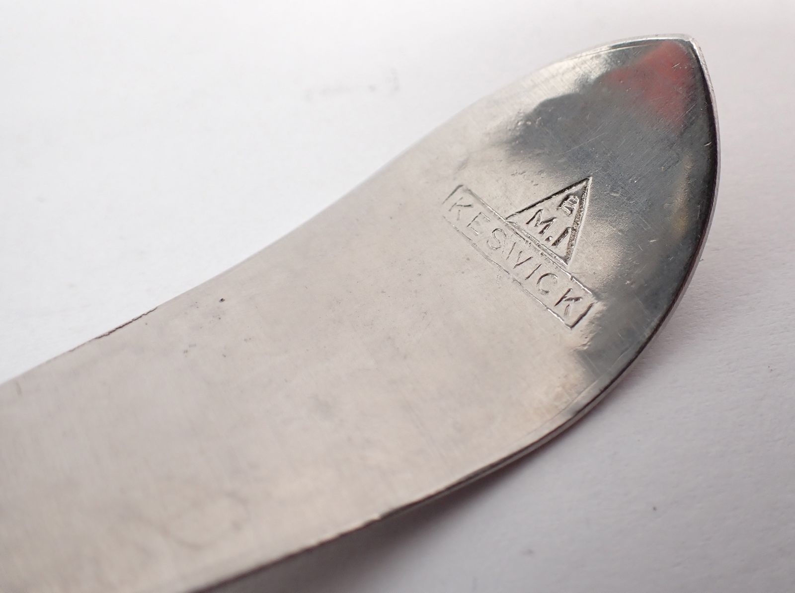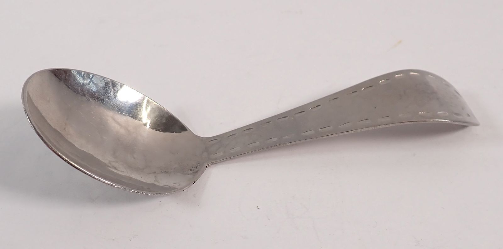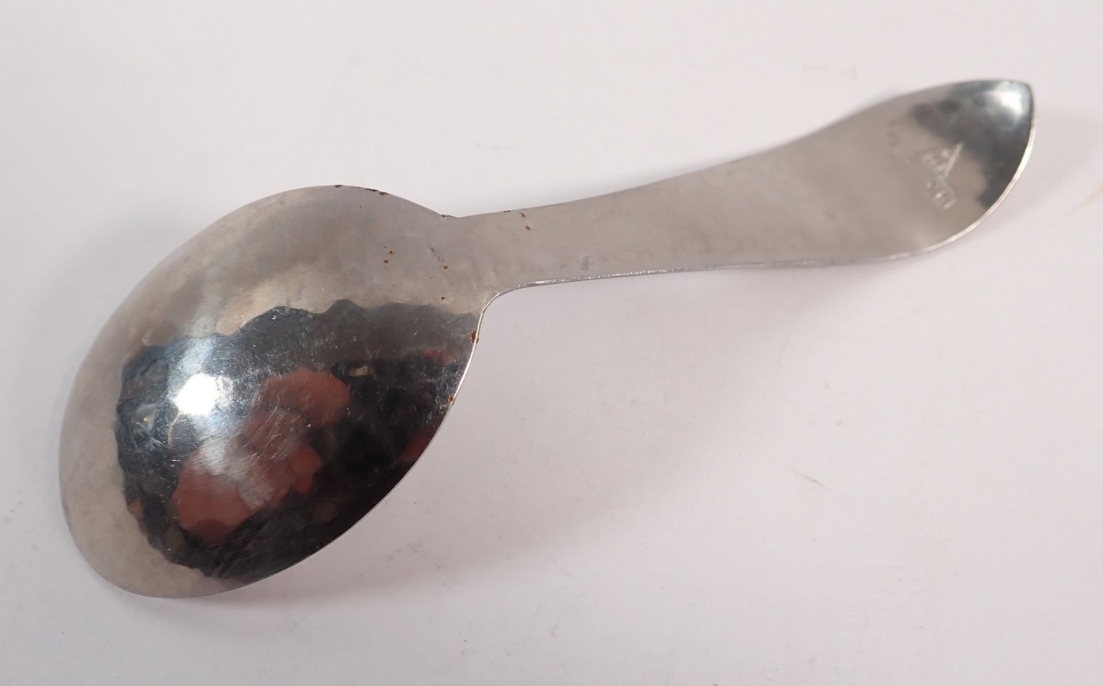 A Keswick BMI pewter caddy spoon with planished finish, 11cm long