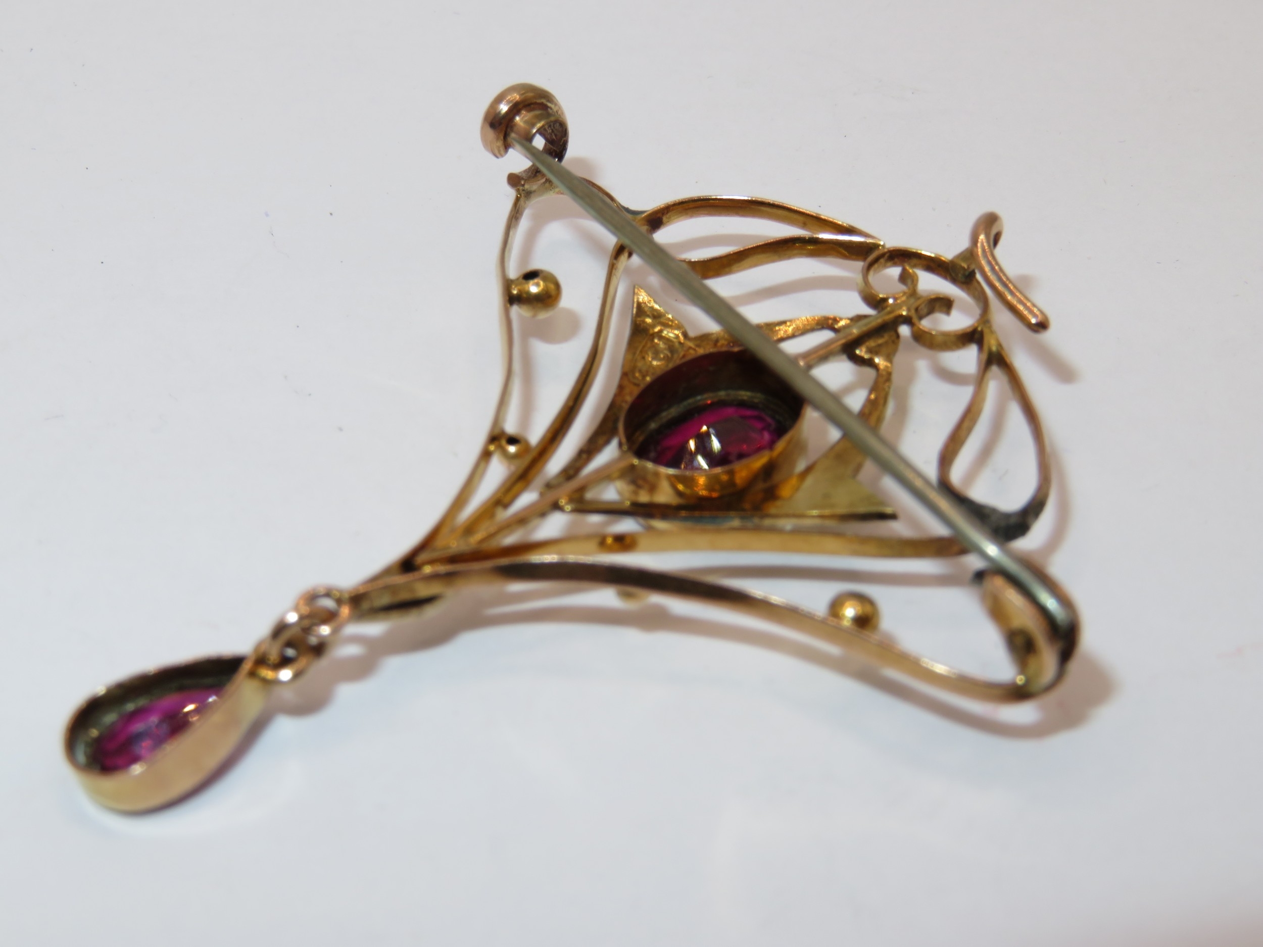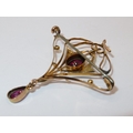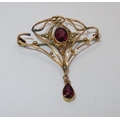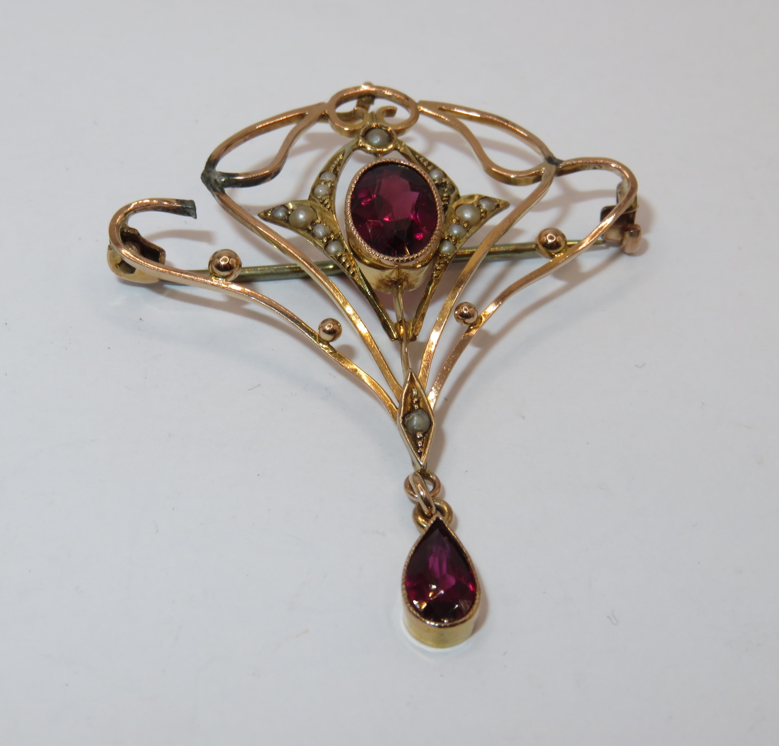 9ct yellow gold Art Nouveau style pendant bar brooch, set with central garnet and split seed pearls, 3.2g (at fault)