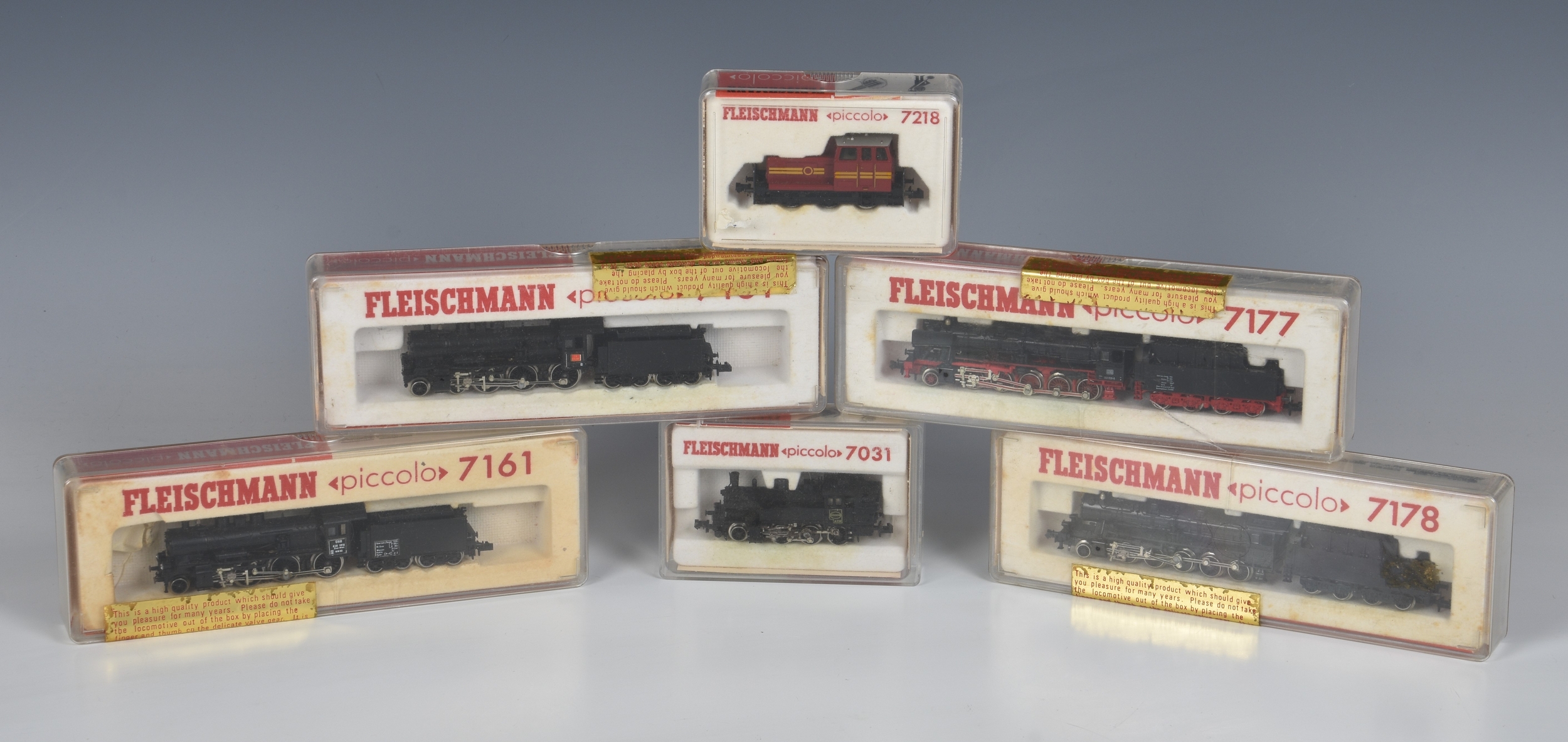 Fleischmann piccolo - six cased N gauge locomotives to include 2 x 7161 steam locomotives FS 675.001, 0BB 638 1818 Dion Wein WM80; 7178; 7177; 7218; 7031, all housed in original packaging but unchecked. (6)