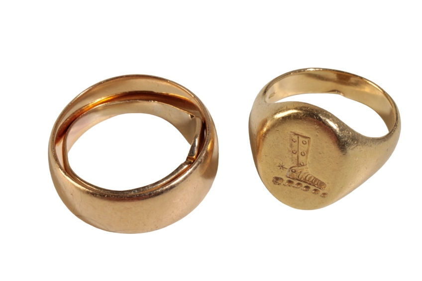 A GENTLEMAN'S 18CT YELLOW GOLD SIGNET RING,, with "boot with spurs" crest, stamped "750", together with an 18ct gold wedding band and a ladies 9ct gold signet ring, approx 22.1grams total weight (3)