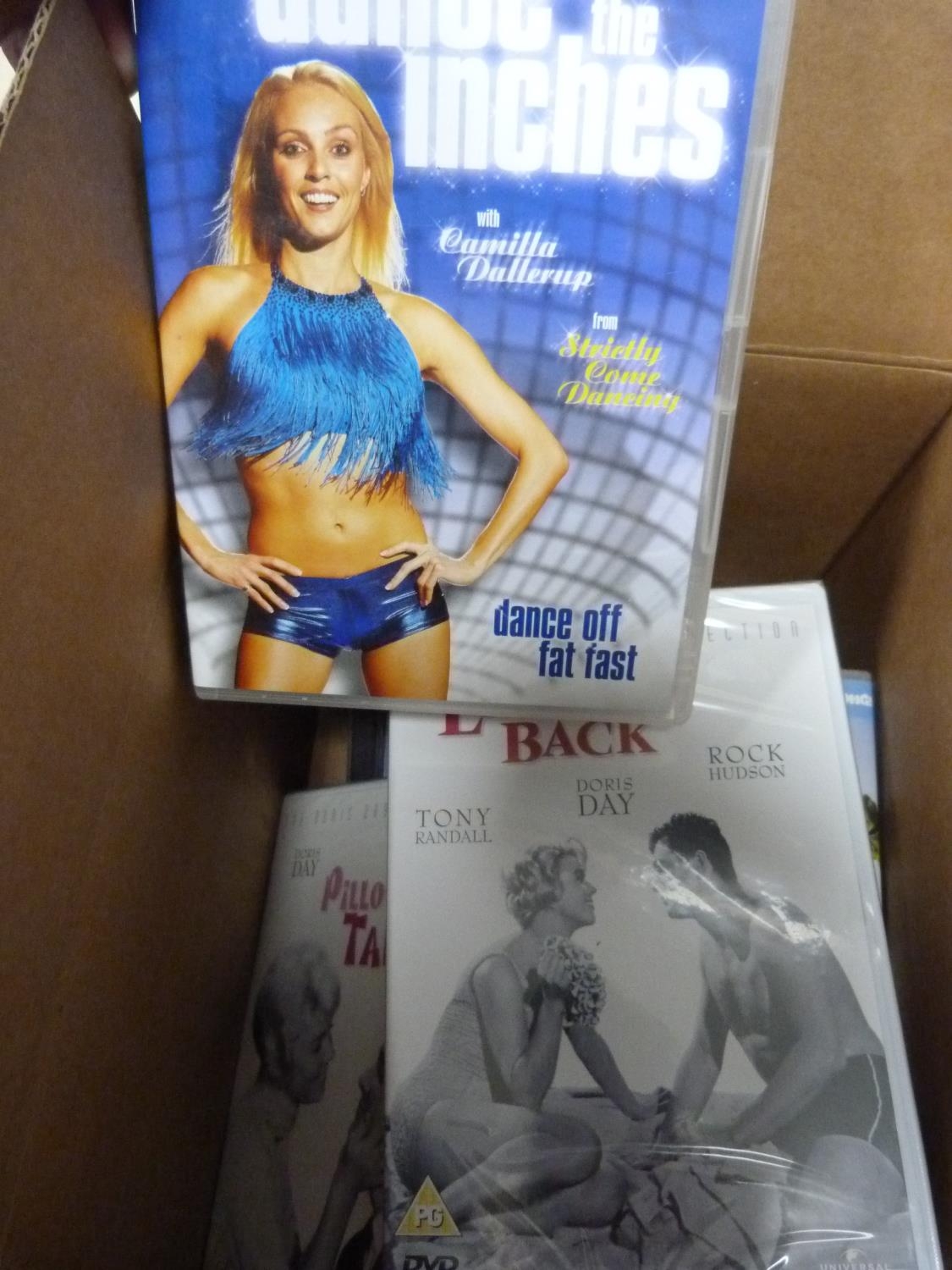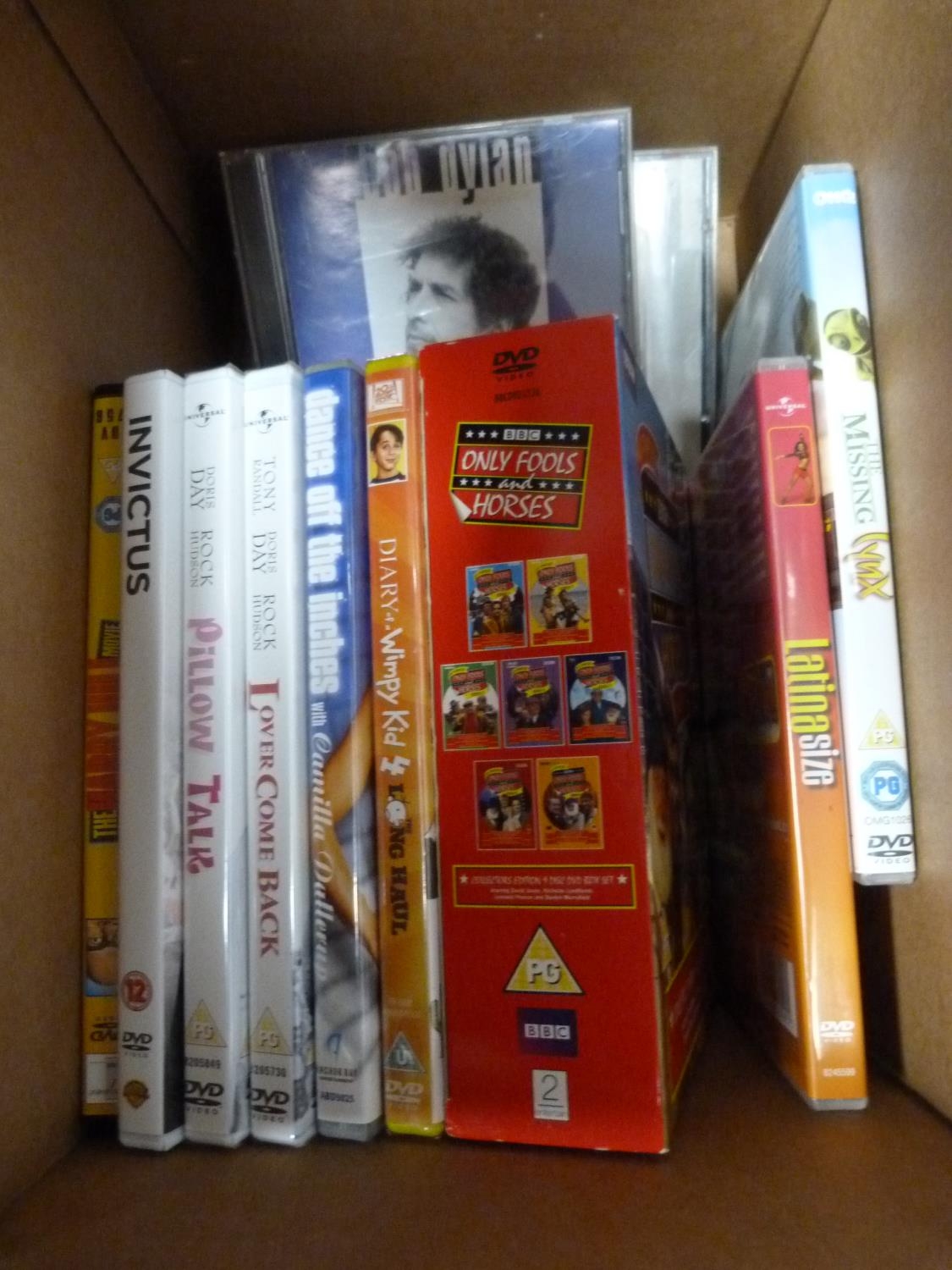 Carton containing assorted DVDs and CDs.