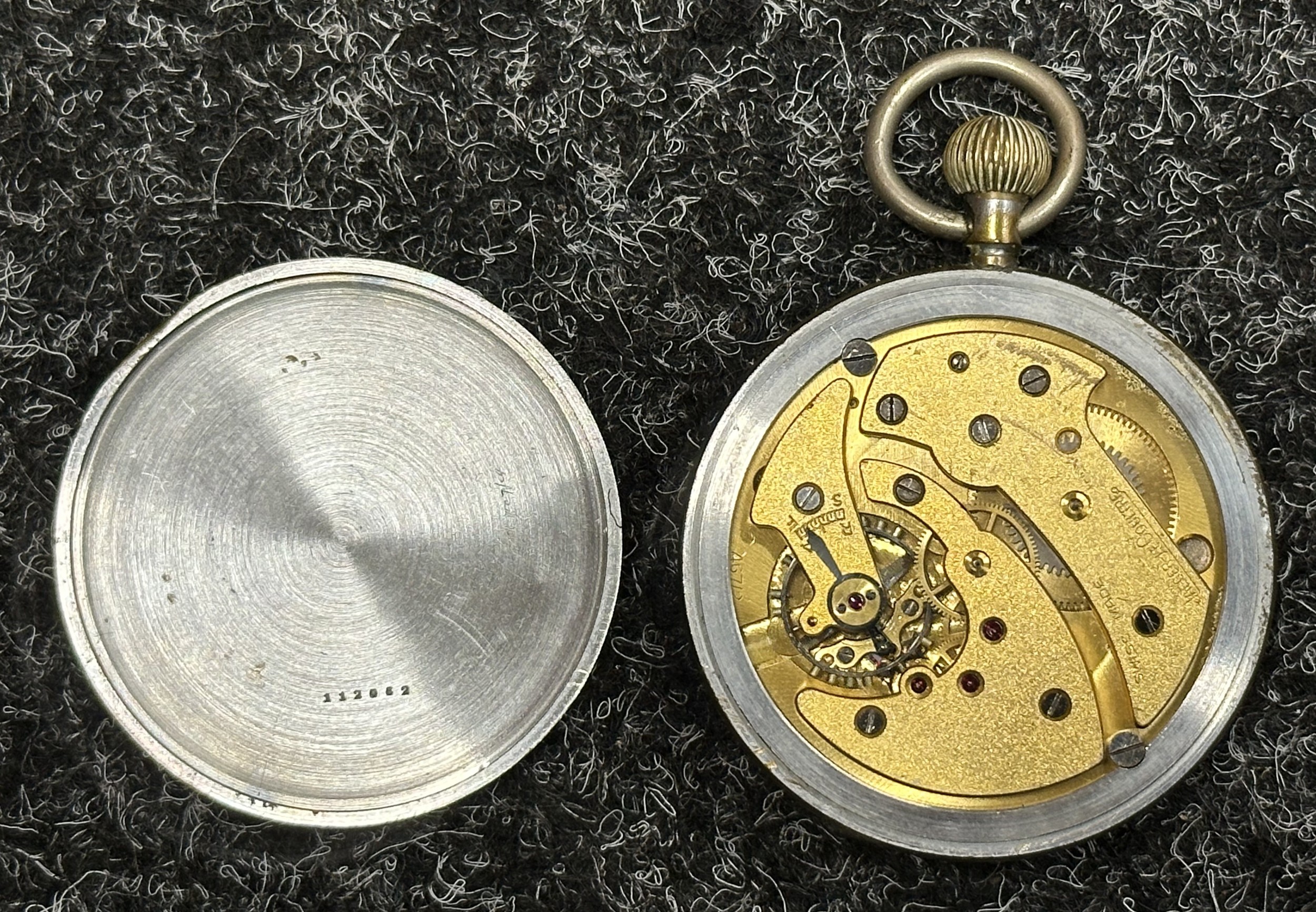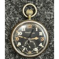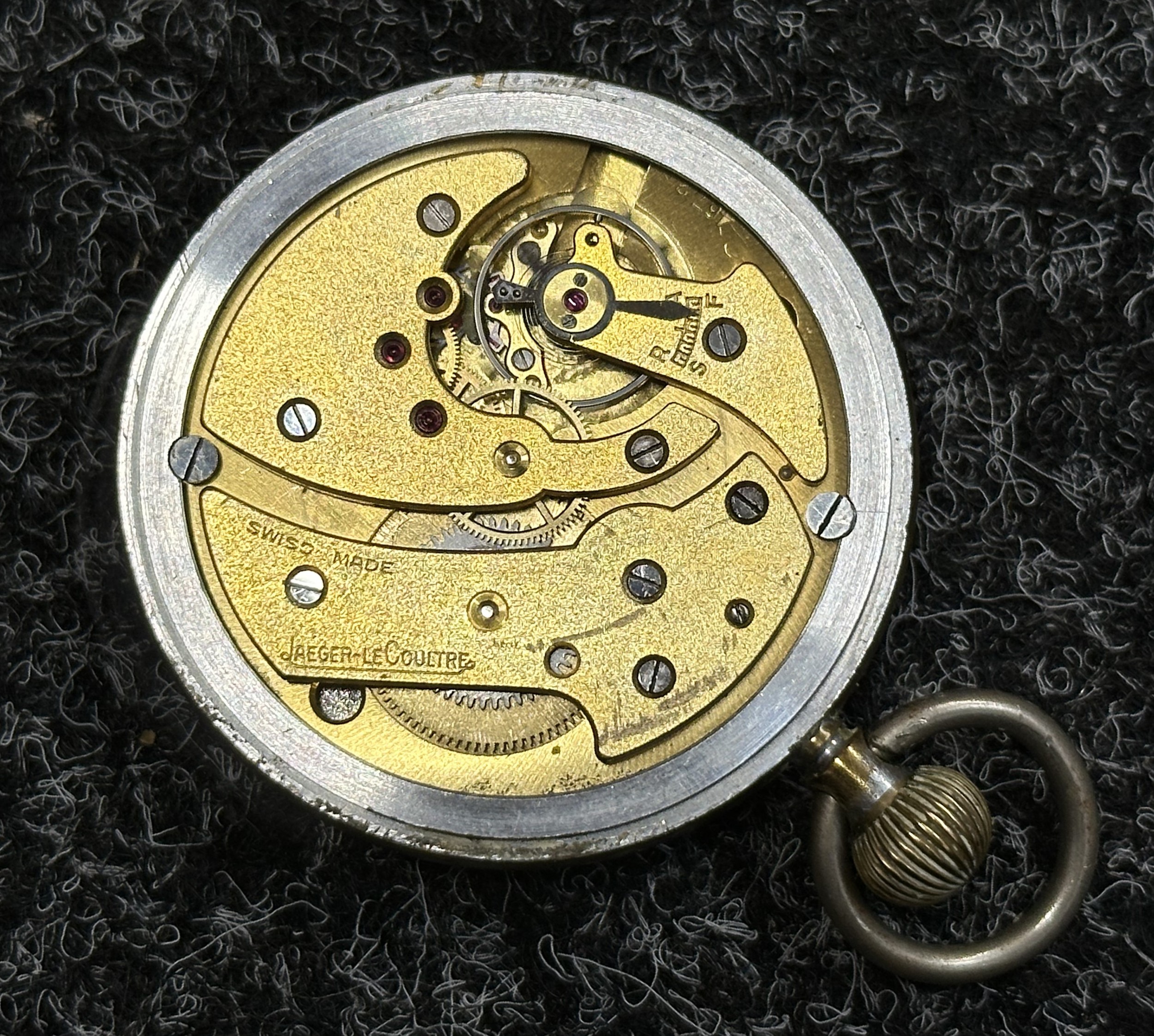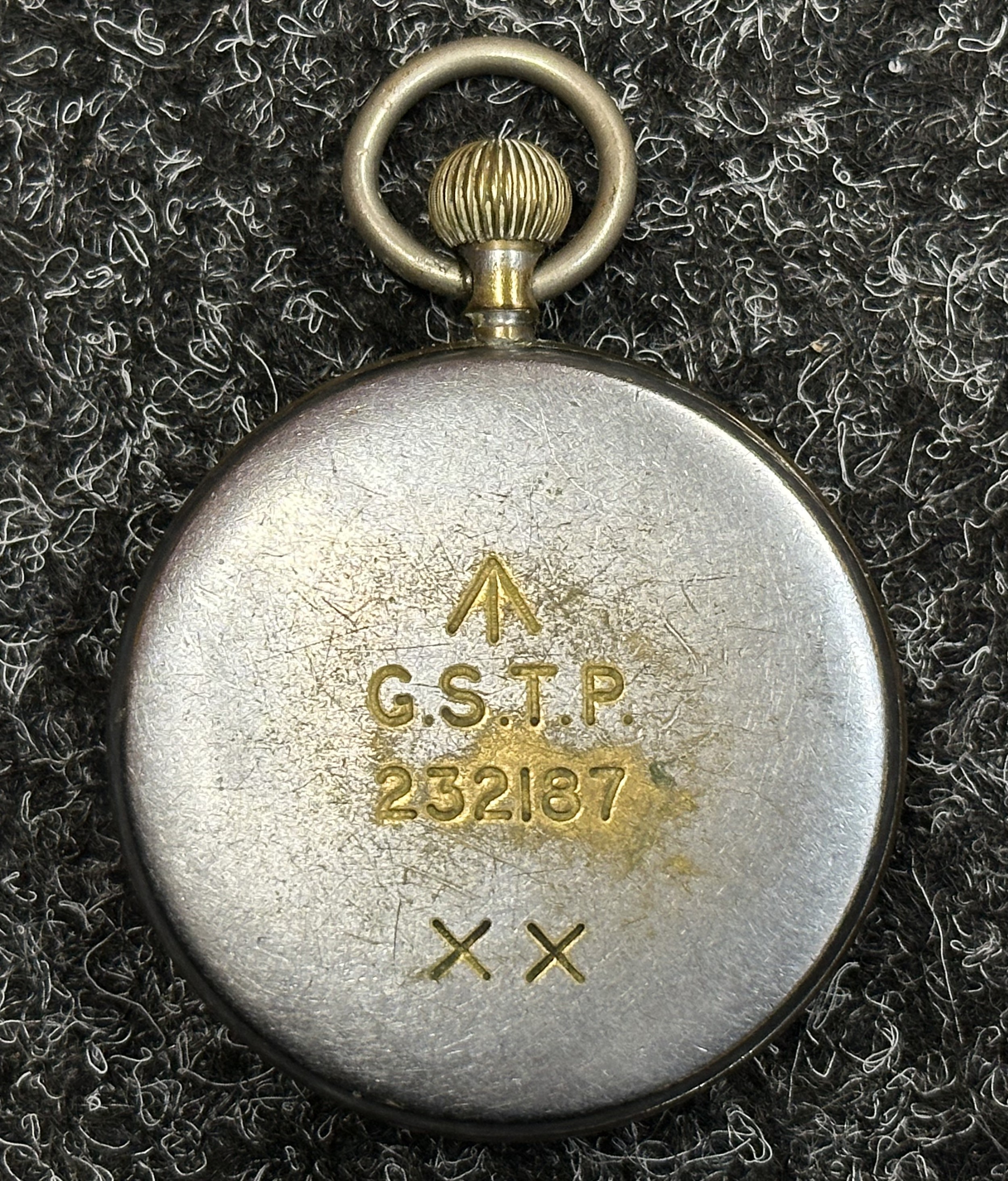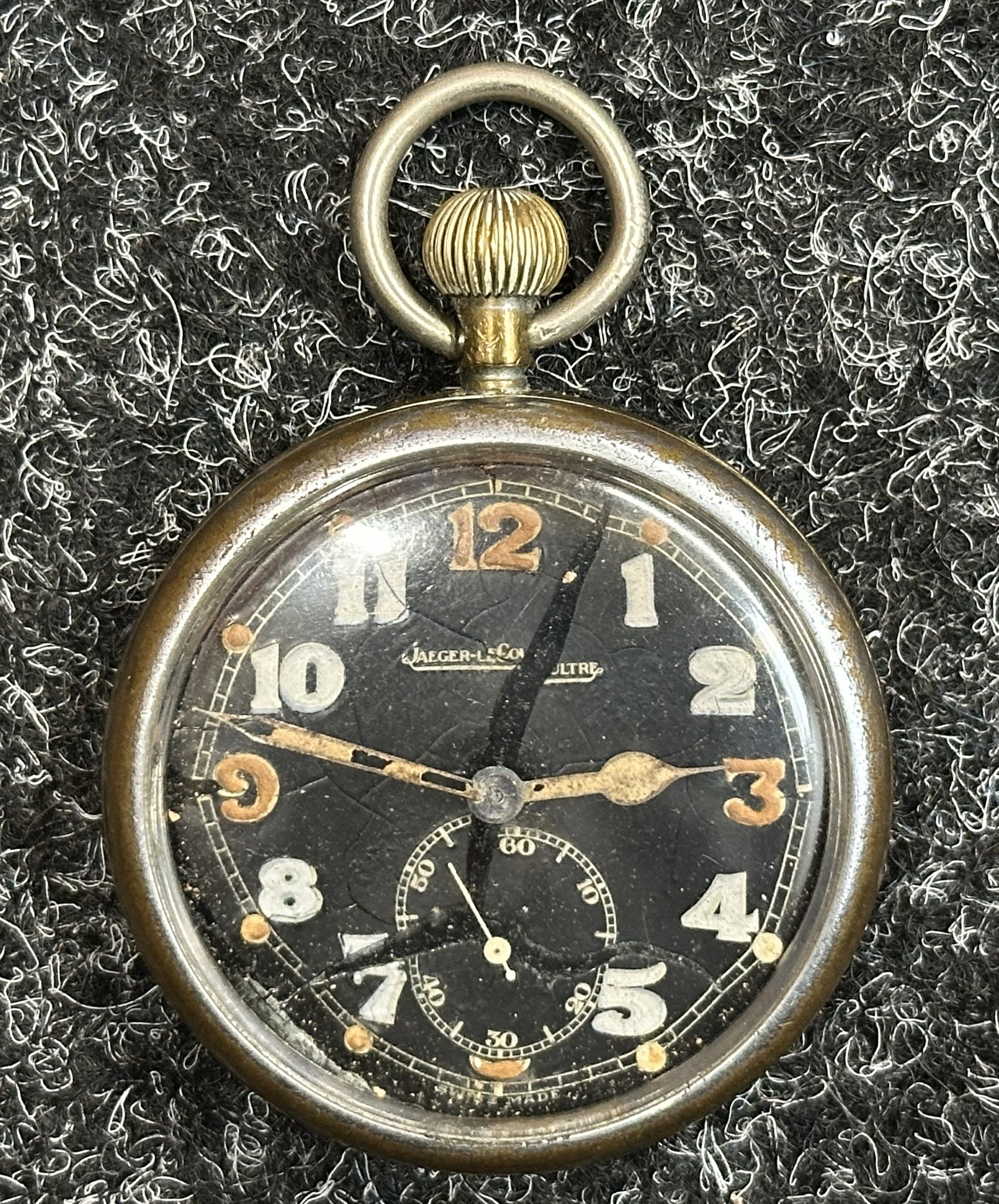 WW2 British GSTP by Jaeger le Coultre. Damaged black dial with Arabic numerals and separate seconds dial. Reverse of case marked with WD Broad Arrow along with GSTP 232187 XX. Runs and ticks, would recommend a clean and service.