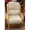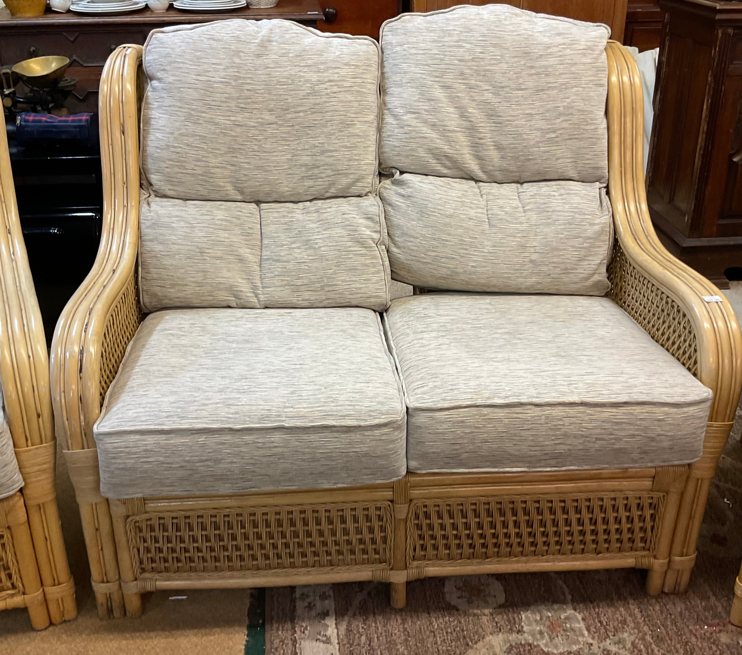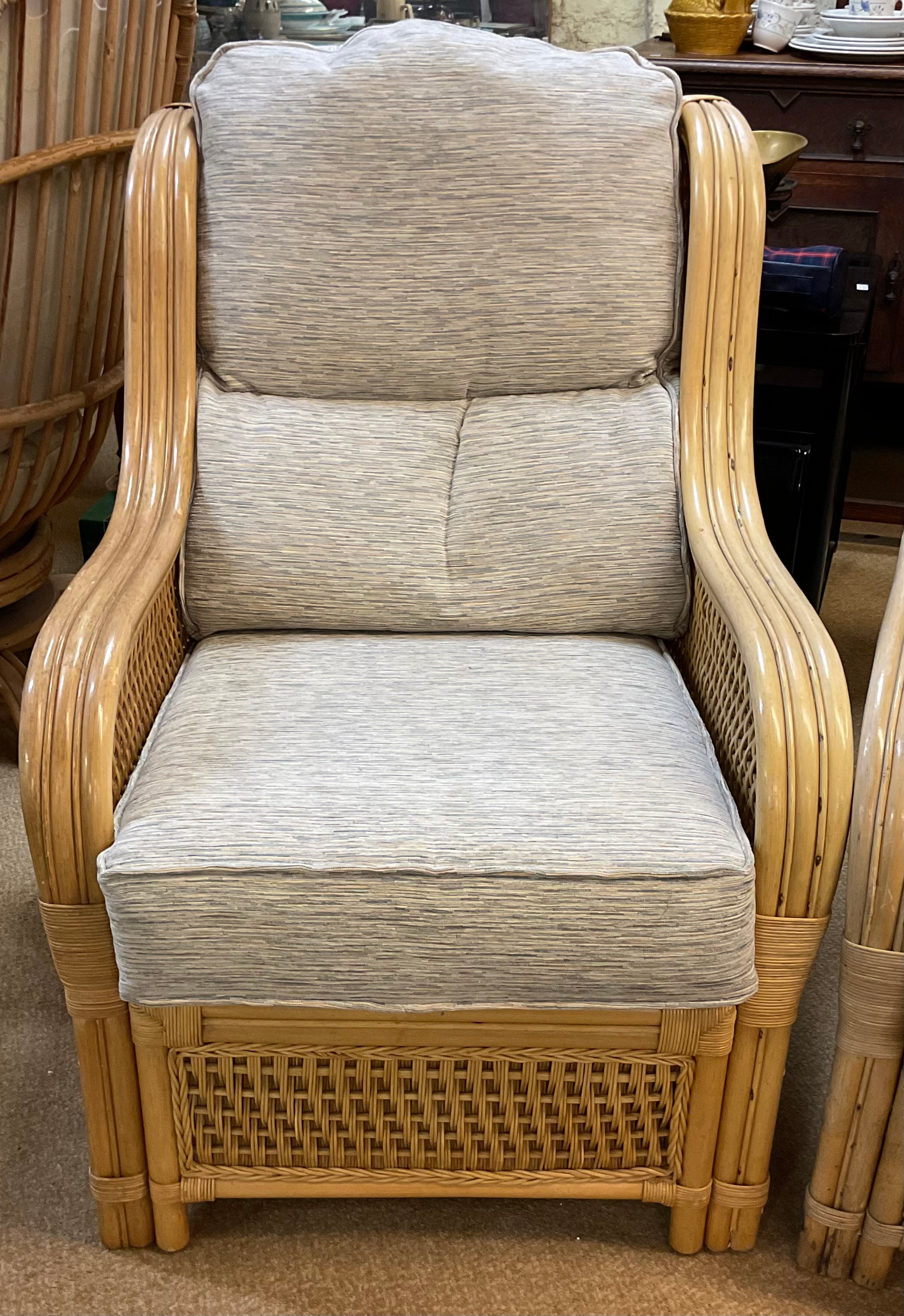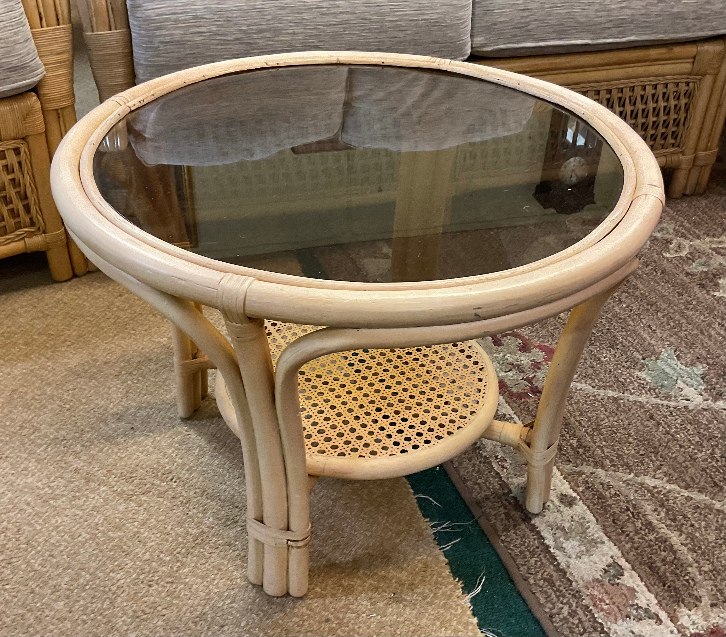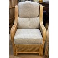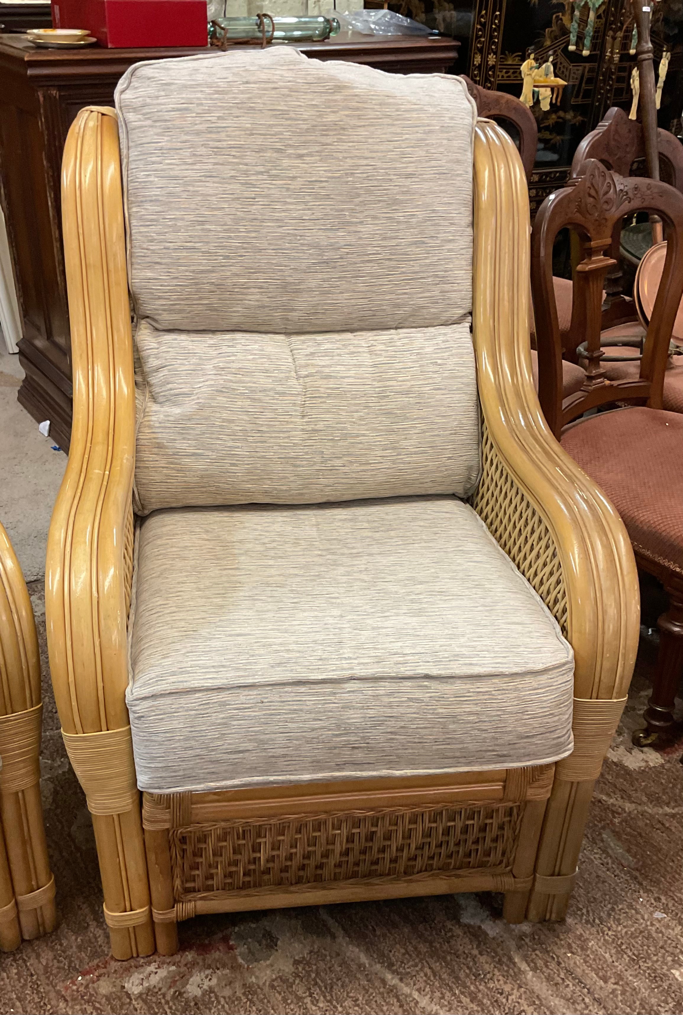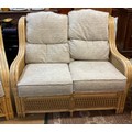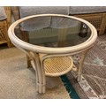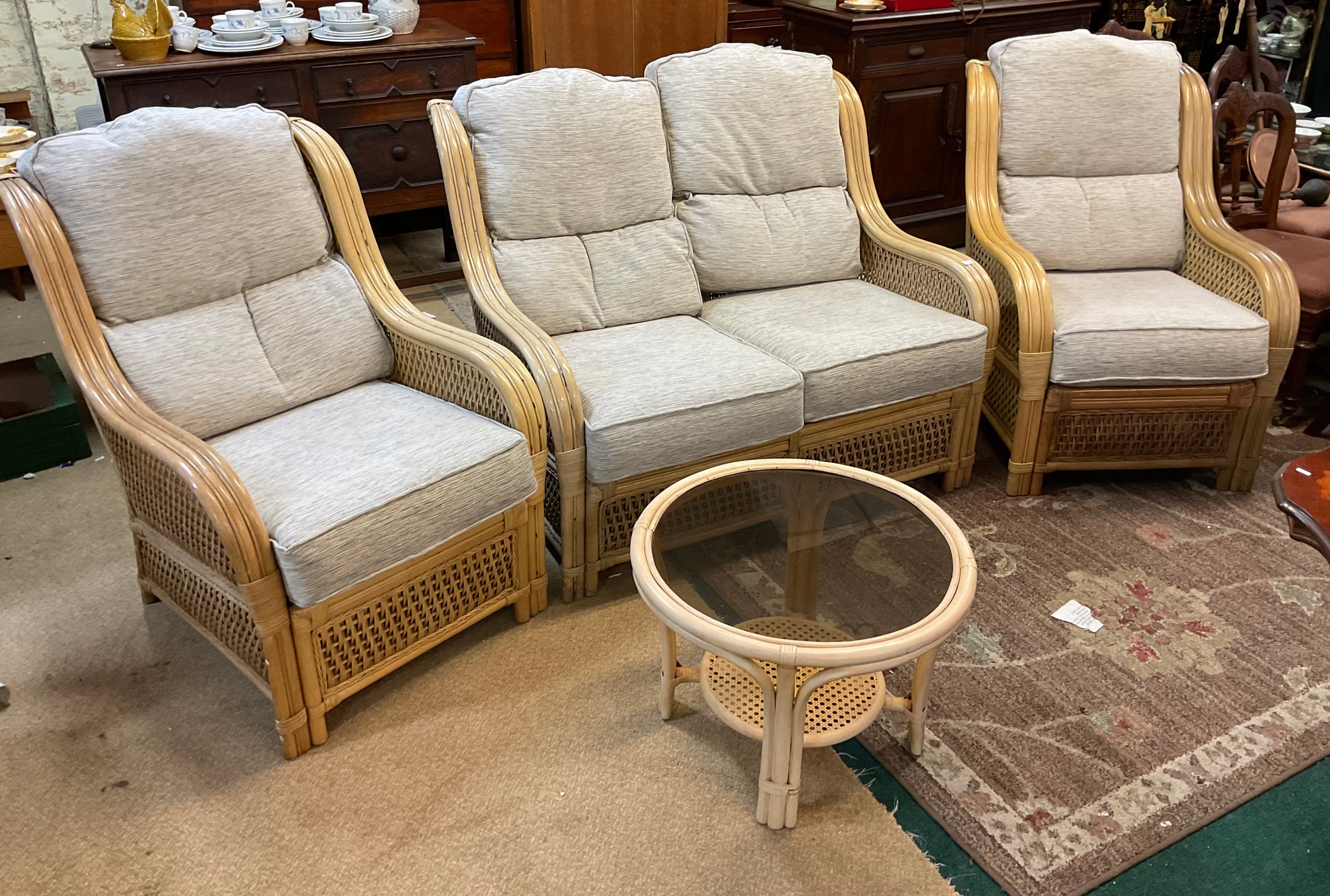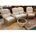 A YELLOW CANE CONSERVATORY SUITE, CONSISTING OF TWO ARMCHAIRS AND A TWO SEATER SOFA, WITH UPHOLSTERED BLUE AND BEIGE PATTERNED REMOVABLE CUSHIONS, TOGETHER WITH A MATCHING ROUND CANE GLASS TOPPED COFFEE TABLE - CHAIRS APPROX 101.CM.H X 66.CM.W X 71.CM.D, SOFA APPROX 99.CM.H X 119.CM.W X 71.CM.D