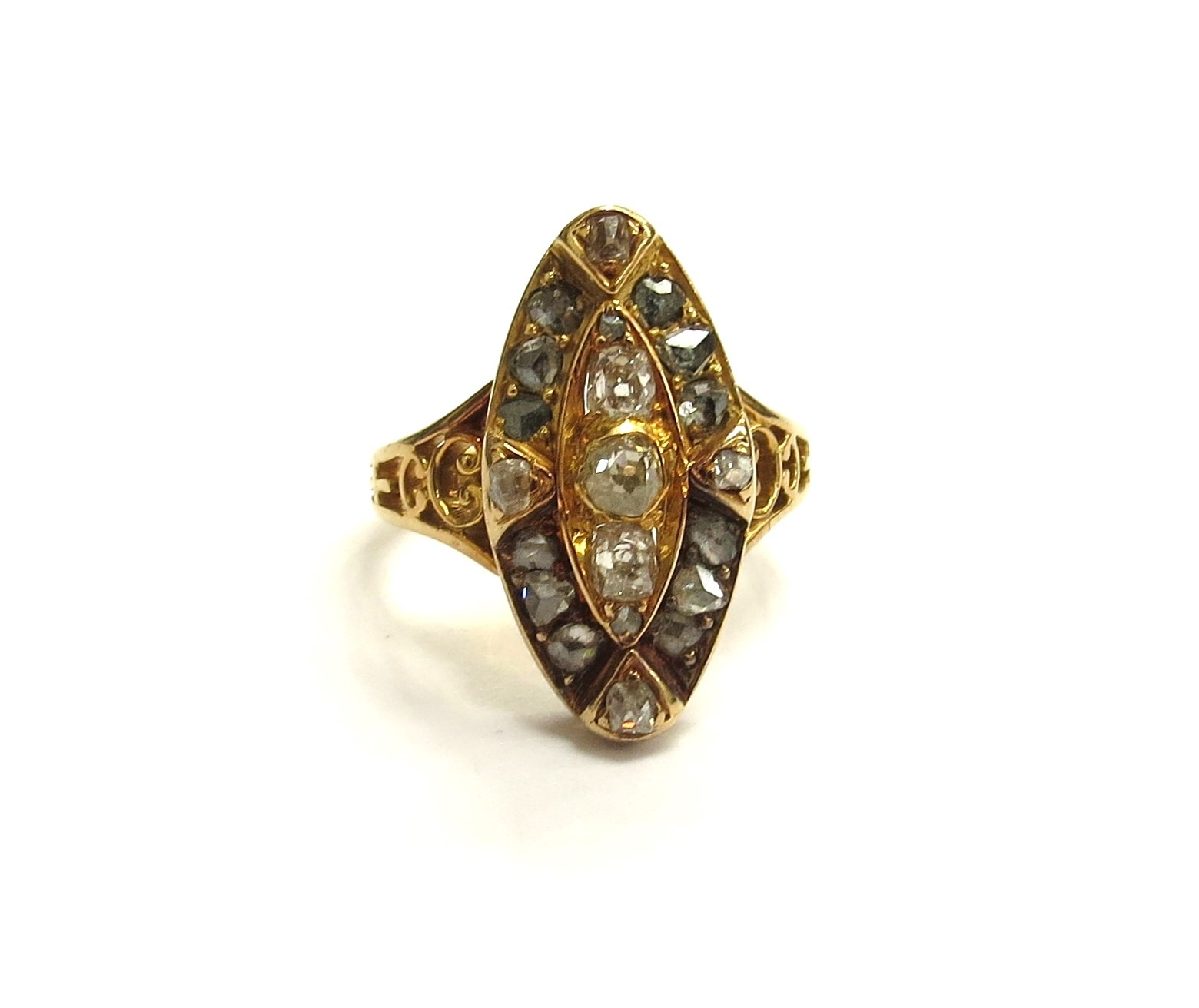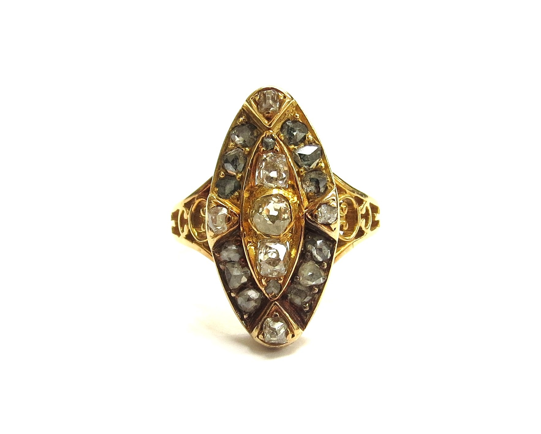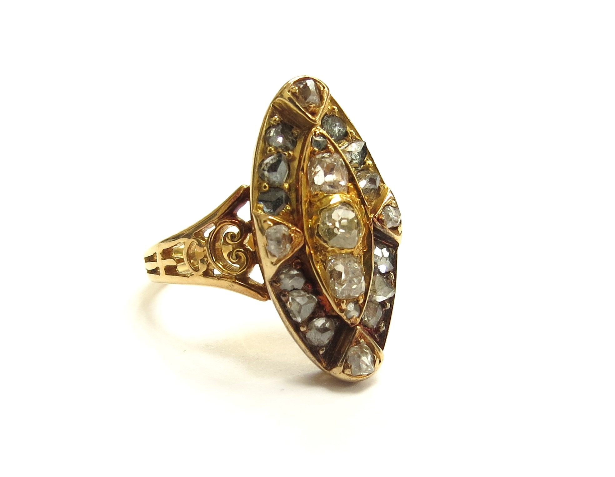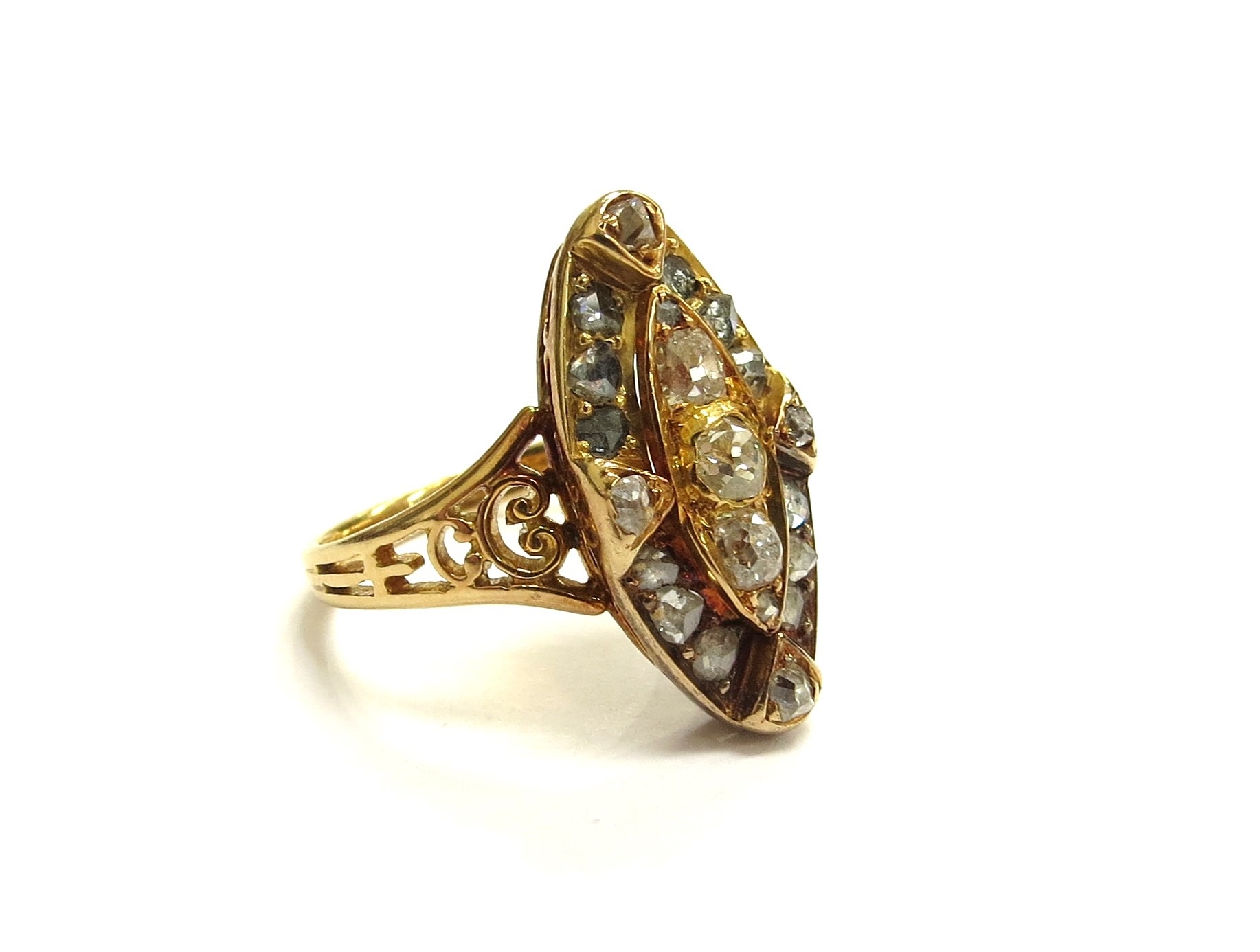 An old cut diamond marquise shaped diamond ring, unmarked gold shank. Size 5.3g