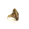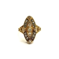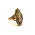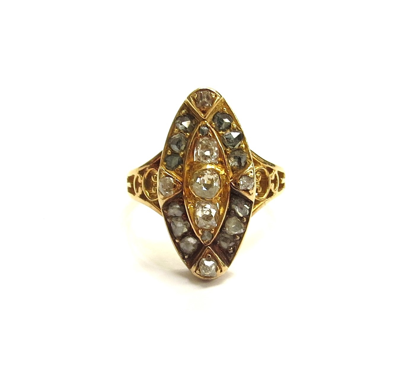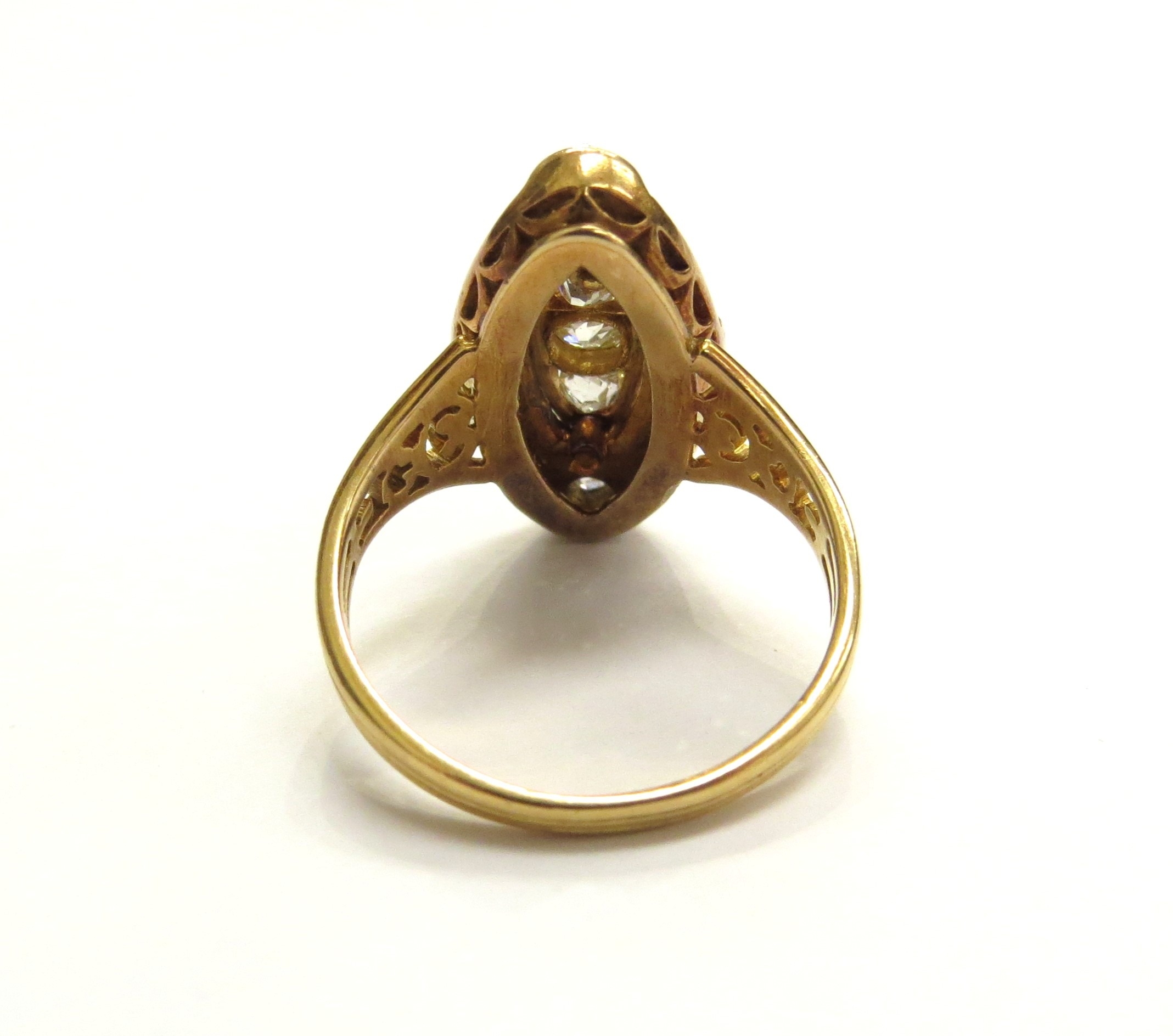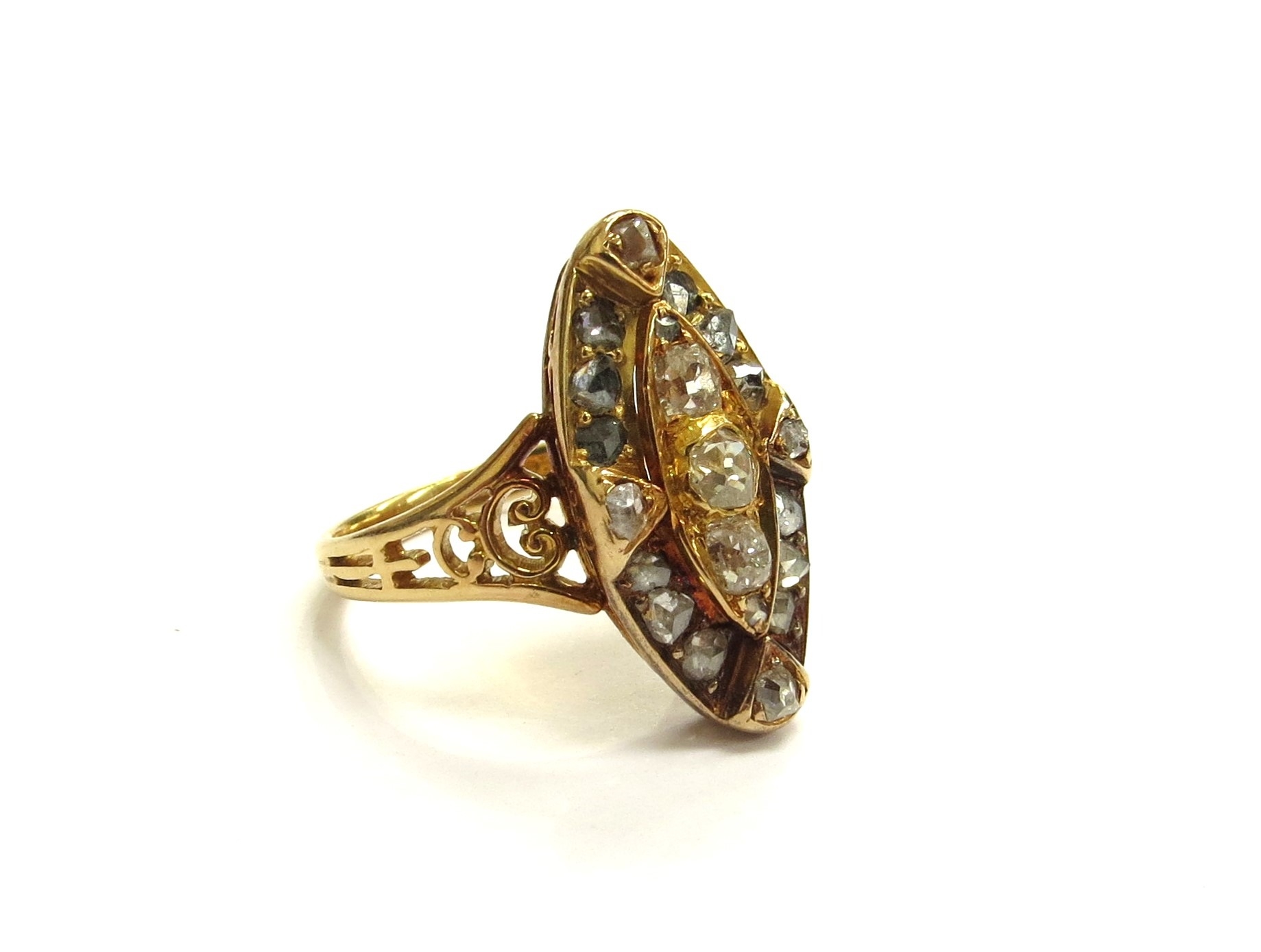 An old cut diamond marquise shaped diamond ring, unmarked gold shank. Size 5.3g