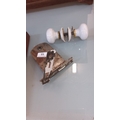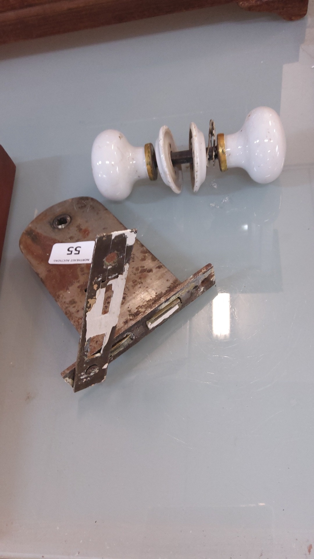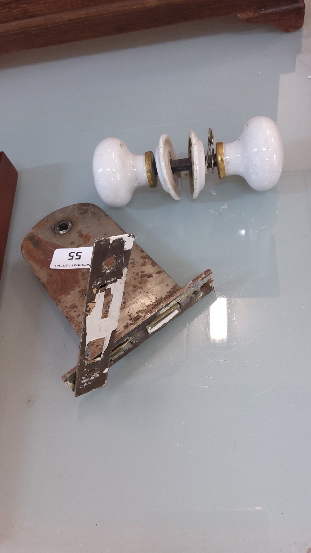 Victorian-style white ceramic door knob set with brass collars and iron spindle, accompanied by a mortice lock case with strike plate and keep, for a rim or mortice door installation.