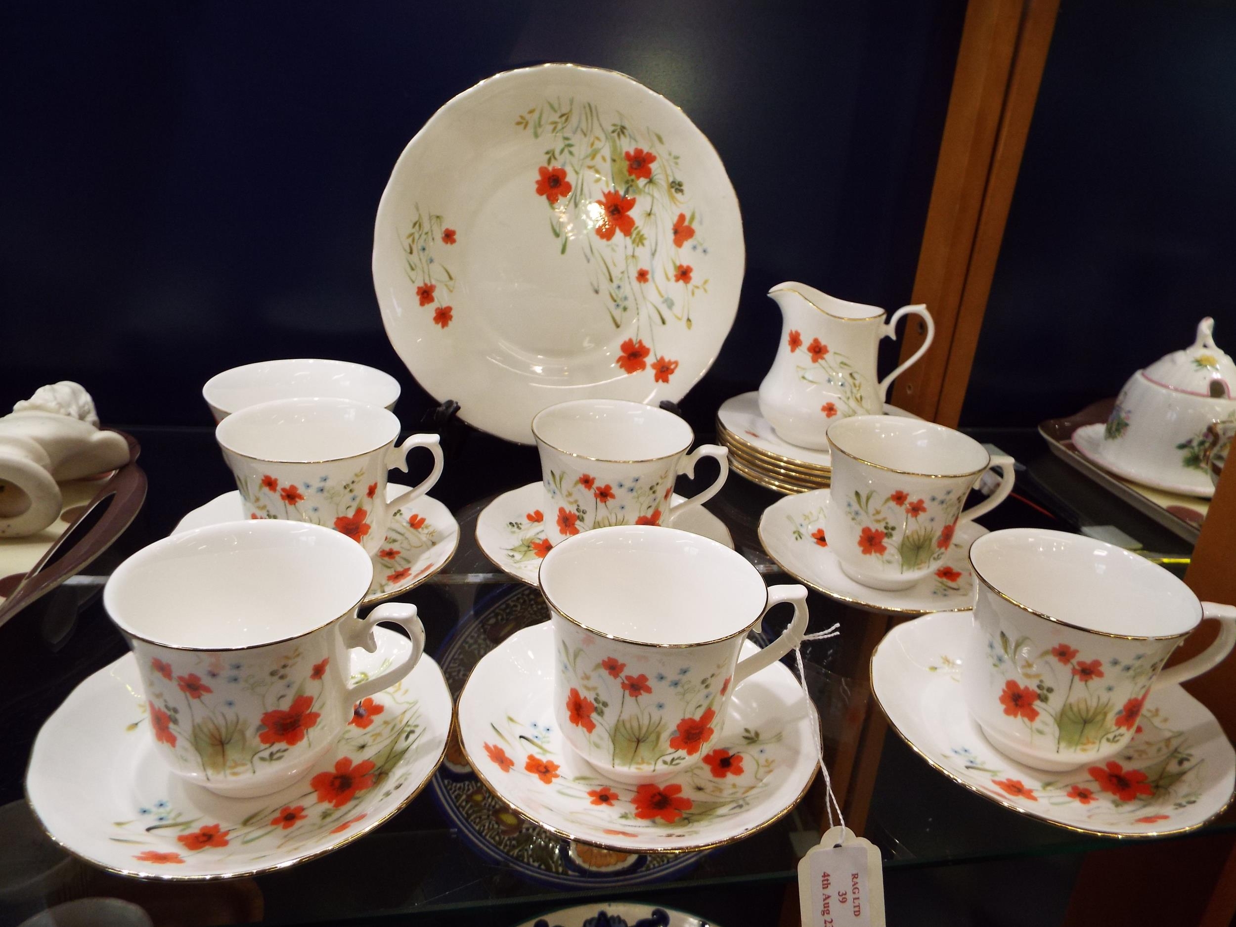 A Royal Vale poppy decorated tea-set comprising of cups, saucers, milk jug, sugar bowl, sandwich plate and cake plate