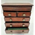 A stained pitch pine, scratch built, apprentice piece chest of drawers, two over three, with secret drawer to the top and decorative metal knobs, h: 34cm, w: 32cm, d 14.5cm