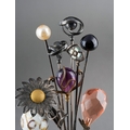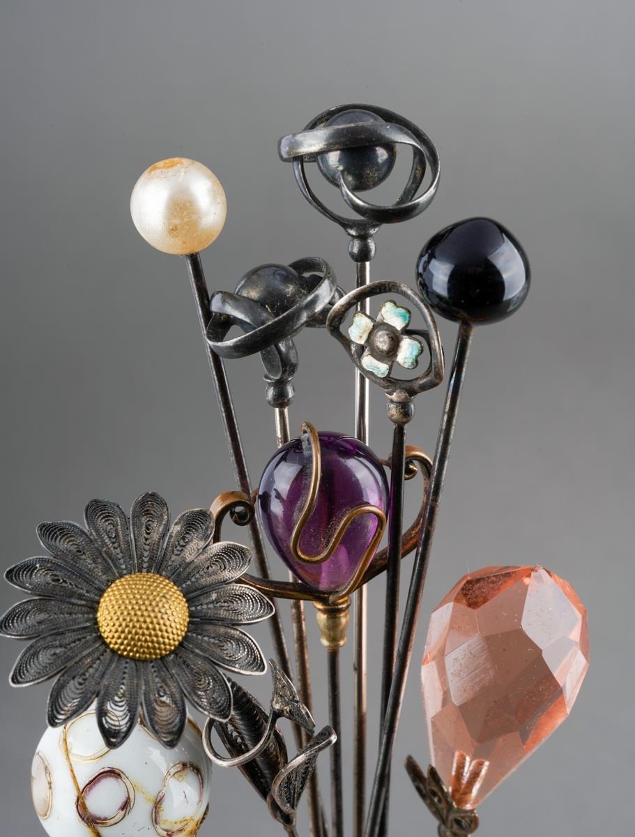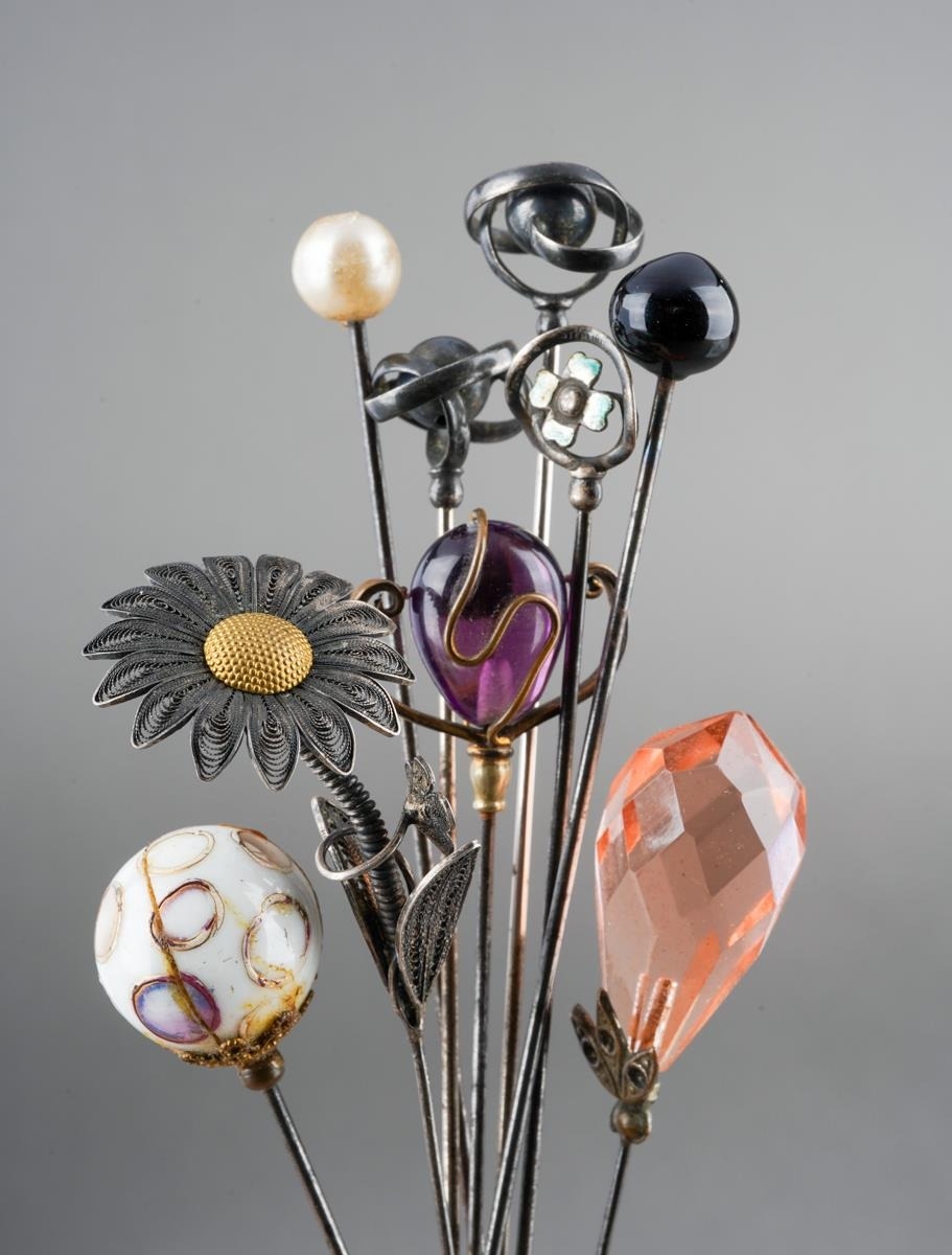 Assorted collection of hat /stick pins to include a pair of white metal with globe and twist terminals, unmarked; a vintage white metal and filigree Daisy "en Tremblant", unmarked together with further glass, faux pearl and white metal set pins [1 bag] af