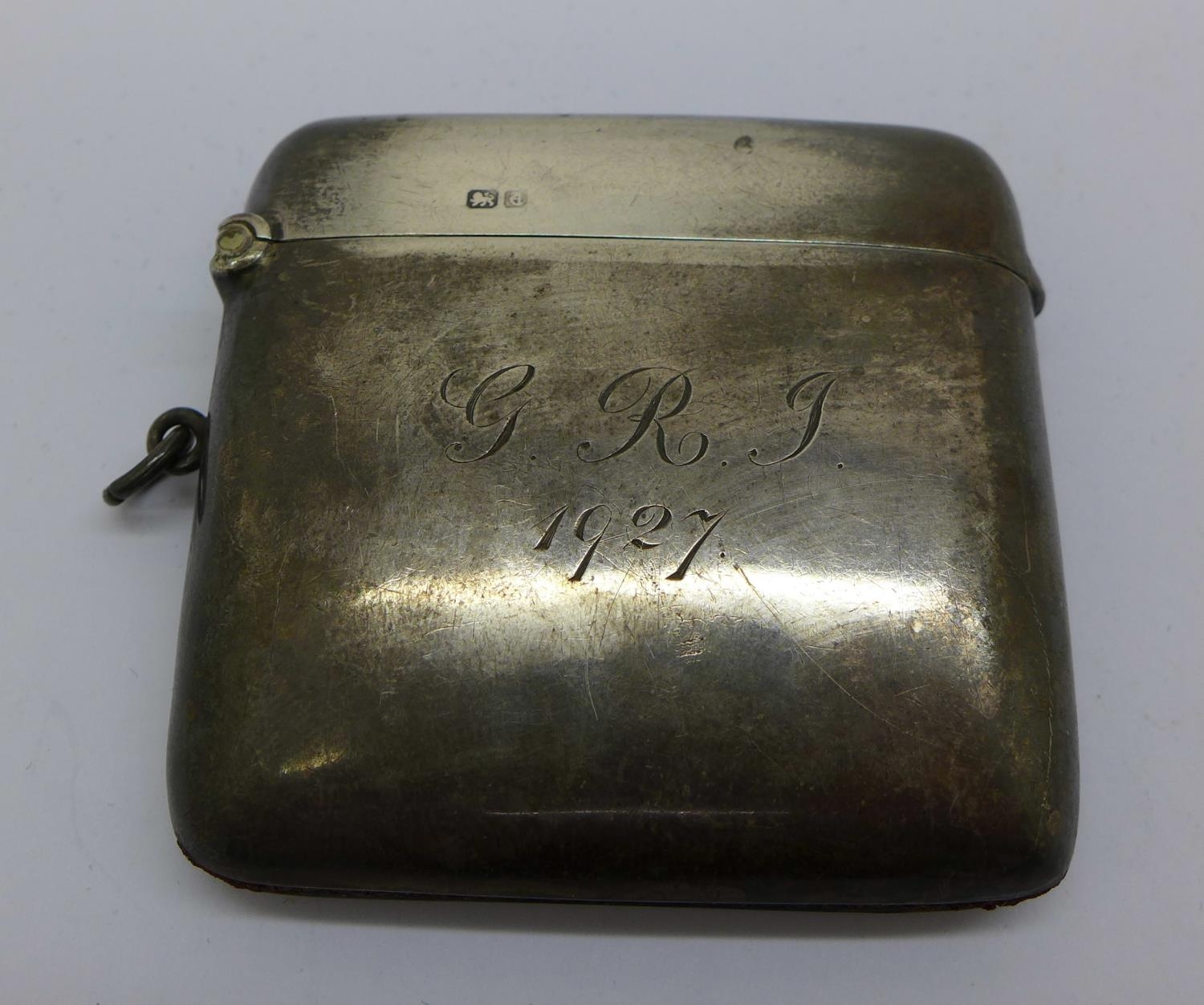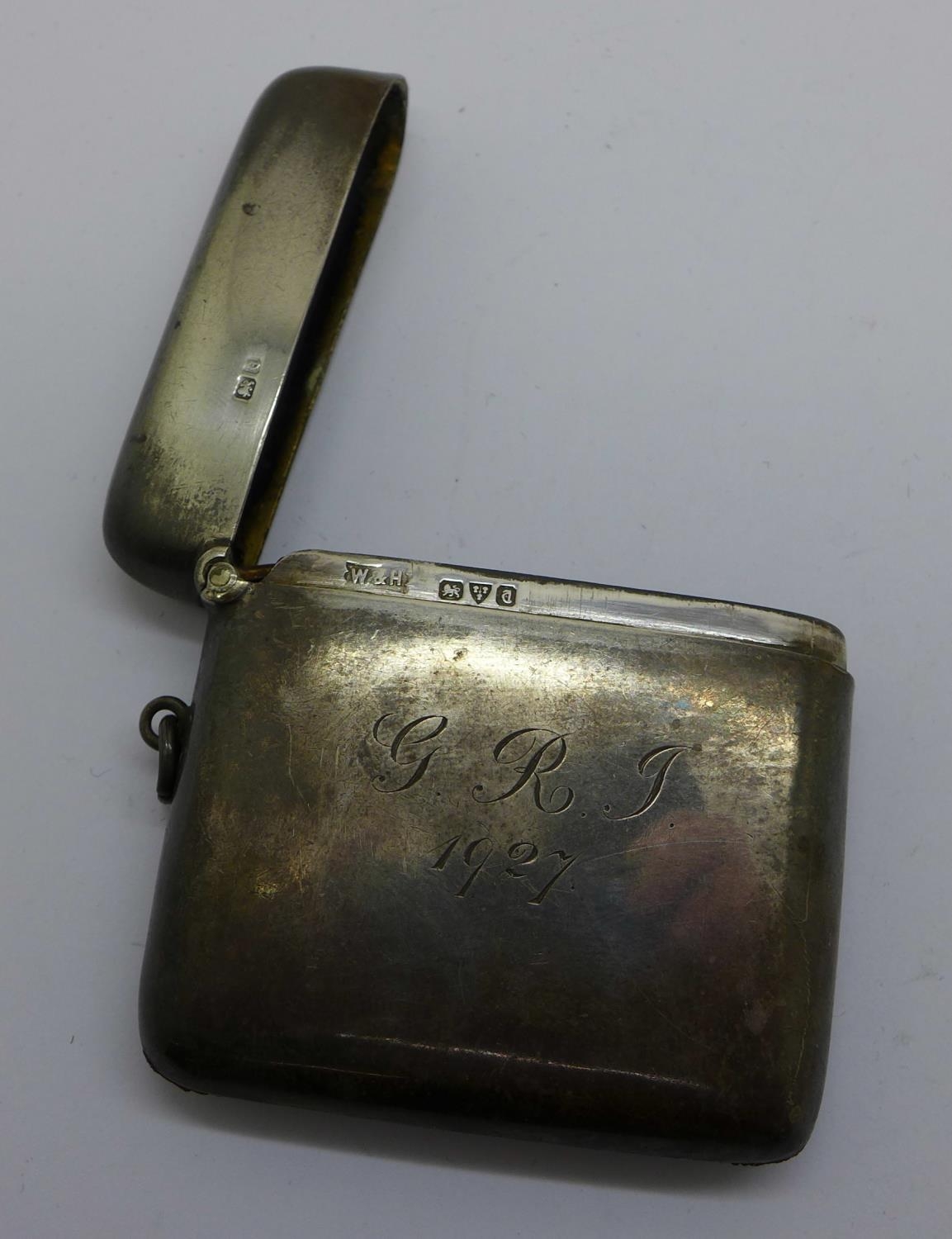 A large silver vesta case by Walker & Hall, with inscription dated 1927, 53g