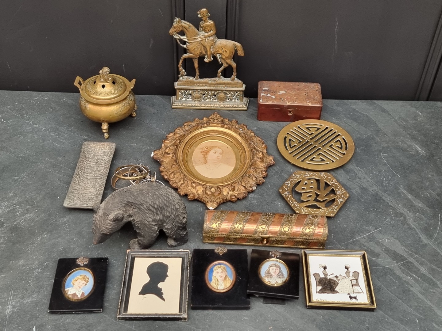 A mixed lot, to include: metalware; portrait miniatures; a Black Forest bear; etc.