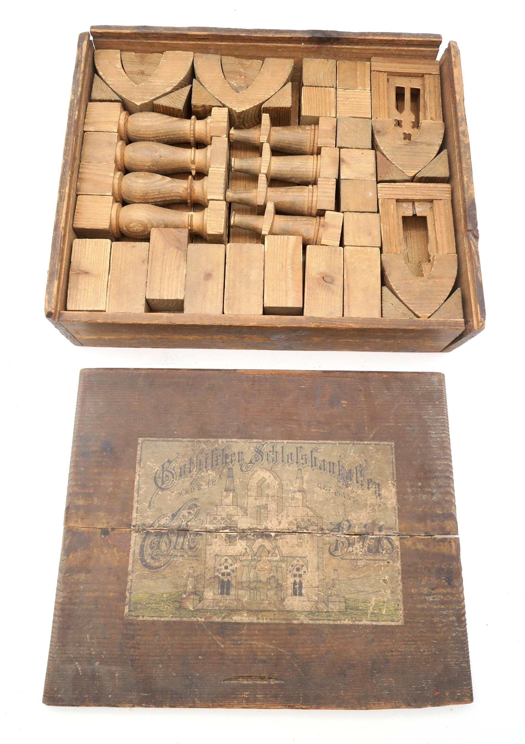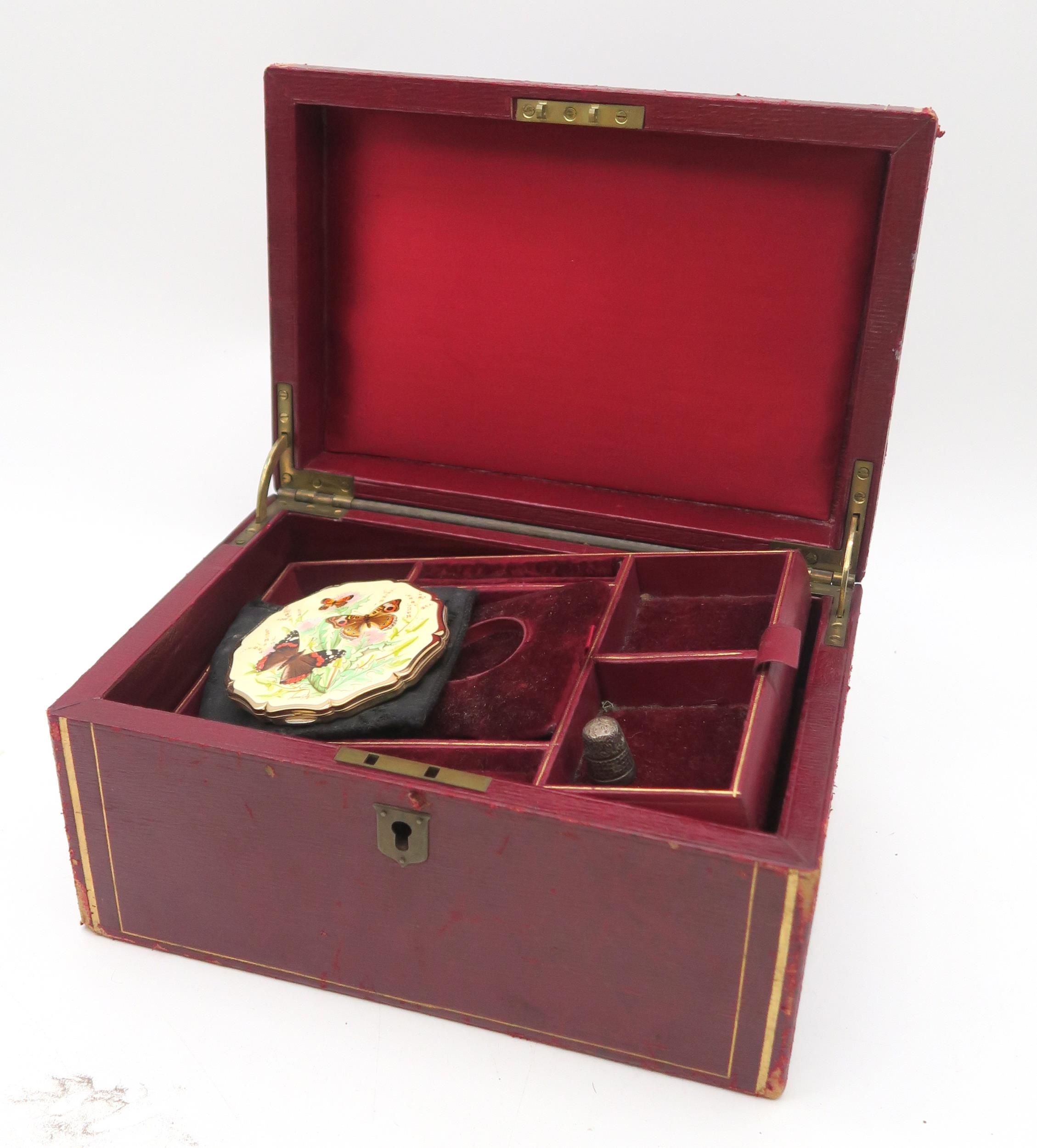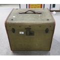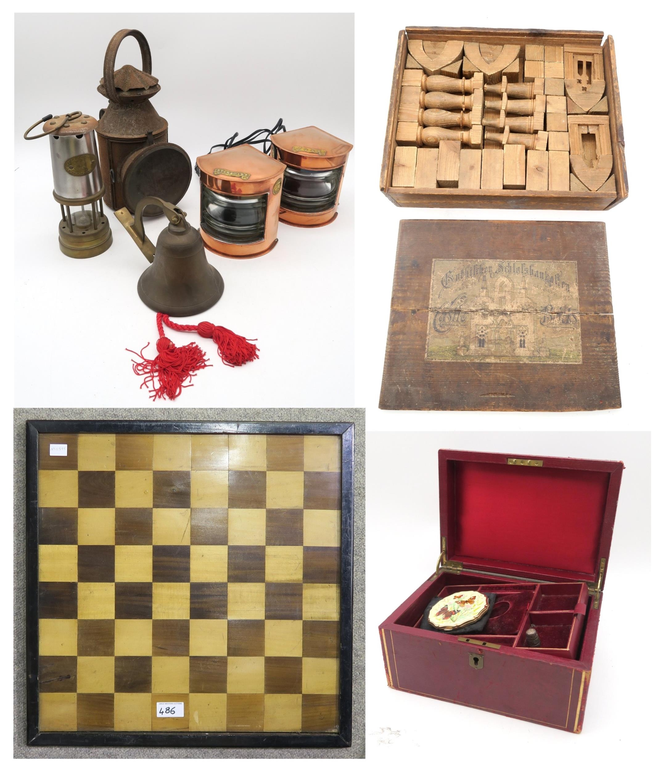 A pair of small copper and brass ship's Port and Starboard lanterns by Buchan Supply Stores, Peterhead; together with a miner's Davy-type lamp, a further lantern in rusted condition, a brass bell, a red leather jewellery box containing powder compact, silver thimble etc. and a set of German wooden architectural building blocks, chess board etc.; all contained in a small green canvas trunk