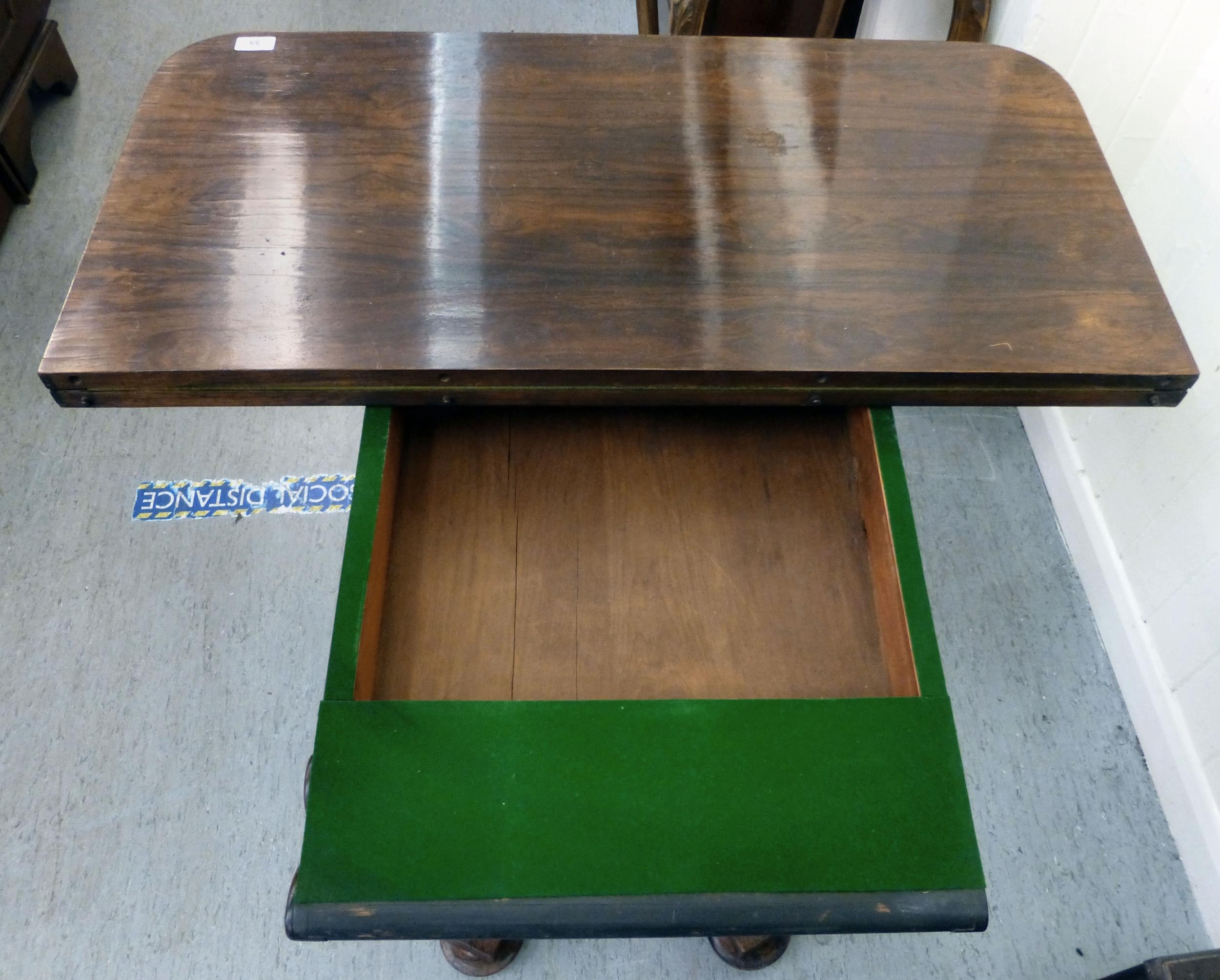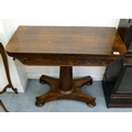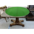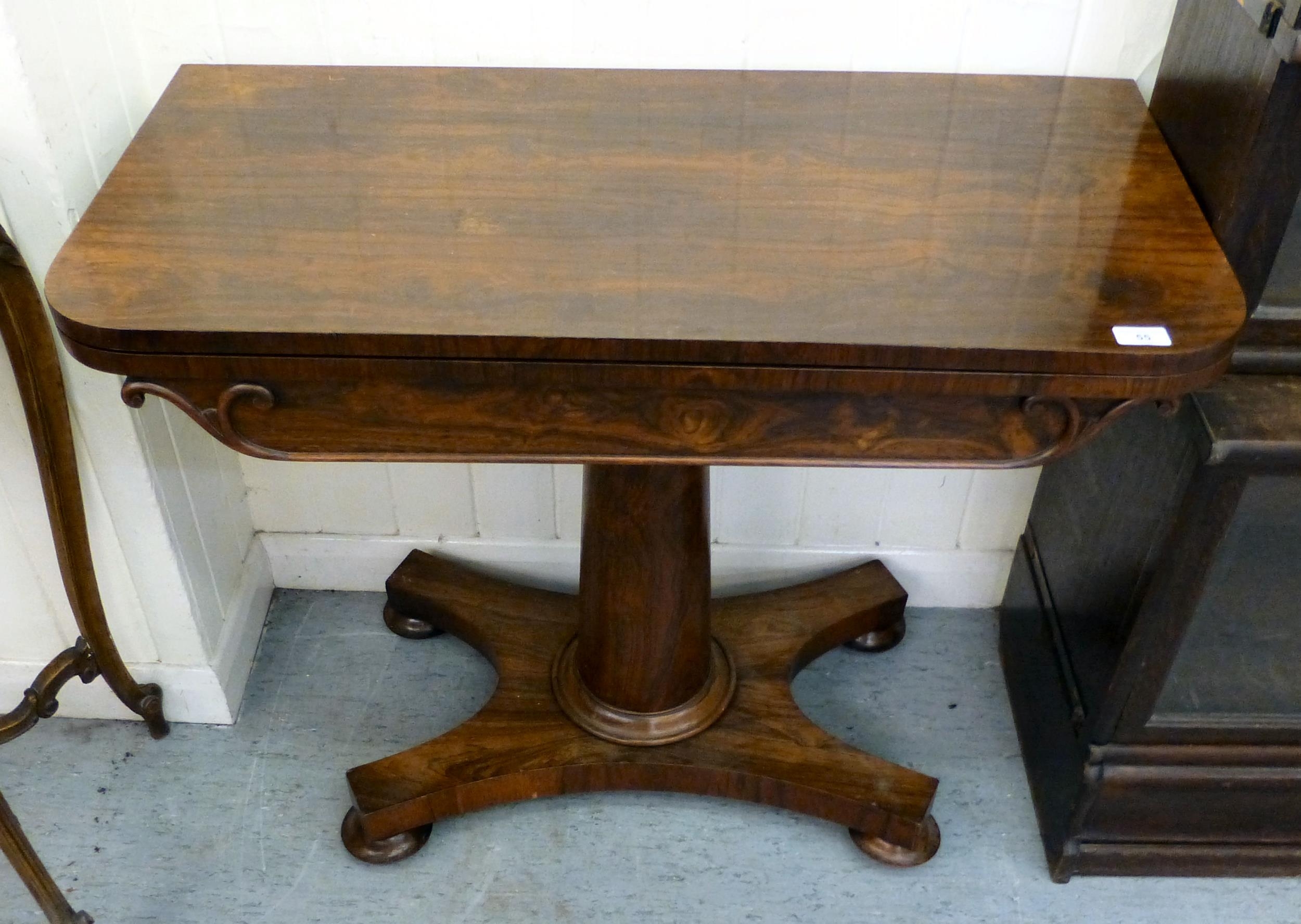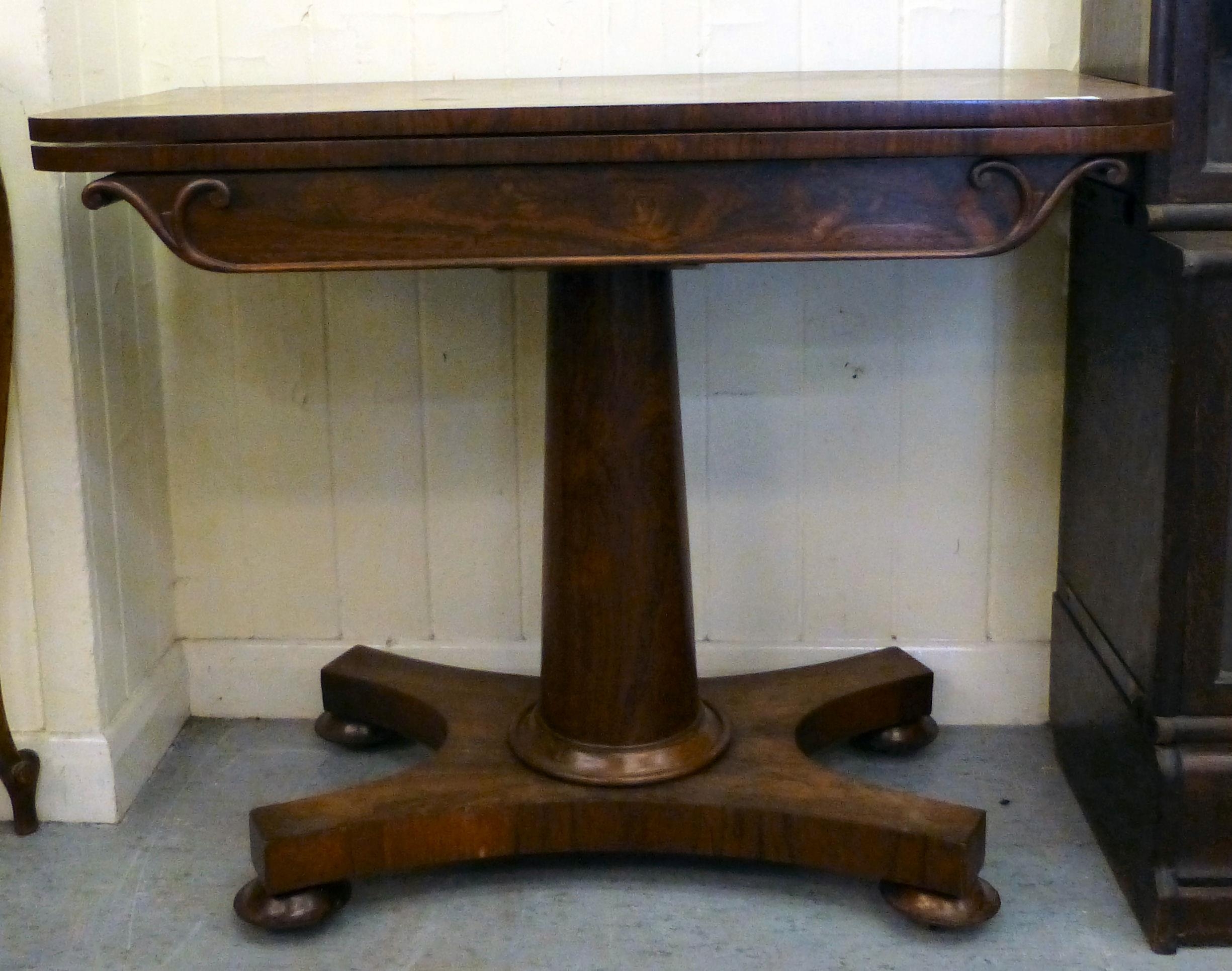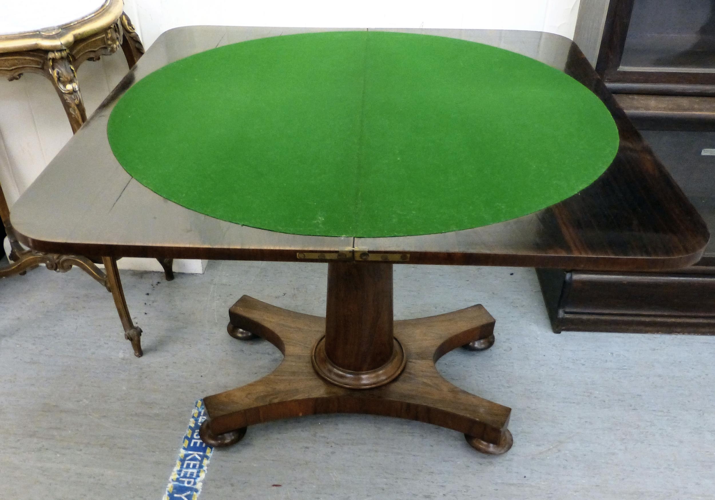 A William IV rosewood card table, the foldover top enclosing a baize lined interior, raised on a quatrefoil pedestal base 28"h 36"w