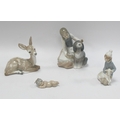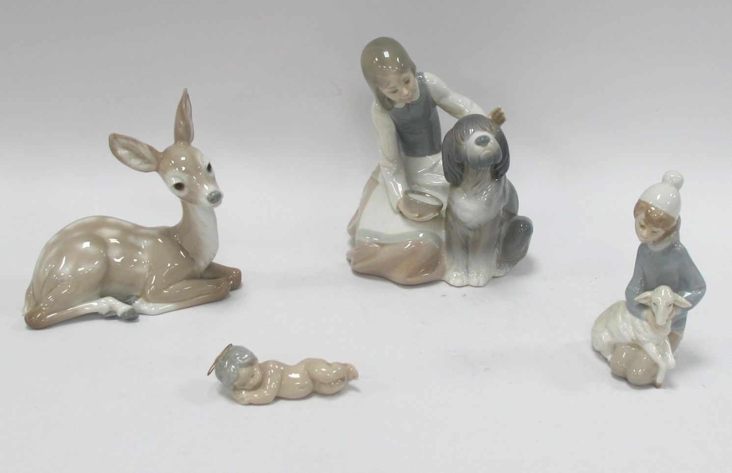 Lladro Figure Group of a Girl Holding a Bowl of Milk With Dog, another of a seated fawn, boy with lamb and churub (4).