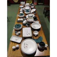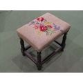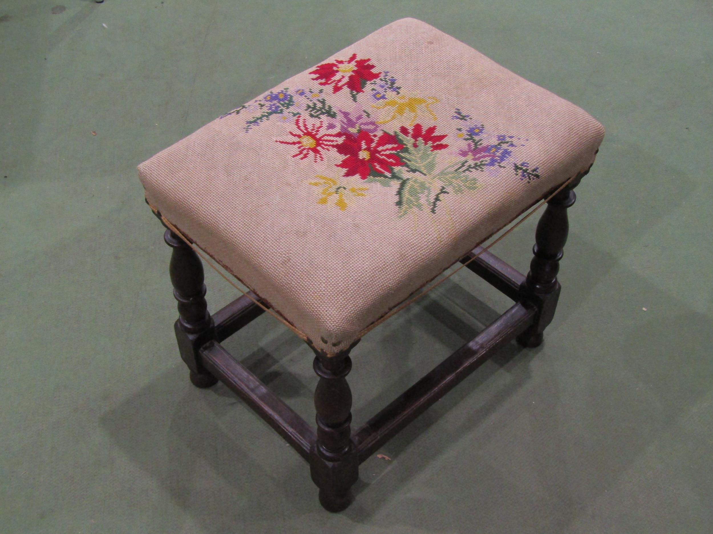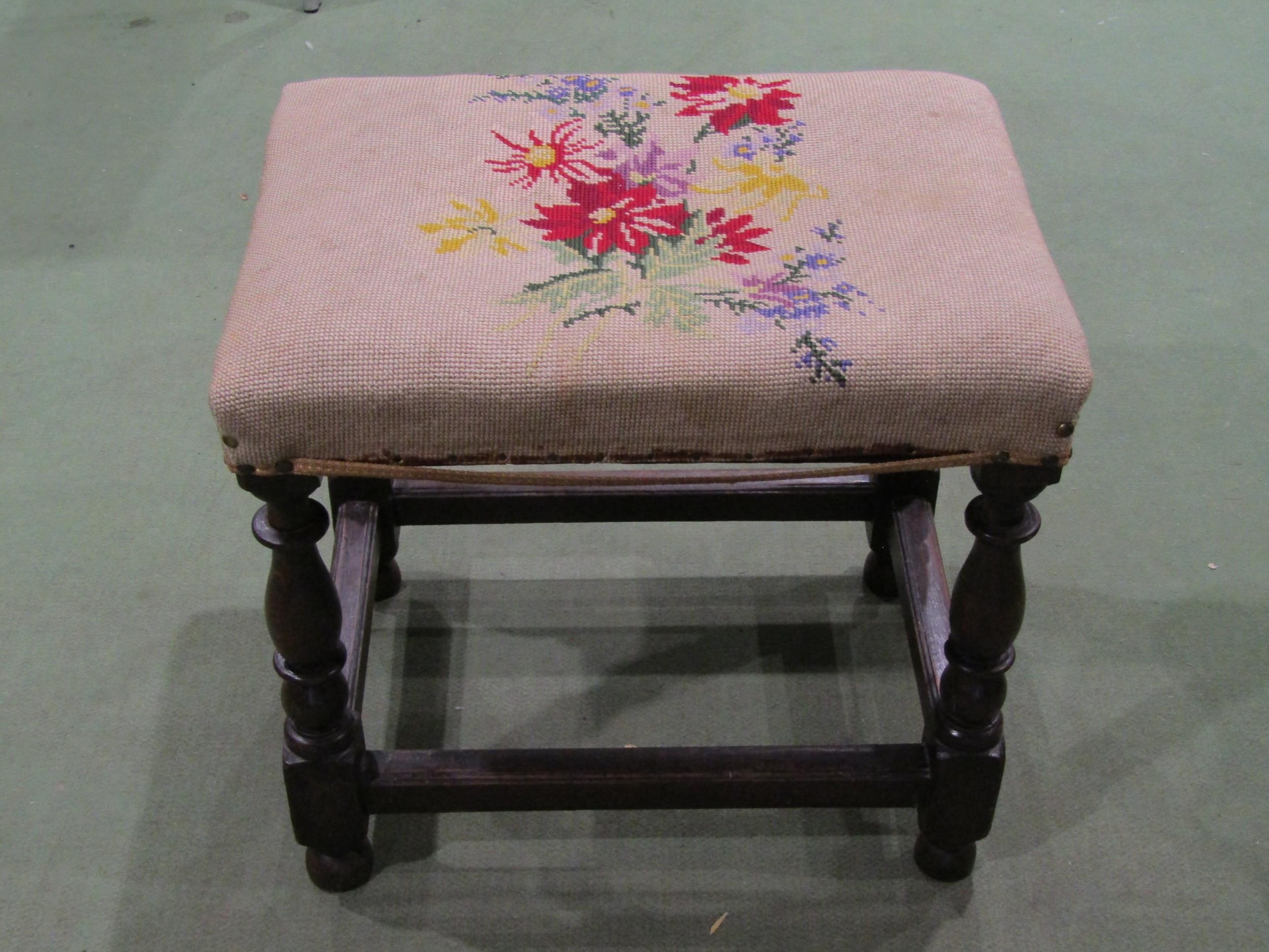 A late 19th Century oak footstool, needlepoint upholstery, turned supports joined by stretchers