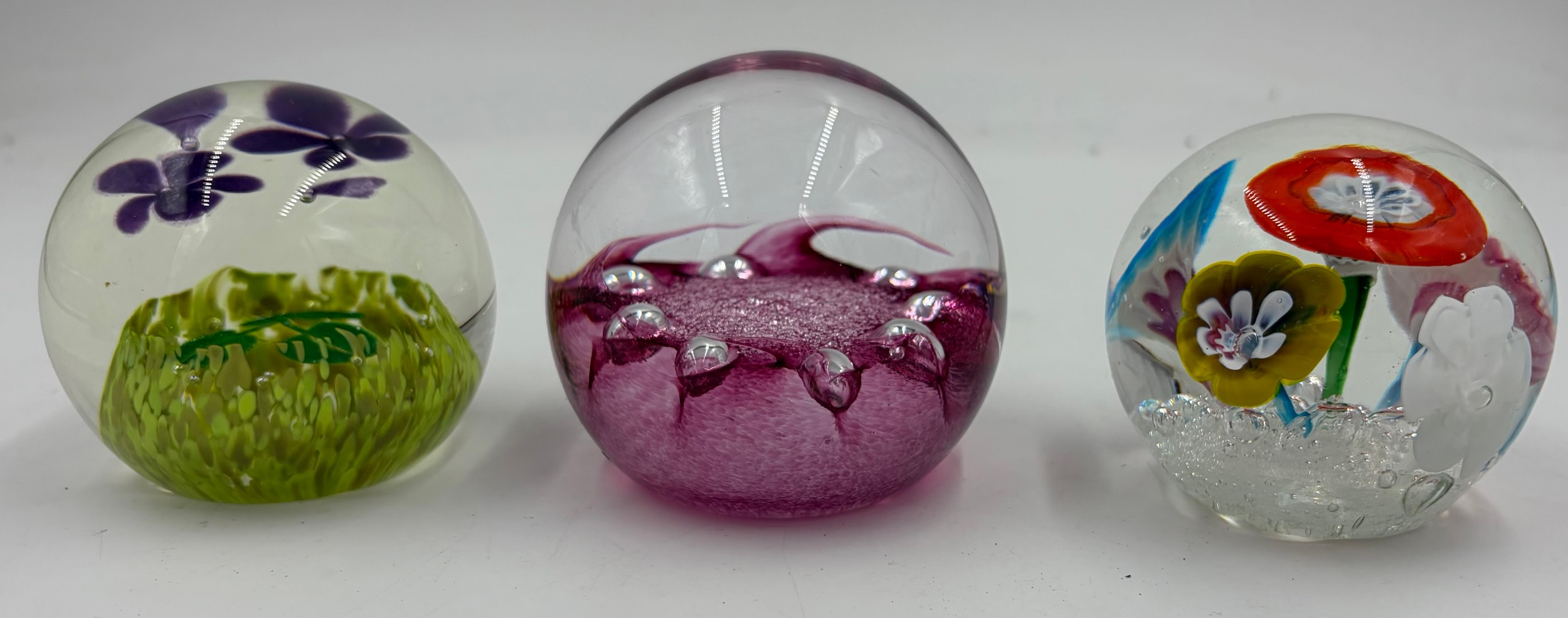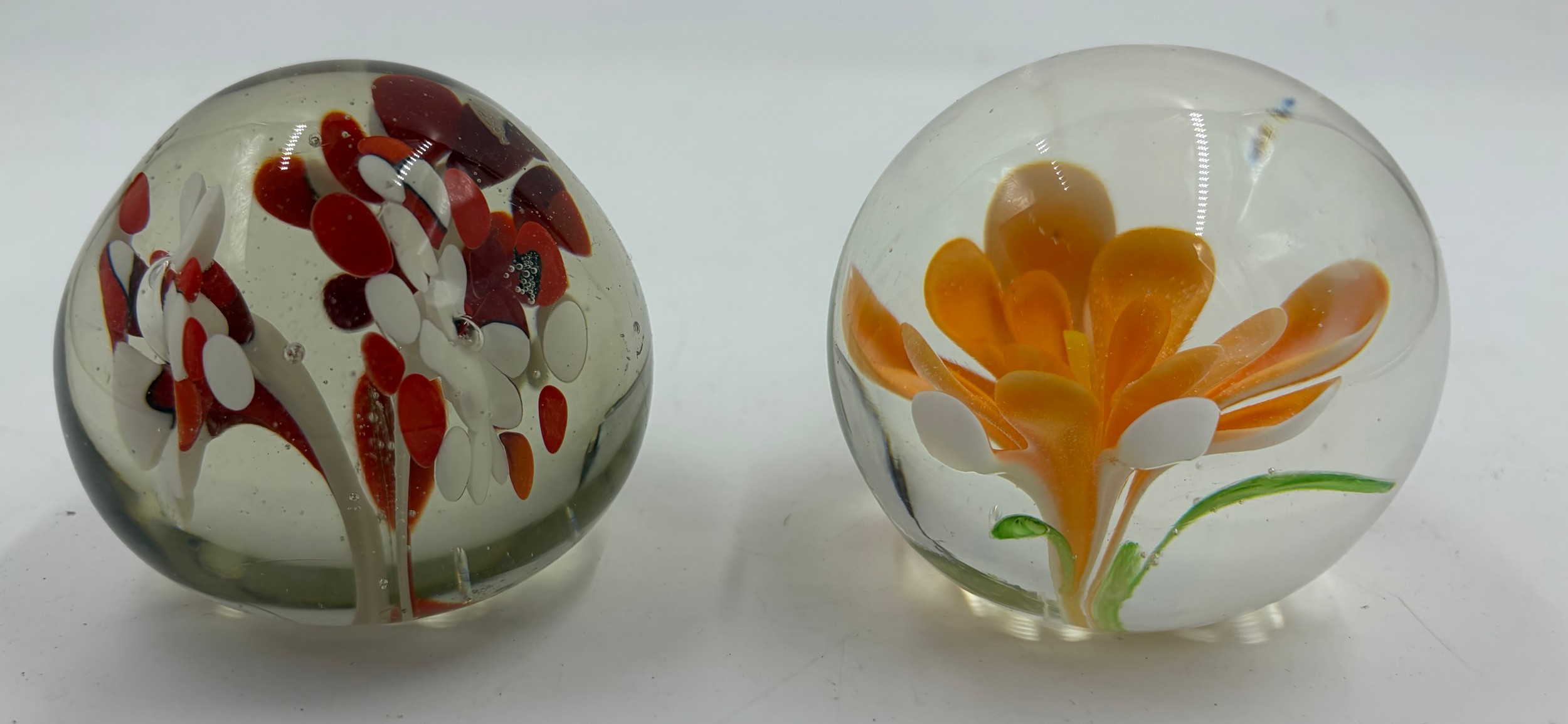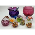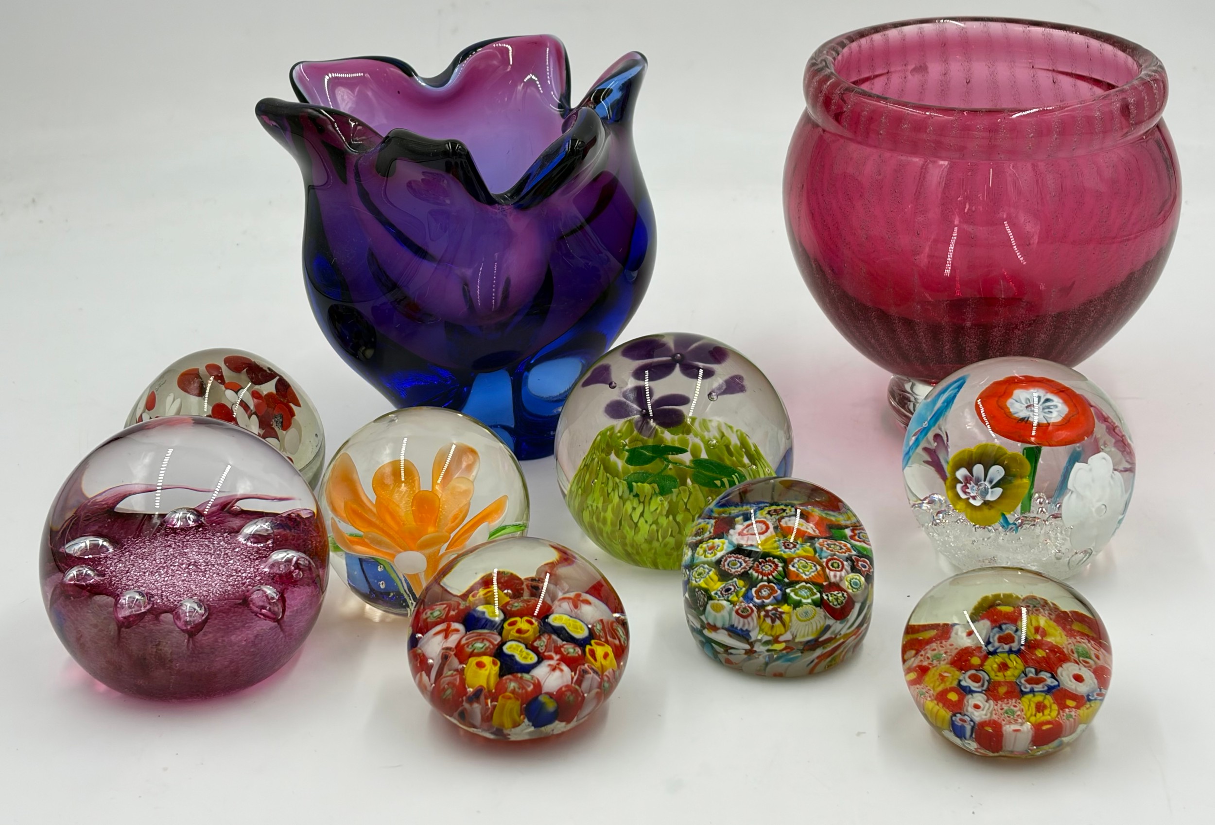 Vintage glass to include eight paperweights, one marked Caithness Wild flower collection together with two vases.
