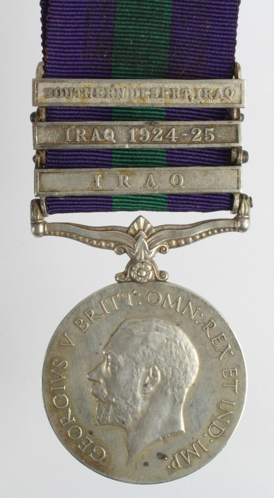 GSM GV bars Iraq, Iraq 1924-25 and Southern Desert Iraq a most unusual combination, named to 16148 O'Seer F.P.Gunatilaka Works DTE. An Overseer in the Works Department, possibly Building Works which might explain the combination, but we offer as seen / viewed, not verified.