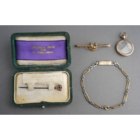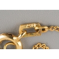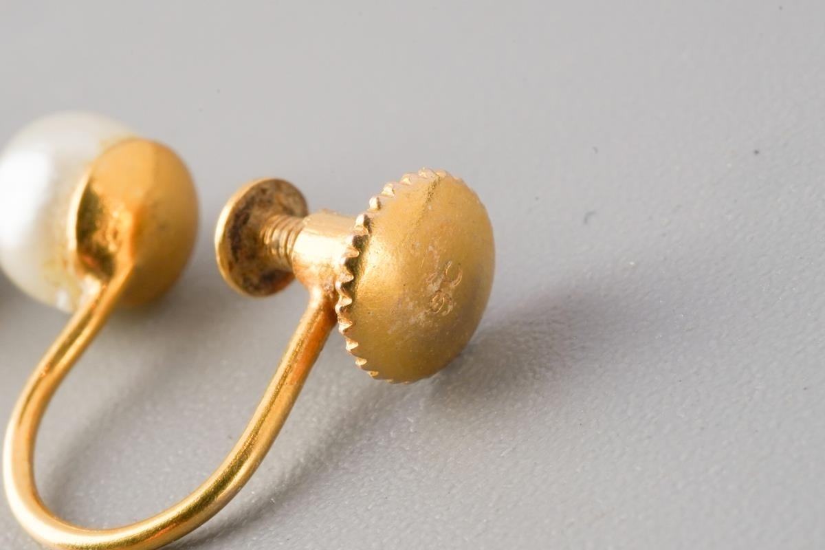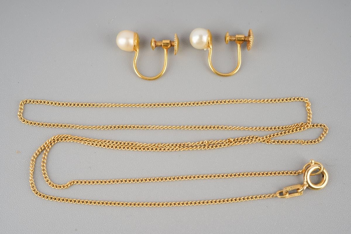 A chain and pair of cultured pearl earrings. To include a flat curb link chain, together with a pair of cultured pearl earrings, with screw thread fittings for non pierced ears, chain stamped AD otherwise unmarked (assessed as gold plated), earring backs stamped 9c, approx length chain 440mm, approx gross weight of earrings 1.25 grams, earrings and chain approx gross weight 2.31 grams.