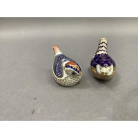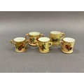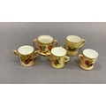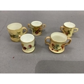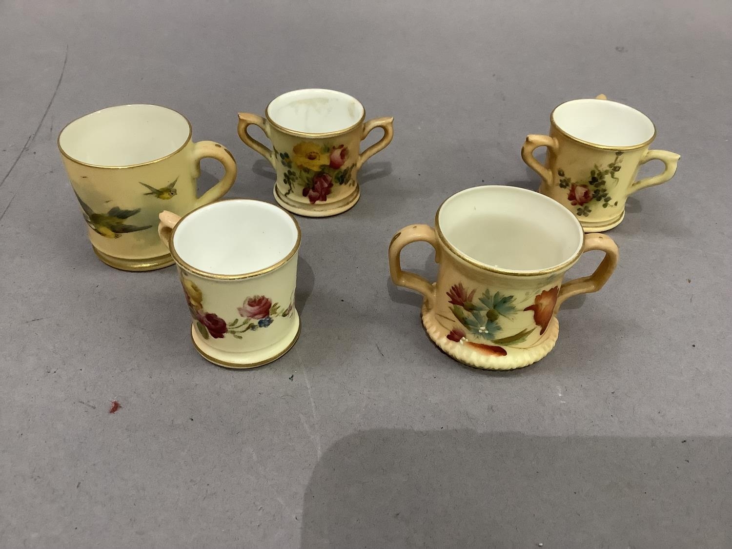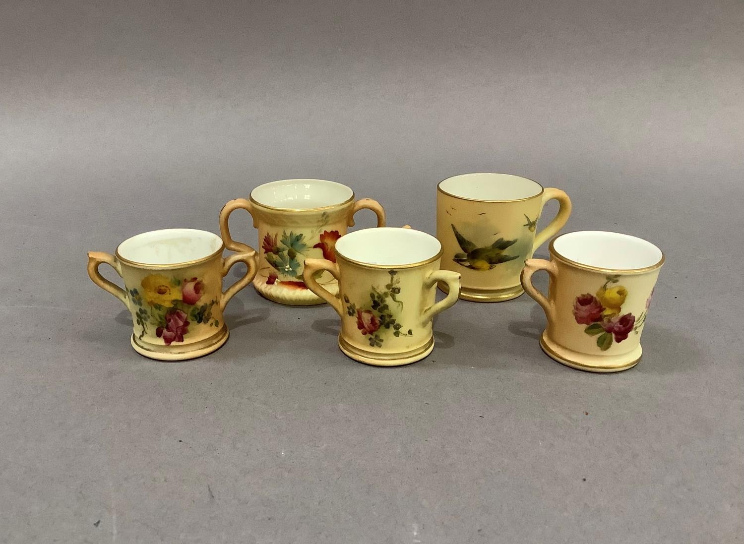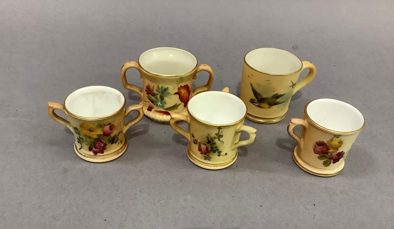 A Royal Worcester miniature mug painted with bluetits on a shaded apricot ground, 4cm high; another printed and painted with roses and summer flowers on a shaded apricot ground, 3.5cm high, a Royal Worcester two handled tyg printed and painted with poppies and summer flowers on a shaded apricot ground, two others similar (5)